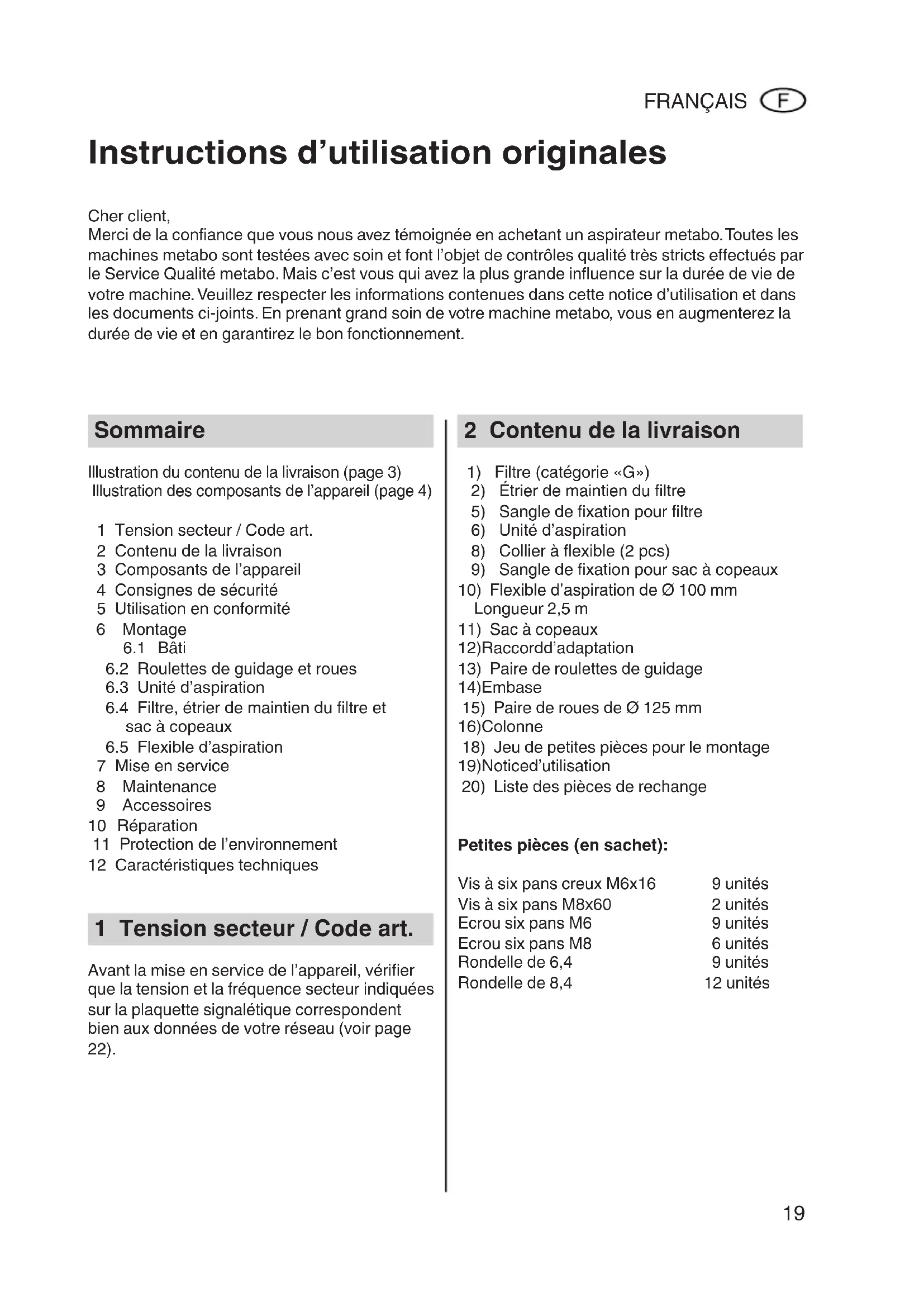 Merci de la confiance que vous nous avez témoignée en achetant un aspirateur metabo. Toutes les machines metabo sont testées avec soin et font l'objet de contrôles qualité très stricts effectués par le Service Qualité metabo. Mais c'est vous qui avez la plus grande influence sur la durée de vie de votre machine. Veuillez respecter les informations contenues dans cette notice d'utilisation et dans les documents ci-joints. En prenant grand soin de votre machine metabo, vous en augmenterez la durée de vie et en garantirez le bon fonctionnement.