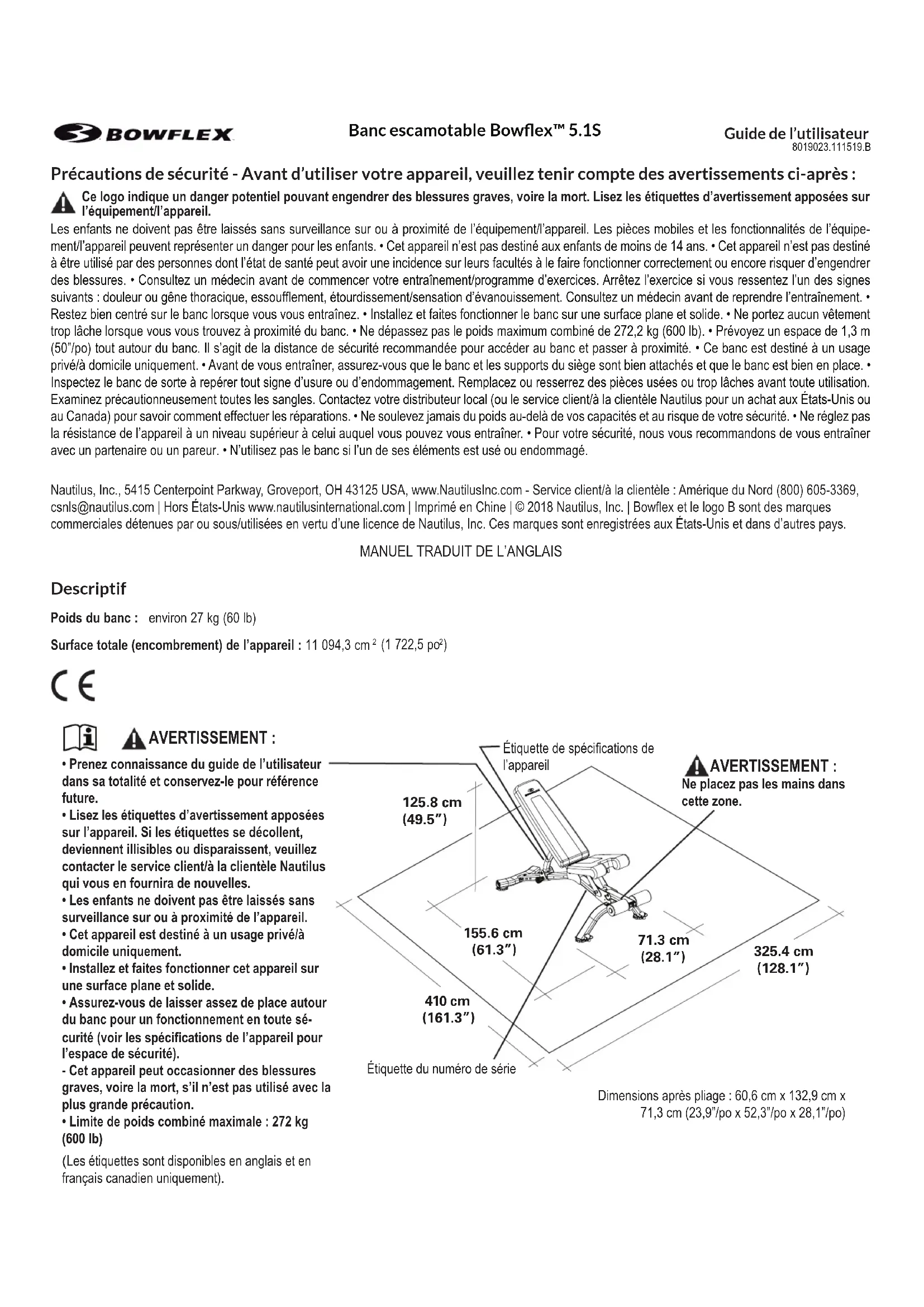 (128.1”) 410 cm (161.3”) Banc escamotable Bowex™ 5.1S Précautions de sécurité - Avant d’utiliser votre appareil, veuillez tenir compte des avertissements ci-après: Ce logo indique un danger potentiel pouvant engendrer des blessures graves, voire la mort. Lisez les étiquettes d’avertissement apposées sur l’équipement/l’appareil. Les enfants ne doivent pas être laissés sans surveillance sur ou à proximité de l’équipement/l’appareil. Les pièces mobiles et les fonctionnalités de l’équipe- ment/l’appareil peuvent représenter un danger pour les enfants. • Cet appareil n’est pas destiné aux enfants de moins de 14 ans. • Cet appareil n’est pas destiné à être utilisé par des personnes dont l’état de santé peut avoir une incidence sur leurs facultés à le faire fonctionner correctement ou encore risquer d’engendrer des blessures. • Consultez un médecin avant de commencer votre entraînement/programme d’exercices. Arrêtez l’exercice si vous ressentez l’un des signes suivants:douleurougênethoracique,essoufement,étourdissement/sensationd’évanouissement.Consultezunmédecinavantdereprendrel’entraînement.• Restez bien centré sur le banc lorsque vous vous entraînez. • Installez et faites fonctionner le banc sur une surface plane et solide. • Ne portez aucun vêtement trop lâche lorsque vous vous trouvez à proximité du banc. • Ne dépassez pas le poids maximum combiné de 272,2 kg (600 lb). • Prévoyez un espace de 1,3 m (50”/po) tout autour du banc. Il s’agit de la distance de sécurité recommandée pour accéder au banc et passer à proximité. • Ce banc est destiné à un usage privé/à domicile uniquement. • Avant de vous entraîner, assurez-vous que le banc et les supports du siège sont bien attachés et que le banc est bien en place. • Inspectez le banc de sorte à repérer tout signe d’usure ou d’endommagement. Remplacez ou resserrez des pièces usées ou trop lâches avant toute utilisation. Examinez précautionneusement toutes les sangles. Contactez votre distributeur local (ou le service client/à la clientèle Nautilus pour un achat aux États-Unis ou au Canada) pour savoir comment effectuer les réparations. • Ne soulevez jamais du poids au-delà de vos capacités et au risque de votre sécurité. • Ne réglez pas la résistance de l’appareil à un niveau supérieur à celui auquel vous pouvez vous entraîner. • Pour votre sécurité, nous vous recommandons de vous entraîner avec un partenaire ou un pareur. • N’utilisez pas le banc si l’un de ses éléments est usé ou endommagé. Guide de l’utilisateur 8019023.111519.B Étiquette du numéro de série