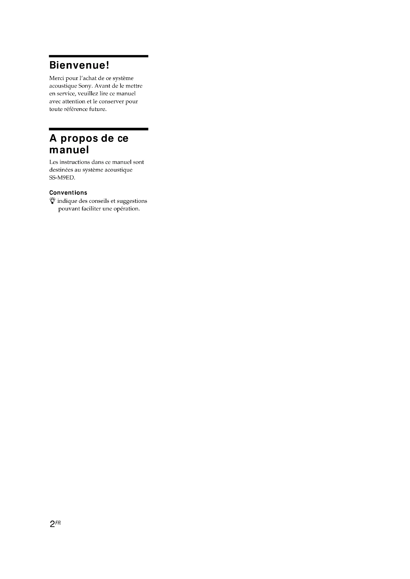 Bienvenue! Merci pour l’achat de ce système acoustique Sony. Avant de le mettre en service, veuillez lire ce manuel avec attention et le conserver pour toute référence future. A propos de ce manuel Les instructions dans ce manuel sont destinées au système acoustique SS-M9ED. Conventions z indique des conseils et suggestions pouvant faciliter une opération.3