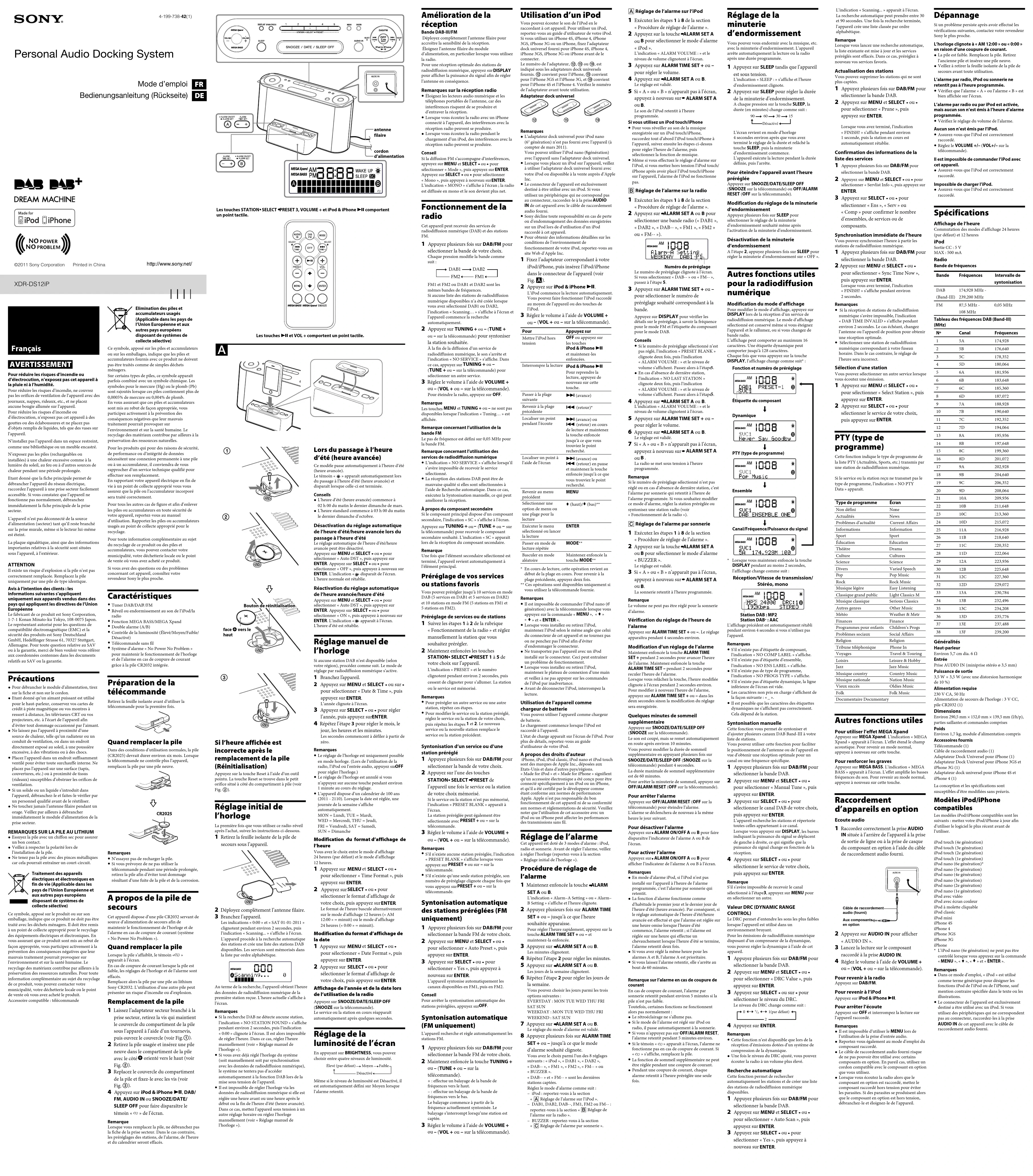 XDR-DS12iP©2011 Sony CorporationPrinted in China Réglage de l’alarme sur l’iPod1 Exécutez les étapes 1 à 8 de la section « Procédure de réglage de l’alarme ».2 Appuyez sur la touche ALARM SET A B pour sélectionner le mode d’alarme « iPod ».L’indication « ALARM VOLUME : » et le niveau de volume clignotent à l’écran. 3 Appuyez sur ALARM TIME SET + ou – pour régler le volume.4 Appuyez sur ALARM SET A ou B.Le réglage est validé. 5 Si « A » ou « B » n’apparaît pas à l’écran, appuyez à nouveau sur ALARM SET A B.Le son de l’iPod retentit à l’heure programmée.Si vous utilisez un iPod touch/iPhone Pour vous réveiller au son de la musique enregistrée sur un iPod touch/iPhone, raccordez tout d’abord l’iPod touch/iPhone à l’appareil, suivez ensuite les étapes ci-dessus pour régler l’heure de l’alarme, puis sélectionnez la fonction de musique. Même si vous effectuez le réglage d’alarme sur l’iPod, si vous mettez hors tension l’iPod touch/iPhone après avoir placé l’iPod touch/iPhone sur l’appareil, l’alarme de l’iPod ne fonctionne pas. Réglage de l’alarme sur la radio 1 Exécutez les étapes 1 à 8 de la section « Procédure de réglage de l’alarme ».2 Appuyez sur ALARM SET A ou B pour sélectionner une bande radio (« DAB1 », « DAB2 », « DAB-- », « FM1 », « FM2 » ou « FM-- »).Numéro de préréglageLe numéro de préréglage clignote à l’écran.Si vous sélectionnez « DAB-- » ou « FM-- », passez à l’étape 5. 3 Appuyez sur ALARM TIME SET + ou – pour sélectionner le numéro de préréglage souhaité correspondant à la bande.Appuyez sur DISPLAY pour vérifier les détails sur le préréglage, à savoir la fréquence pour le mode FM et l’étiquette du composant pour le mode DAB.Conseils Si le numéro de préréglage sélectionné n’est pas réglé, l’indication « PRESET BLANK » clignote deux fois, puis l’indication « ALARM VOLUME : » et le niveau de volume s’affichent. Passez alors à l’étape 5. En cas d’absence de dernière station, l’indication « NO LAST STATION » clignote deux fois, puis l’indication « ALARM VOLUME : » et le niveau de volume s’affichent. Passez alors à l’étape 5.4 Appuyez sur ALARM SET A ou B.L’indication « ALARM VOLUME : » et le niveau de volume clignotent à l’écran. 5 Appuyez sur ALARM TIME SET + ou – pour régler le volume.6 Appuyez sur ALARM SET A ou B.Le réglage est validé.7 Si « A » ou « B » n’apparaît pas à l’écran, appuyez à nouveau sur ALARM SET A B .La radio se met sous tension à l’heure programmée.RemarqueSi le numéro de préréglage sélectionné n’est pas réglé ou en cas d’absence de dernière station, c’est l’alarme par sonnerie qui retentit à l’heure de l’alarme programmée. Si vous souhaitez modifier ce mode d’alarme, réglez la station préréglée ou syntonisez une station radio (voir « Fonctionnement de la radio »). Réglage de l’alarme par sonnerie1 Exécutez les étapes 1 à 8 de la section « Procédure de réglage de l’alarme ».2 Appuyez sur la touche ALARM SET A B pour sélectionner le mode d’alarme « BUZZER ».Le réglage est validé. 3 Si « A » ou « B » n’apparaît pas à l’écran, appuyez à nouveau sur ALARM SET A B.La sonnerie retentit à l’heure programmée.RemarqueLe volume ne peut pas être réglé pour la sonnerie d’alarme.Vérification du réglage de l’heure de l’alarme Appuyez sur ALARM TIME SET + ou –. Le réglage apparaîtra pendant 4 secondes environ.Modification d’un réglage de l’alarmeMaintenez enfoncée la touche ALARM TIME SET + pendant 2 secondes pour avancer l’heure de l’alarme. Maintenez enfoncée la touche ALARM TIME SET – pendant 2 secondes pour reculer l’heure de l’alarme.Lorsque vous relâchez la touche, l’heure modifiée clignote à l’écran pendant 2 secondes environ. Pour modifier à nouveau l’heure de l’alarme, appuyez sur ALARM TIME SET + ou – dans les deux secondes sinon la modification du réglage sera enregistrée.Quelques minutes de sommeil supplémentaireAppuyez sur SNOOZE/DATE/SLEEP OFF (SNOOZE sur la télécommande).Le son est coupé, mais se remet automatiquement en route après environ 10 minutes. Vous pouvez modifier la durée de sommeil supplémentaire en appuyant plusieurs fois sur SNOOZE/DATE/SLEEP OFF (SNOOZE sur la télécommande) pendant 4 secondes.La durée maximale de sommeil supplémentaire est de 60 minutes.Pour arrêter la minuterie de sommeil, appuyez sur OFF/ALARM RESET (OFF sur la télécommande).Pour arrêter l’alarmeAppuyez sur OFF/ALARM RESET (OFF sur la télécommande) pour éteindre l’alarme.L’alarme se déclenchera de nouveau à la même heure le jour suivant.Pour désactiver l’alarmeAppuyez sur ALARM ON/OFF A ou B pour faire disparaître l’indicateur de l’alarme A ou B de l’écran.Pour activer l’alarmeAppuyez sur ALARM ON/OFF A ou B pour afficher l’indicateur de l’alarme A ou B à l’écran.Remarques En mode d’alarme iPod, si l’iPod n’est pas installé sur l’appareil à l’heure de l’alarme programmée, c’est l’alarme par sonnerie qui retentit. La fonction d’alarme fonctionne comme d’habitude le premier jour et le dernier jour de l’heure d’été (heure avancée). Par conséquent, si le réglage automatique de l’heure d’été/heure avancée est effectué et que l’alarme est réglée sur une heure omise lorsque l’heure d’été commence, l’alarme retentit ; si l’alarme est réglée sur une heure qui effectue un chevauchement lorsque l’heure d’été se termine, l’alarme retentit deux fois. Si vous avez réglé la même heure pour les alarmes A et B, l’alarme A est prioritaire. Si vous laissez l’alarme retentir, elle s’arrête au bout de 60 minutes.Remarque sur l’alarme en cas de coupure de courantEn cas de coupure de courant, l’alarme par sonnerie retentit pendant environ 5 minutes si la