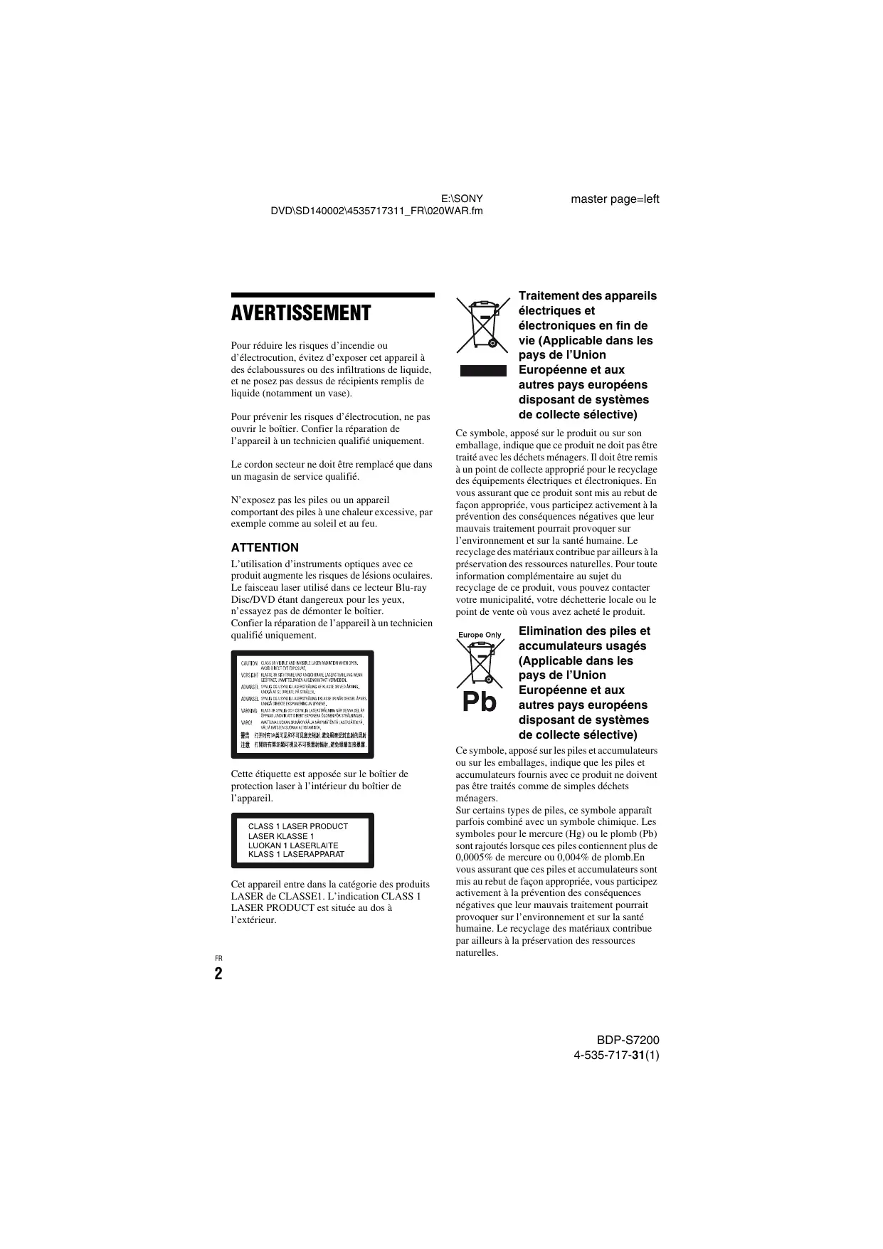 E:\SONY DVD\SD140002\4535717311_FR\020WAR.fm AVERTISSEMENT Pour réduire les risques d’incendie ou d’électrocution, évitez d’exposer cet appareil à des éclaboussures ou des infiltrations de liquide, et ne posez pas dessus de récipients remplis de liquide (notamment un vase). Pour prévenir les risques d’électrocution, ne pas ouvrir le boîtier. Confier la réparation de l’appareil à un technicien qualifié uniquement. Le cordon secteur ne doit être remplacé que dans un magasin de service qualifié. N’exposez pas les piles ou un appareil comportant des piles à une chaleur excessive, par exemple comme au soleil et au feu. ATTENTION L’utilisation d’instruments optiques avec ce produit augmente les risques de lésions oculaires. Le faisceau laser utilisé dans ce lecteur Blu-ray Disc/DVD étant dangereux pour les yeux, n’essayez pas de démonter le boîtier. Confier la réparation de l’appareil à un technicien qualifié uniquement. Cette étiquette est apposée sur le boîtier de protection laser à l’intérieur du boîtier de l’appareil. Cet appareil entre dans la catégorie des produits LASER de CLASSE1. L’indication CLASS 1 LASER PRODUCT est située au dos à l’extérieur.