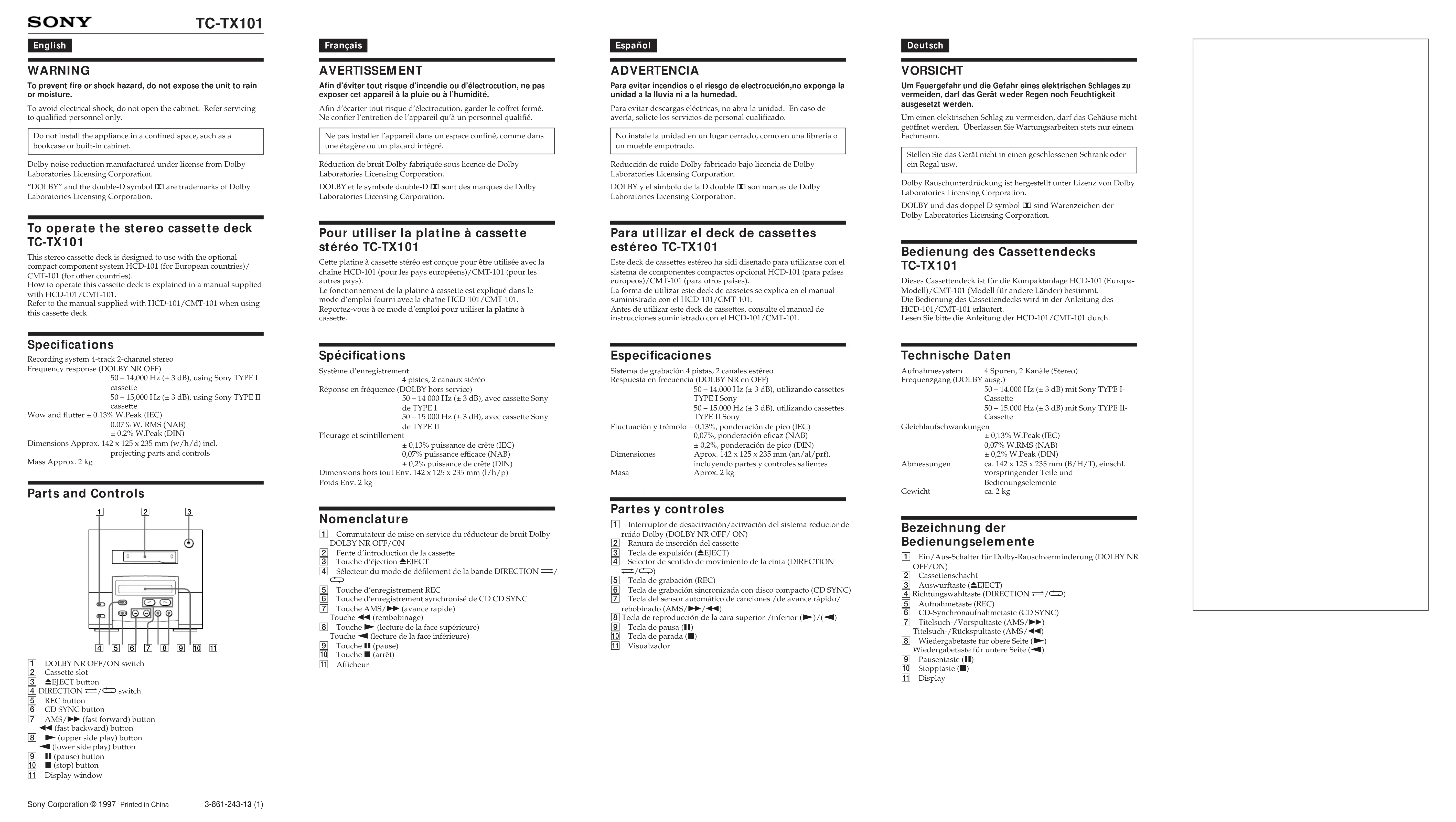 4 5 6 7 8 9 !º !¡ 1 DOLBY NR OFF/ON switch 2 Cassette slot 3 6EJECT button 4 DIRECTION A/a switch 5 REC button 6 CD SYNC button 7 AMS/) (fast forward) button 0 (fast backward) button 8 ( (upper side play) button 9 (lower side play) button 9 P (pause) button 0 p (stop) button !¡ Display window Français AVERTISSEMENT Afin d’éviter tout risque d’incendie ou d’électrocution, ne pas exposer cet appareil à la pluie ou à l’humidité. Afin d’écarter tout risque d’électrocution, garder le coffret fermé. Ne confier l’entretien de l’appareil qu’à un personnel qualifié. Ne pas installer l’appareil dans un espace confiné, comme dans une étagère ou un placard intégré. Réduction de bruit Dolby fabriquée sous licence de Dolby Laboratories Licensing Corporation. DOLBY et le symbole double-D a sont des marques de Dolby Laboratories Licensing Corporation. Pour utiliser la platine à cassette stéréo TC-TX101 Cette platine à cassette stéréo est conçue pour être utilisée avec la chaîne HCD-101 (pour les pays européens)/CMT-101 (pour les autres pays). Le fonctionnement de la platine à cassette est expliqué dans le mode d’emploi fourni avec la chaîne HCD-101/CMT-101. Reportez-vous à ce mode d’emploi pour utiliser la platine à cassette. Spécifications Système d’enregistrement 4 pistes, 2 canaux stéréo Réponse en fréquence (DOLBY hors service) 50 – 14 000 Hz (± 3 dB), avec cassette Sony de TYPE I 50 – 15 000 Hz (± 3 dB), avec cassette Sony de TYPE II Pleurage et scintillement ± 0,13% puissance de crête (IEC) 0,07% puissance efficace (NAB) ± 0,2% puissance de crête (DIN) Dimensions hors tout Env. 142 x 125 x 235 mm (l/h/p) Poids Env. 2 kg Nomenclature 1 Commutateur de mise en service du réducteur de bruit Dolby