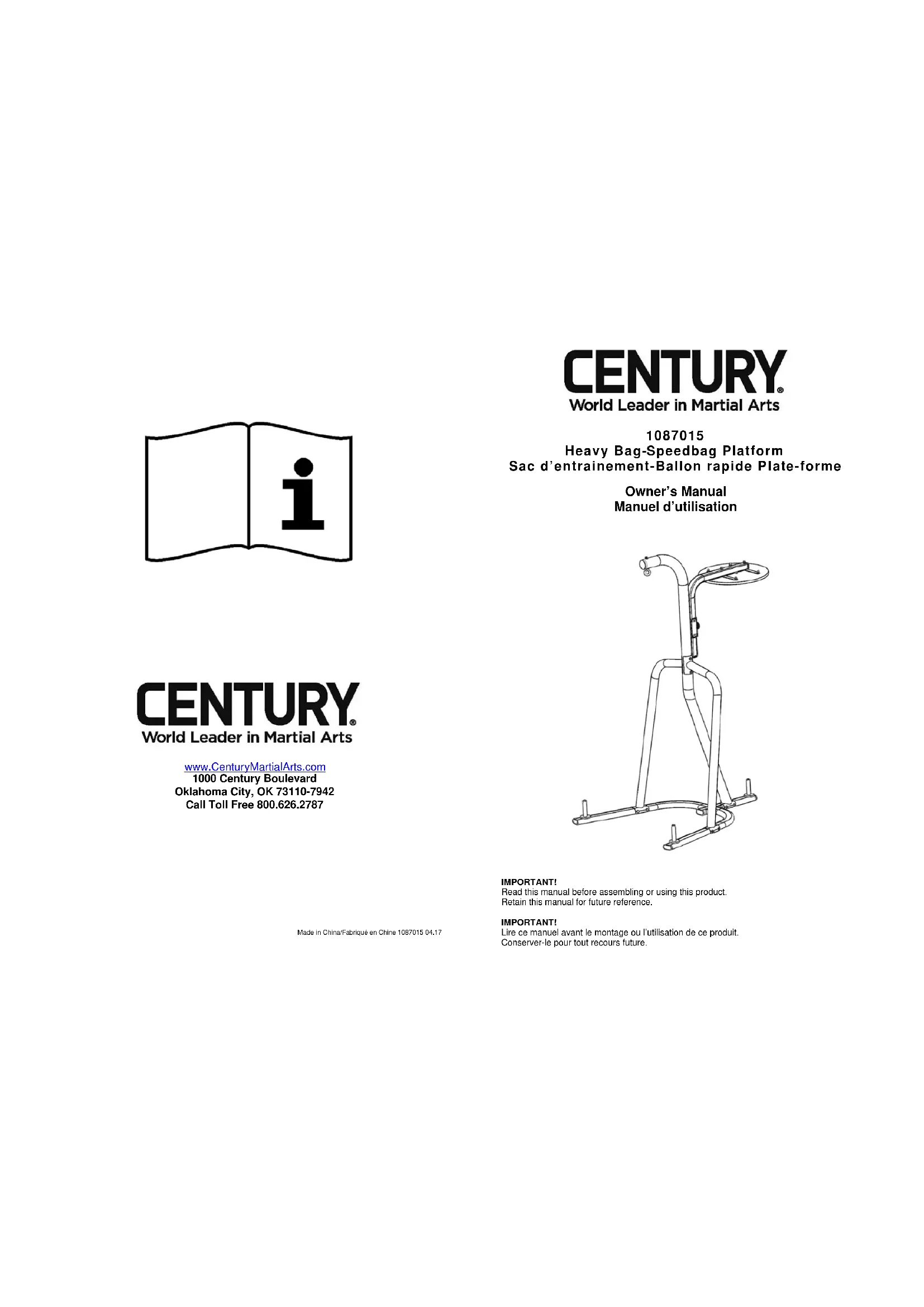 AVERTISSEMENT! L’équipement d’entraînement de Century est destiné au conditionnement physique. Consultez votre médecin avant de commencer un programme d’entraînement. Cet équipement doit seulement être utilisé par des personnes expérimentées ou sous la direction de personnes qualifiées. Des blessures, y compris la paralysie et la mort, peuvent se produire en utilisant cet équipement. Century n'accepte aucune responsabilité en cas de réclamations au titre de blessures corporelles ou de dégâts matériels résultant de l'utilisation ou de l'abus de ce produit par l'acheteur ou n'importe quelle autre personne. L'UTILISATEUR ASSUME TOUS LES RISQUES DE BLESSURES! Avant chaque utilisation, s'assurer que chaque taquet de fixation de poids est chargé du minimum de poids tel que requis dans le manuel d'instruction. Le non-respect de ces consignes présente un danger de renversement du support, qui pourrait causer des blessures corporelles et/ou des dommages matériels. La plateforme et la rotule du ballon rapide sont conçues pour être utilisées uniquement avec un ballon rapide. Suspendre toute autre chose à cet emplacement est susceptible d'endommager l'unité, de la rendre instable et de la renverser, ce qui peut causer des blessures corporelles ou des dégâts matériels. Lire toutes les instructions et avertissements avant d'utiliser. Si vous avez besoin d'un manuel d'instructions, contacter Century au (800) 626-2787 ou au site www.CenturyMartialArts.com et demander le manuel pour l'élément réf. 1087015.