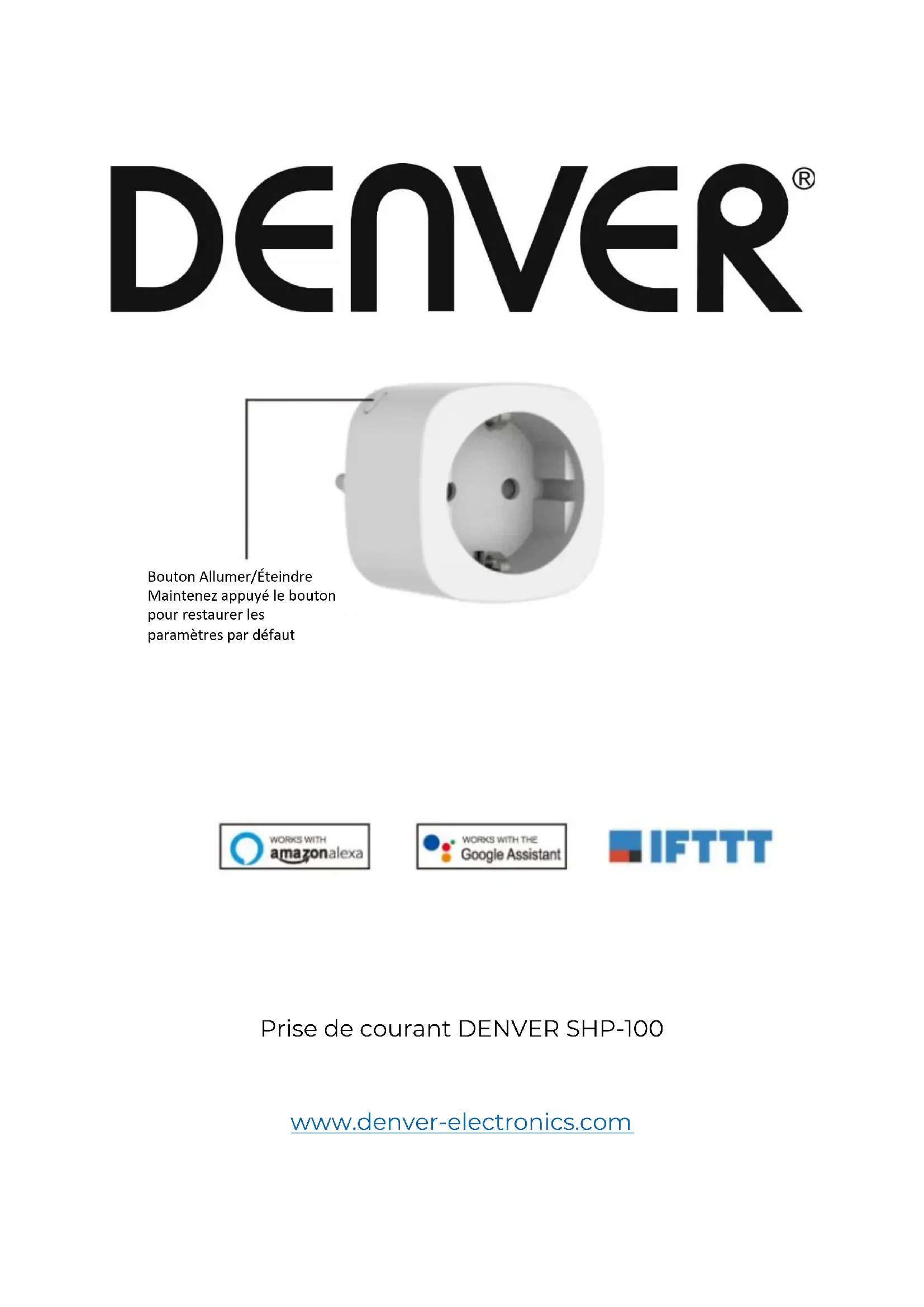 Il est possible d’utiliser la prise de courant avec Amazon Alexa et Google assistant. Utilisez l’application pour ajouter cette fonction. Les instructions sont indiquées dans l’application. Vous pouvez également trouver le manuel complet en anglais sur notre site Web. Rendez-vous sur www.denver-electronics.com et utilisez la fonction de recherche pour trouver SHP-100. La réinitialisation de la prise se fait en maintenant appuyé le bouton Allumer/Éteindre pendant 5 secondes. Vous pouvez maintenant la reconfigurer à partir du début.