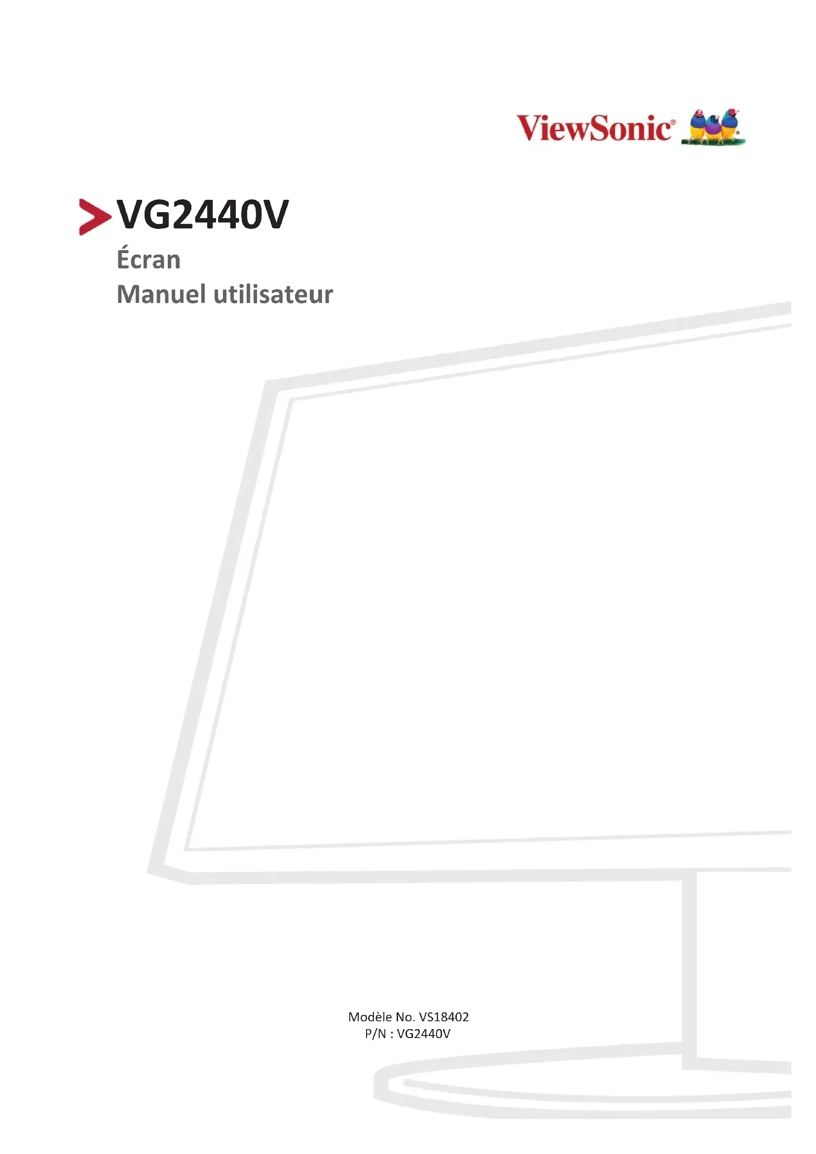 VG2440V Écran Manuel utilisateur Modèle No. VS18402 P/N : VG2440V2 Merci d'avoir choisi ViewSonic® En tant que leader mondial de solutions visuelles, ViewSonic® se consacre à dépasser les attentes du monde en matière d’évolution technologique, d’innovation et de simplicité. Chez ViewSonic®, nous pensons que nos produits peuvent avoir un impact positif dans le monde et nous sommes convaincus que le produit ViewSonic® que vous avez choisi vous servira correctement. Une fois de plus, merci d’avoir choisi ViewSonic® !3 Précauons relaves à la sécurité Veuillez lire les Précauons de sécurité qui suivent avant de commencer à uliser l'appareil.