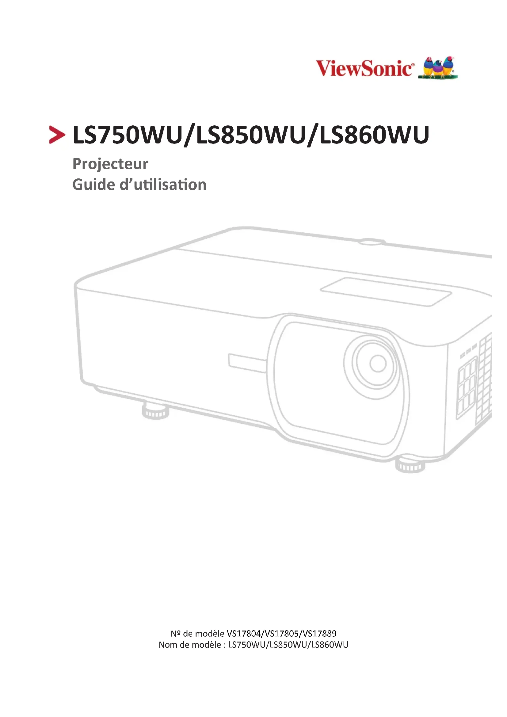 LS750WU/LS850WU/LS860WU Projecteur Guide d’ulisaon Nº de modèle VS17804/VS17805/VS17889 Nom de modèle : LS750WU/LS850WU/LS860WU2 Merci d’avoir choisi ViewSonic® ViewSonic®, un des principaux fournisseurs mondiaux de soluons visuelles, s’engage à dépasser les aentes du monde en maère d’évoluon technologique, d’innovaon et de simplicité. Chez ViewSonic®, nous pensons que nos produits peuvent avoir un impact posif dans le monde et nous sommes convaincus que le produit ViewSonic® que vous avez choisi vous sera ule. Encore une fois, merci d’avoir choisi ViewSonic® !3 Précautions de sécurité - Général Veuillez lire les Précautions de sécurité suivantes avant de commencer à utiliser le projecteur.