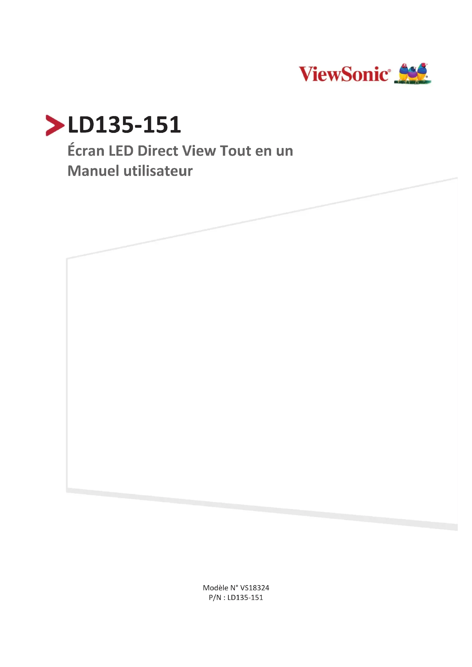 LD135-151 Écran LED Direct View Tout en un Manuel utilisateur Modèle N° VS18324 P/N : LD135-1512 Merci d’avoir choisi ViewSonic® En tant que leader mondial de solutions visuelles, ViewSonic® se consacre à dépasser les attentes du monde en matière d’évolution technologique, d’innovation et de simplicité. Chez ViewSonic®, nous pensons que nos produits peuvent avoir un impact positif dans le monde et nous sommes convaincus que le produit ViewSonic® que vous avez choisi vous servira correctement. Une fois de plus, merci d’avoir choisi ViewSonic® !3 Précauons relaves à la sécurité Veuillez lire les Précauons de sécurité qui suivent avant de commencer à uliser l’appareil.