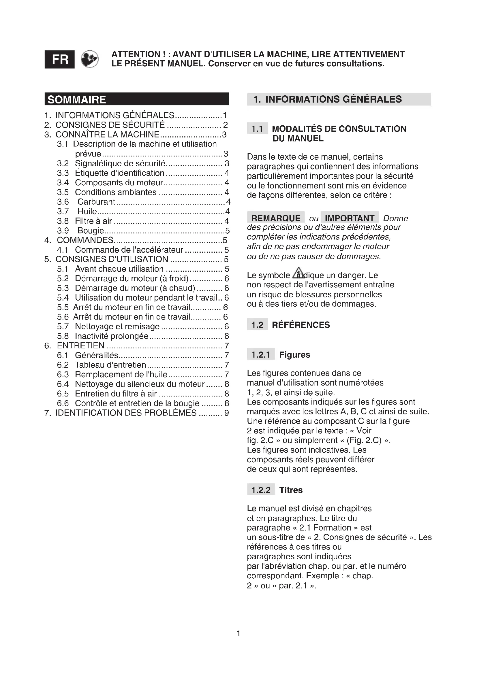 Le manuel est divisé en chapitres et en paragraphes. Le titre du paragraphe « 2.1 Formation » est un sous-titre de « 2. Consignes de sécurité ». Les références à des titres ou paragraphes sont indiquées par l'abréviation chap. ou par. et le numéro correspondant. Exemple : « chap. 2 » ou « par. 2.1 ». ATTENTION ! : AVANT D'UTILISER LA MACHINE, LIRE ATTENTIVEMENT LE PRÉSENT MANUEL. Conserver en vue de futures consultations.