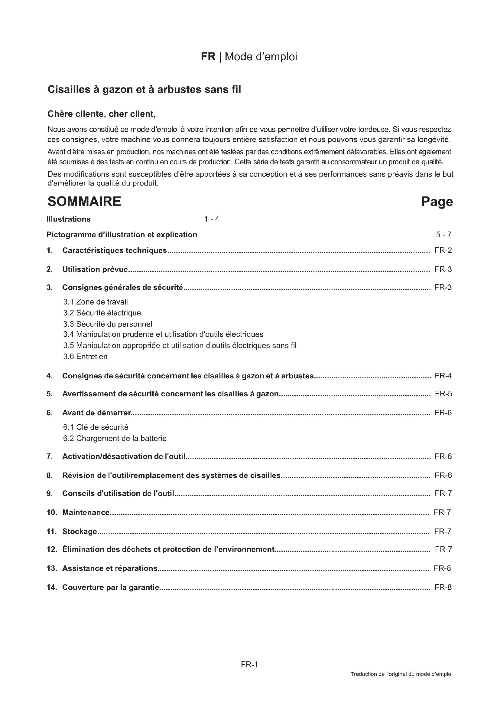 4. Consignes de sécurité concernant les cisailles à gazon et à arbustes...................................................... FR-4 5. Avertissement de sécurité concernant les cisailles à gazon...................................................................... FR-5 6. Avant de démarrer.......................................................................................................................................... FR-6
