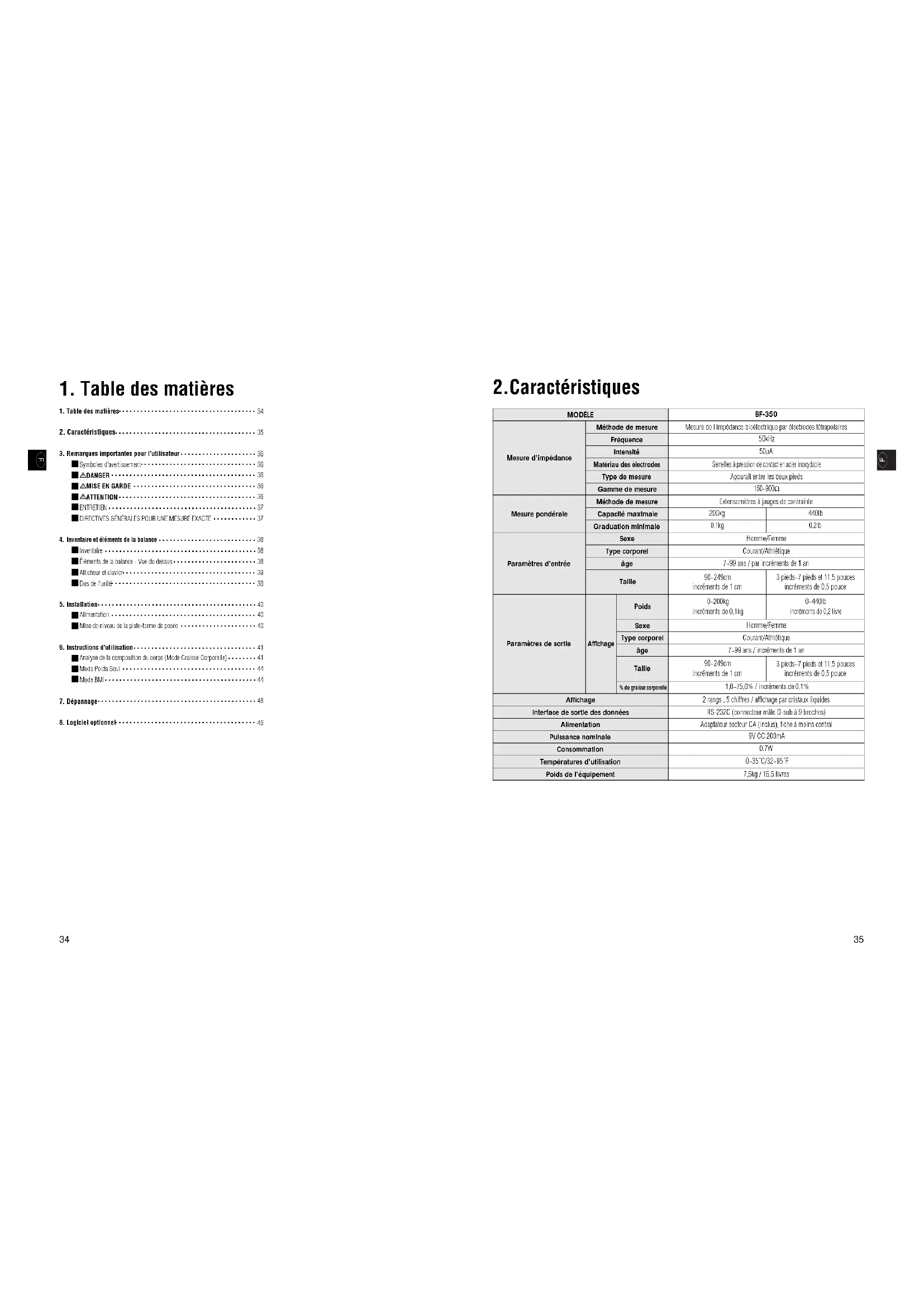 Homme/Femme Paramètres d'entrée Paramètres de sortie Affichage Affichage Poids Sexe Courant/Athlétique Type corporel 7~99 ans / par incréments de 1 an âge 90~249cm incréments de 1 cm 0~200kg incréments de 0,1kg Homme/Femme 3 pieds~7 pieds et 11,5 pouces incréments de 0,5 pouce Taille Sexe Courant/Athlétique Type corporel 7~99 ans / incréments de 1 an âge 90~249cm incréments de 1 cm 2 rangs , 5 chiffres / affichage par cristaux liquides 3 pieds~7 pieds et 11,5 pouces incréments de 0,5 pouce Taille % de graisse corporelle 1,0~75,0% / incréments de 0,1% Interface de sortie des données RS-232C (connecteur mâle D-sub à 9 broches) Alimentation Adaptateur secteur CA (inclus), fiche à moins central Puissance nominale 9V CC 200mA Consommation 0.7W Températures d'utilisation 0~35˚C/32~95˚F Poids de l'équipement 7,5kg / 16,5 livres 0~440lb incréments de 0,2 livre 440lb
