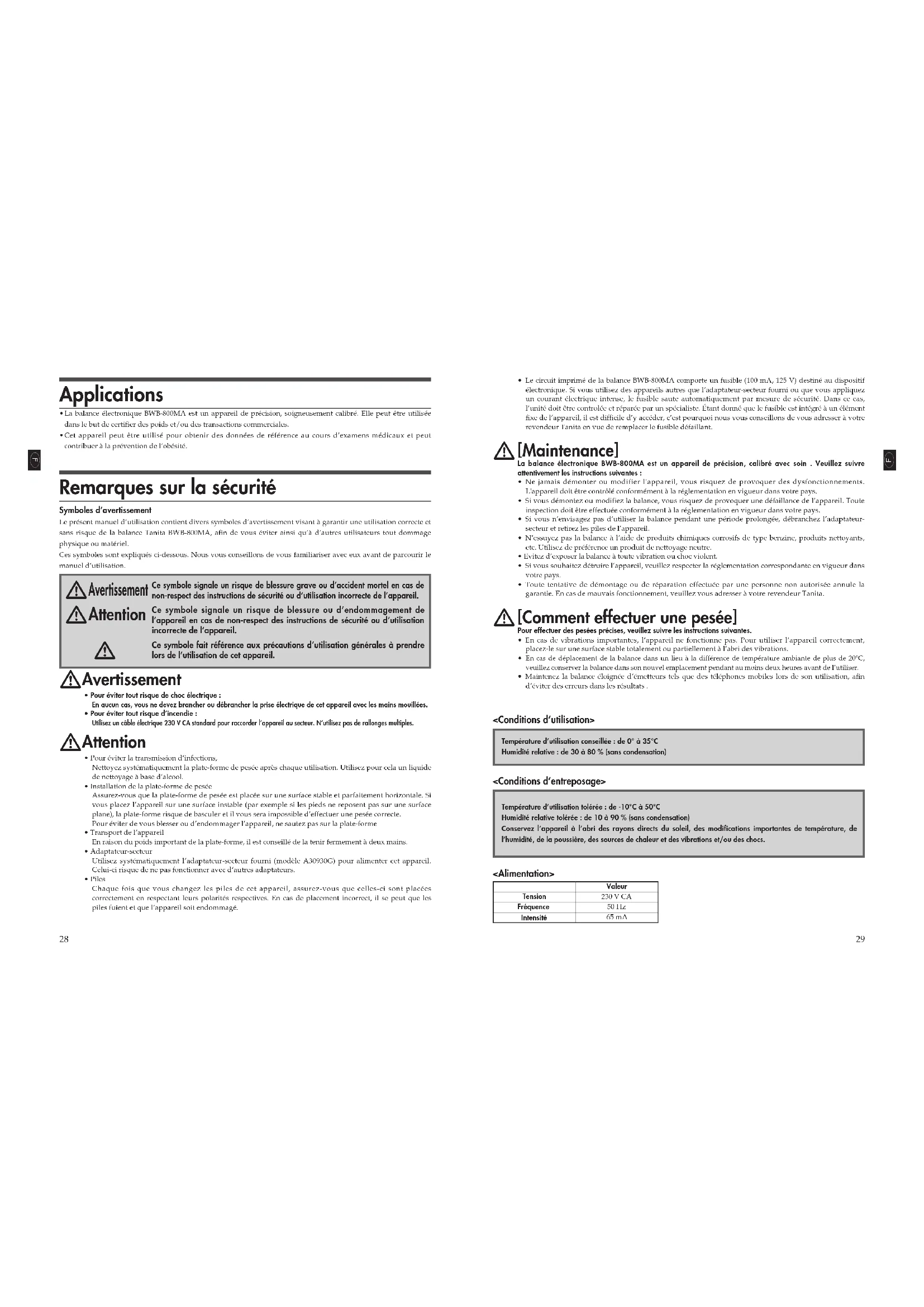 Ce produit satisfait aux exigences des trois normes suivantes :NORMES DE SECURITE : EN60601-1:1990, AM No.1:1993, AM No.2:1995IEC60601-1:1988, AM No.1:1991, AM No.2:1995NORMES CEM : EN-60601-1-2:1993IEC60601-1-2:1993Norme Medical Device Directory :93/42/EEC:1993BWB8007021(1) 14-2,1-chome,Maeno-cho,Itabashi-ku Tokyo,Japan Tel:(03)3968-2123 / (03)3968-7048 Fax:(03)3967-3766Dresdener Strasse 25 D-71065 Sindelfingen, Germany Tel : 07031-61896Fax : 07031-618971http://www.tanita.deUnit 301-303 3/F Wing On Plaza,62 Mody Road, Tsimshatsui East, Kowloon, Hong Kong Tel : +852-2838-7111 Fax : +852-2838-8667 2625 South Clearbrook DriveArlington Heights, Illinois 60005 U.S.A.Toll Free : (800) 826-4828Tel : 847-640-9241 Fax : 847-640-9261http : //www.tanita.com <Corporation Responsible in the EU Region> The Barn, Philpots Close, Yiewsley,West Drayton, Middlesex, UB7 7RY, United Kingdom Tel : +44-1895-438577 Fax : +44-1895-438511http://www.tanita.co.ukVilla Labrouste 68 Boulevard Bourdon, 92200 Neuilly-Sur-Seine,France Tel : 01-55-24-99-99 Fax : 01-55-24-98-68http://www.tanita.fr 301 x 336 x 88 (mm) BWB-800MA Modèle Adaptateur-secteur, modèle A30930G, classe 2 Tension d’entrée : 230 V CA, 50 Hz, 65 mA Tension de sortie : 9 V CC ± 0,45 V CC Courant nominal : 300 mA Tension d’entrée hors charge : 12 V CC ± 0,6 V CC 6 piles alcalines (LR6, non fournies) Alimentation 0,25 W maxi Consommation d’énergie Résistance électrique Système de mesure 200 kg Capacité maximale 0,1 kg Graduation minimale ±0,1 kg Précision lors du premier calibrage 2 kg - 200 kg Poids minimal/maximal admis Écran à cristaux liquides (hauteur des chiffres : 25 mm) Affichage de 0 à 35°C Température d’utilisation de 30 à 80 % (sans condensation) Humidité relative Taille Plate-forme Boîtier d’affichage 160 x 200 x 60 (mm) Durée de vie des piles Approximativement 100 heures d’utilisation continue CaractéristiquesI