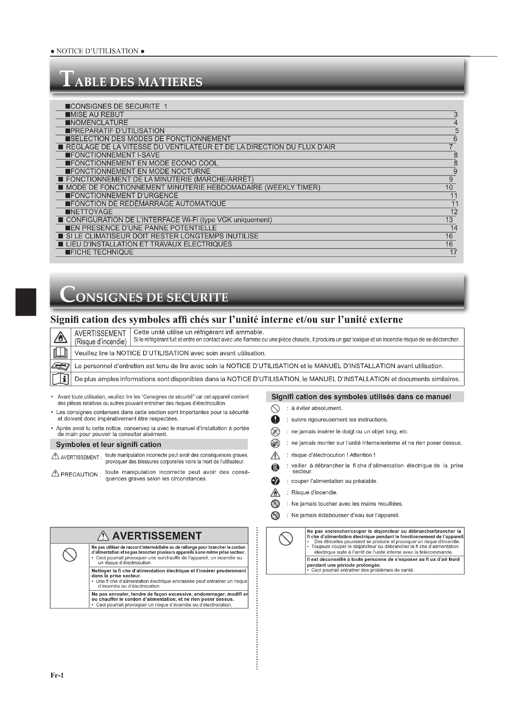 Signifi cation des symboles affi chés sur l’unité interne et/ou sur l’unité externe AVERTISSEMENT (Risque d’incendie) Cette unité utilise un réfrigérant infl ammable. Si le réfrigérant fuit et entre en contact avec une fl amme ou une pièce chaude, il produira un gaz toxique et un incendie risque de se déclencher. Veuillez lire la NOTICE D’UTILISATION avec soin avant utilisation. Le personnel d’entretien est tenu de lire avec soin la NOTICE D’UTILISATION et le MANUEL D’INSTALLATION avant utilisation. De plus amples informations sont disponibles dans la NOTICE D’UTILISATION, le MANUEL D’INSTALLATION et documents similaires. ■ CONSIGNES DE SECURITE 1 ■ MISE AU REBUT 3 ■ NOMENCLATURE 4 ■ PREPARATIF D’UTILISATION 5 ■ SELECTION DES MODES DE FONCTIONNEMENT 6 ■ REGLAGE DE LA VITESSE DU VENTILATEUR ET DE LA DIRECTION DU FLUX D’AIR 7 ■ FONCTIONNEMENT I-SAVE 8 ■ FONCTIONNEMENT EN MODE ECONO COOL 8 ■ FONCTIONNEMENT EN MODE NOCTURNE 9 ■ FONCTIONNEMENT DE LA MINUTERIE (MARCHE/ARRÊT) 9 ■ MODE DE FONCTIONNEMENT MINUTERIE HEBDOMADAIRE (WEEKLY TIMER) 10 ■ FONCTIONNEMENT D’URGENCE 11 ■ FONCTION DE REDÉMARRAGE AUTOMATIQUE 11 ■ NETTOYAGE 12 ■ CONFIGURATION DE L’INTERFACE Wi-Fi (type VGK uniquement) 13