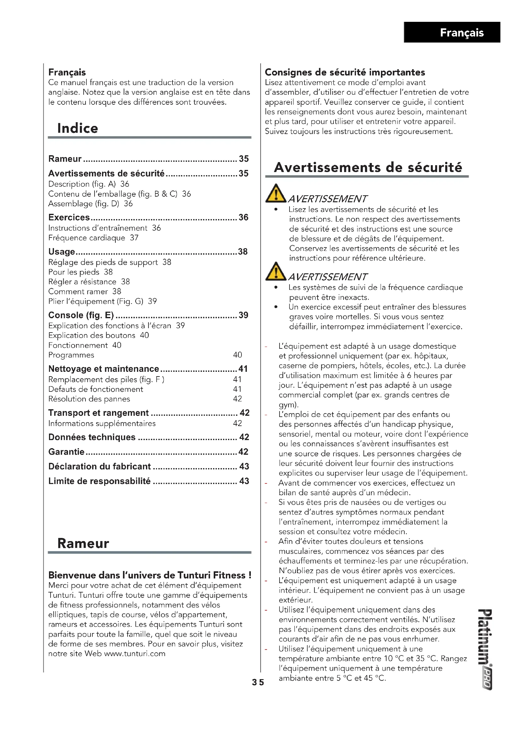 MODE D'EMPLOI Platinum Rower PRO TUNTURI