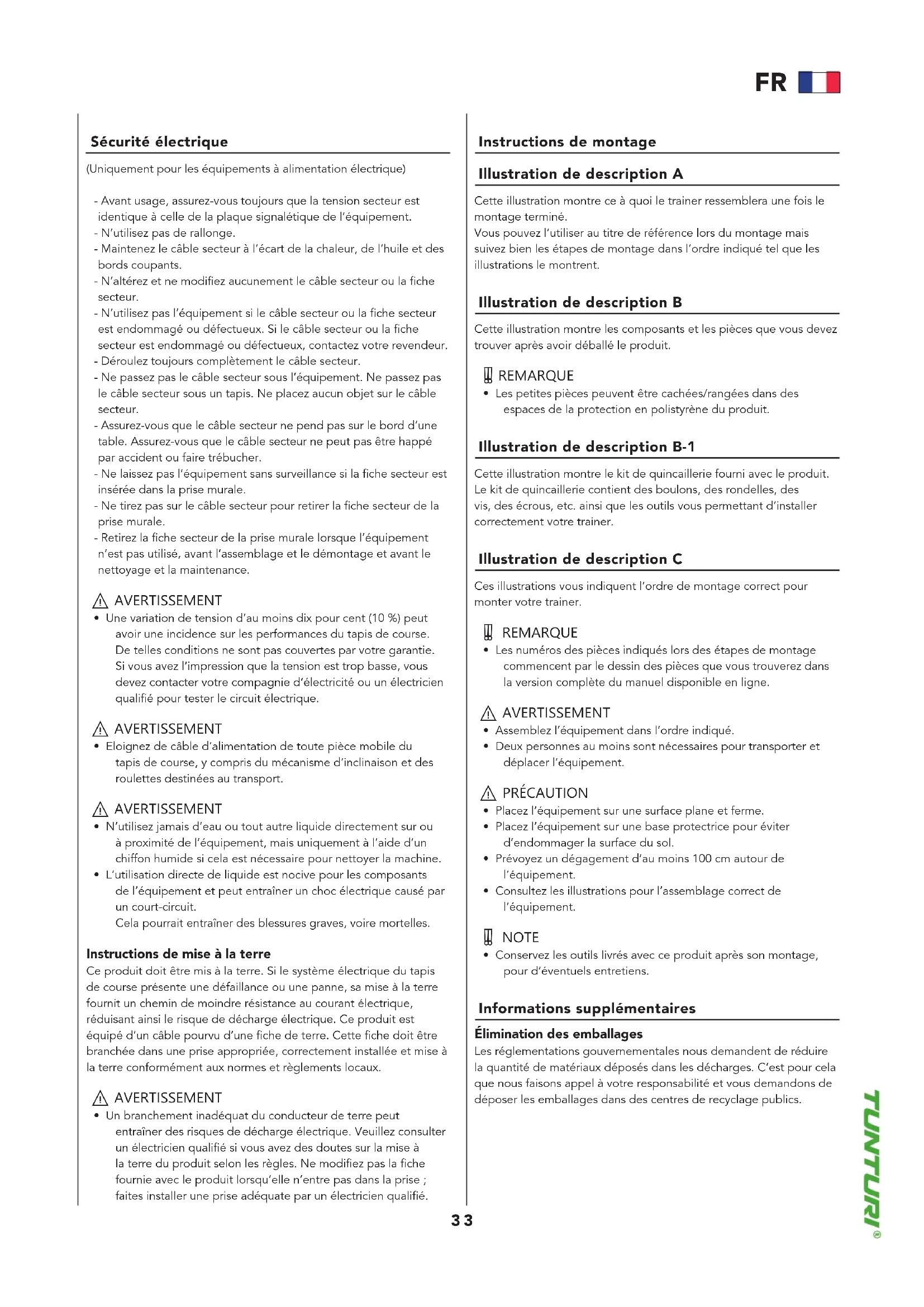 Bienvenue Bienvenue dans l‘univers de Tunturi Fitness !Merci pour votre achat de cet élément d‘équipement Tunturi Tunturi offre toute une gamme d‘équipements de fitness professionnels, notamment des vélos elliptiques, tapis de course, vélos d‘appartement, rameurs, bancs de musculation, multi stations et accessoires Les équipements Tunturi sont parfaits pour toute la famille, quel que soit le niveau de forme de ses membres Pour en savoir plus, visitez notre site Web wwwtunturicom Bienvenue 32 Avertissements de sécurité 32 Sécurité électrique 33 Instructions de montage 33Illustration de description A 33Illustration de description B 33Illustration de description B-1 33Illustration de description C 33 Informations supplémentaires 33 Exercices 34 Instructions d’entraînement 34Fréquence cardiaque 34 Usage 35 Ajuster le réglage de l’inclinaison (Manuel) 35 Réglage des pieds de support (Fig F7-F8) 35 Interface de l’utilisateur (g. E) 35 Boutons 36 Explication des éléments afchés 36 Programmes 36 Quick start 36 Mode Compte à rebours 36 Fin de l’entraînement 36 Graisse corporelle 36 Programmes d’utilisateur (U-01~U-03) 37 Nettoyage et maintenance 37 Nettoyage général 37 Tapis et surface 37 Lubrication (g. F-6) 38 Réglages de la courroie de course 38 Defauts de fonctionement 39 Codes d’erreur 39 Oil 39 E7 39 Transport et rangement 39 Garantie 39 Déclaration du fabricant 40 Limite de responsabilité 40 Français Ce manuel français est une traduction de la version anglaise Notez que la version anglaise est en tête dans le contenu lorsque des différences sont trouvées Indice Consignes de sécurité importantes Ce Manuel est un élément essentiel de votre équipement d’entraînement : veuillez lire toutes les instructions qu’il contient avant de commencer à utiliser cet équipement Les consignes suivantes doivent toujours être respectées : Avertissements de sécurité ⚠ AVERTISSEMENT