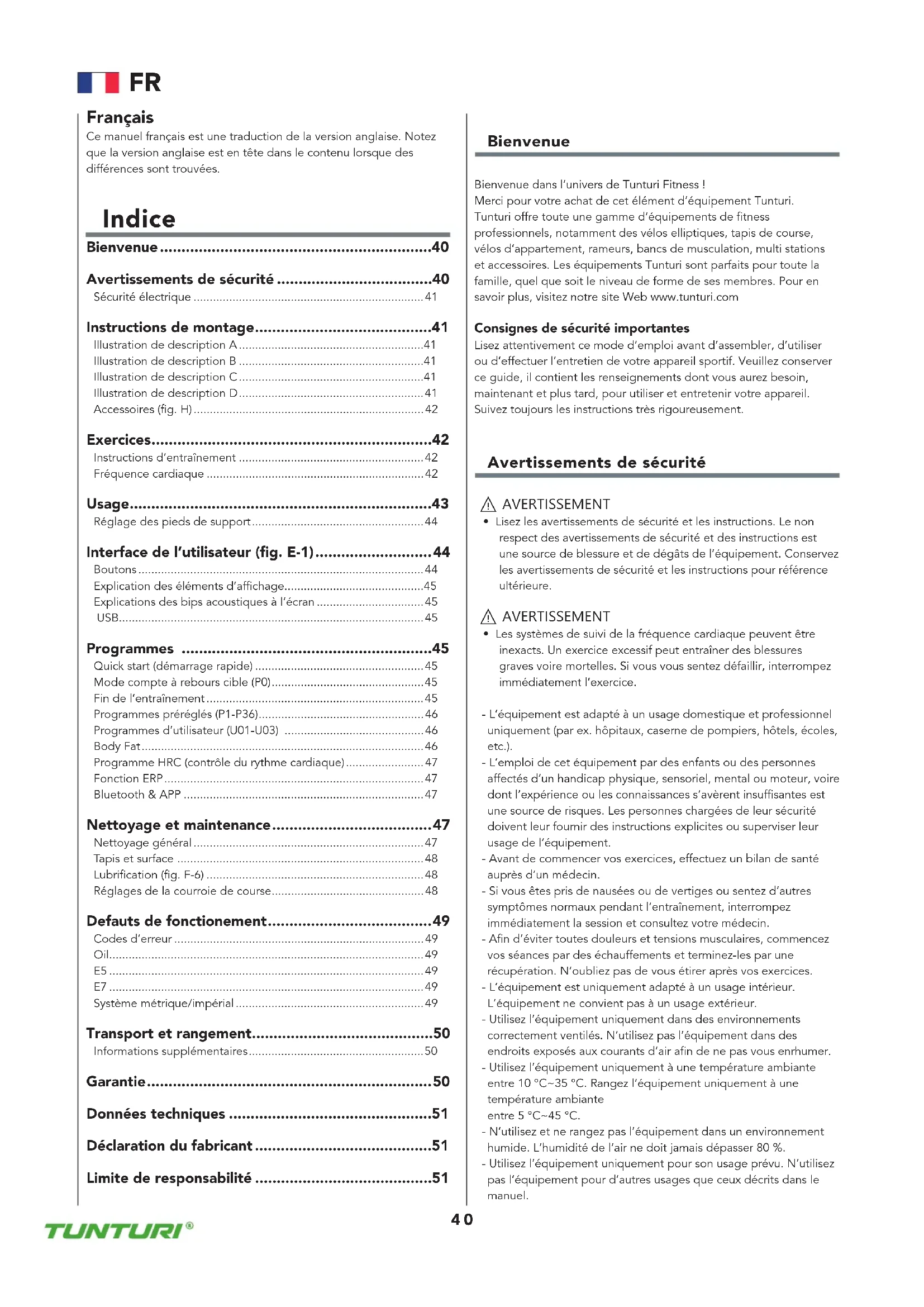 - Transport et rangement 50 Informations supplémentaires Garantie 50 Données techniques 51 Déclaration du fabricant 51 Limite de responsabilité 51 Bienvenue Bienvenue dans l‘univers de Tunturi Fitness !Merci pour votre achat de cet élément d‘équipement Tunturi. Tunturi offre toute une gamme d‘équipements de fitness professionnels, notamment des vélos elliptiques, tapis de course, vélos d‘appartement, rameurs, bancs de musculation, multi stations et accessoires. Les équipements Tunturi sont parfaits pour toute la famille, quel que soit le niveau de forme de ses membres. Pour en savoir plus, visitez notre site Web www.tunturi.comConsignes de sécurité importantesLisez attentivement ce mode d’emploi avant d’assembler, d’utiliser ou d’effectuer l’entretien de votre appareil sportif. Veuillez conserver ce guide, il contient les renseignements dont vous aurez besoin, maintenant et plus tard, pour utiliser et entretenir votre appareil. Suivez toujours les instructions très rigoureusement. Avertissements de sécurité ⚠ AVERTISSEMENT p. 50