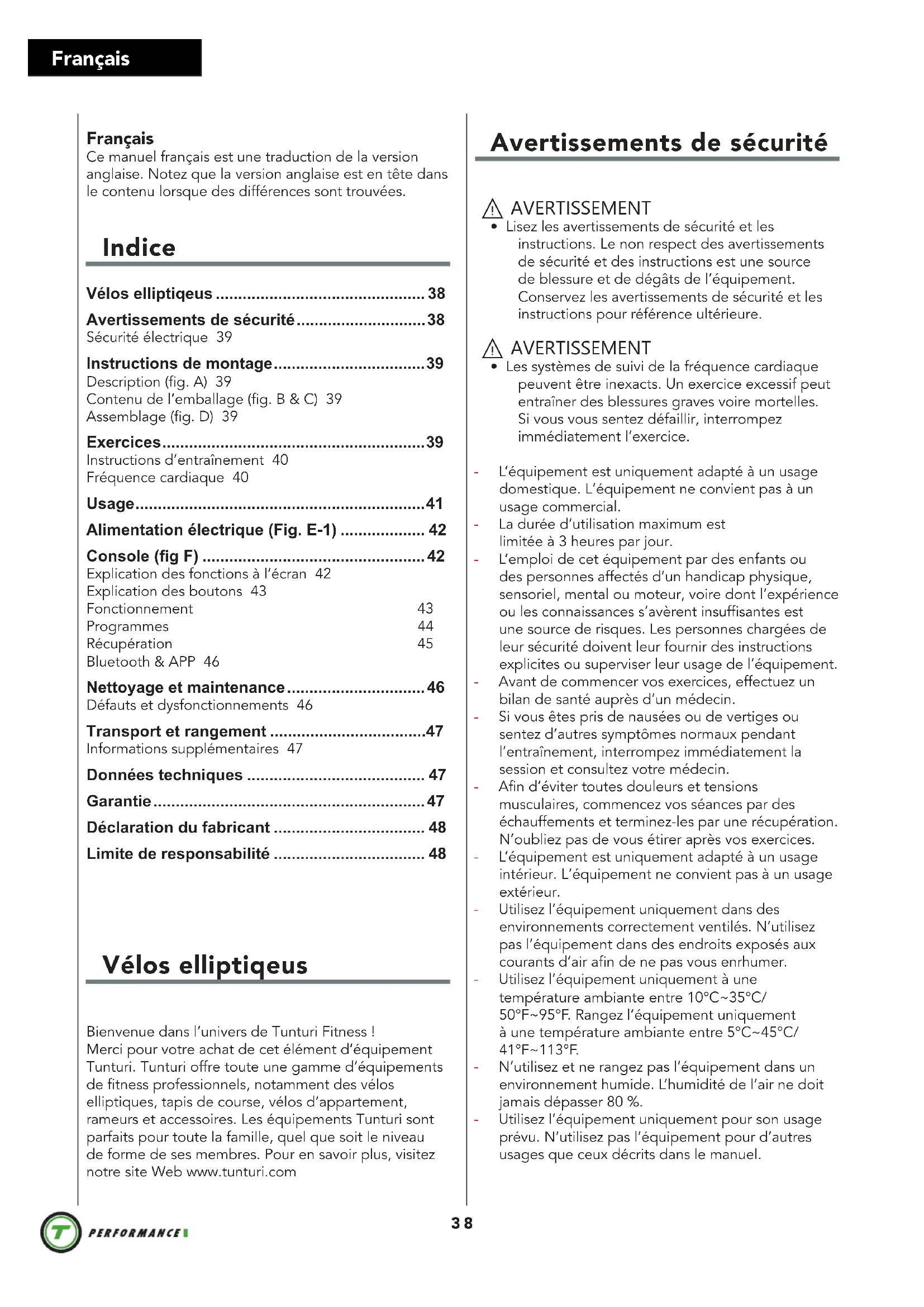 - Garantie Eigentümer-garantie für Tunturi fitnessgeräte. Garantiebedingungen Der Käufer ist berechtigt die den Handel mit Konsumgütern betreffenden gesetzlichen Rechte gemäß der nationalen Gesetzgebung in Anwendung zu bringen. Diese Rechte werden durch die Garantie nicht eingeschränkt. Bedingungen zu ersetzen. Die Eigentümer-Garantie gilt nur dann, wenn das Gerät in einer für entsprechende Geräte der Tunturi New Fitness BV zugelassenen Anwendungsumgebung verwendet wird. Die für das Gerät zugelassene Anwendungsumgebung wird in der Bedienungsanleitung des Geräts genannt. Garantiedauer Die Garantie gilt ab Kaufdatum. Die Garantiedauer kann sich je nach Land unterscheiden. Bitte wenden Sie sich an Ihren zuständigen Händler, um die Garantiedauer zu erfahren. Garantieumfang Unter keinen Umständen haften die Tunturi New Fitness BV oder der Tunturi-Vertragshändler für dem Käufer möglicherweise zugefügte indirekte Schäden wie Gebrauchsbeeinträchtigung oder Einkommensverlust oder anderen wirtschaftlichen Folgeschäden. Einschränküngen der garantie Die Garantie deckt durch Herstellung oder Material hervorgerufene Fehler des Fitnessgeräts in dessen ursprünglicher Zusammensetzung. Unter Voraussetzung, dass die Aufbau-, Pflege- und Gebrauchsanweisungen von Tunturi befolgt wurden, erstreckt sich die Garantie auf solche Fehler, die bei normaler und einem dem Gerät beiliegenden Anleitungsbuch entsprechender Benutzung auftreten können. Die Tunturi New Fitness BV und der Tunturi-Vertragshändler haften nicht für Fehler, die durch Faktoren außerhalb ihrer Einflussmöglichkeiten hervorgerufen wurden. Die Garantie gilt nur für den ursprünglichen Eigentümer und nur in den Ländern, in denen es einen von der Tunturi New Fitness BV autorisierten Importeur gibt. Die Garantie gilt nicht für solche Fitnessgeräte oder Teile, an denen ohne Zustimmung der Tunturi New Fitness BV Veränderungen vorgenommen worden sind. Die Garantie betrifft auch nicht solche Schäden, die durch natürlichen Verschleiß, fehlerhaften Gebrauch, Benutzung unter für das Gerät nicht vorgesehenen Umständen, Korrosion, Verladung oder Transport hervorgerufen wurden. Ersatzleistungen aufgrund von Geräuschen, die beim Einsatz des Geräts auftreten, sind von der Garantie ausgeschlossen, sofern diese Geräusche den Gebrauch des Geräts nicht wesentlich beeinträchtigen und nicht durch einen Gerätefehler bedingt sind. Die Garantie beinhaltet keine Wartungsmaßnahmen, wie Reinigung, Schmieren oder normales Kontrollieren der Teile, auch nicht solche Aufbaumaßnahmen, die der Kunde selbst ausführen kann und die kein spezielles Auseinander- oder Zusammenbauen des Fitnessgeräts erfordern. Zu solchen Maßnahmen gehört beispielsweise das Austauschen von Cockpits, Pedalen oder anderer entsprechender einfacher Teile. Andere als die durch einen autorisierten Tunturi- Vertreter ausgeführten Garantieleistungen werden nicht ersetzt. Durch unsachgemäße, d.h. nicht der Bedienungsanleitung entsprechenden, Bedienung, verfällt jedweder Garantieanspruch.37 Deutsch Herstellererklärung Tunturi New Fitness BV erklärt hiermit, dass das Produkt folgenden Normen und Richtlinien entspricht: EN 957 (HB), 89/336/EWG. Das Produkt trägt daher das CE-Kennzeichen. 01-2017 Tunturi New Fitness BV Purmerweg 1 1311 XE Almere The Netherlands Haftungsausschluss © 2017 Tunturi New Fitness BV Alle Rechte vorbehalten. Produkt und Handbuch können geändert werden. Die technischen Daten können ohne Vorankündigung geändert werden.38 Français Vélos elliptiqeus Bienvenue dans l‘univers de Tunturi Fitness !Merci pour votre achat de cet élément d‘équipement Tunturi. Tunturi offre toute une gamme d‘équipements de fitness professionnels, notamment des vélos elliptiques, tapis de course, vélos d‘appartement, rameurs et accessoires. Les équipements Tunturi sont parfaits pour toute la famille, quel que soit le niveau de forme de ses membres. Pour en savoir plus, visitez notre site Web www.tunturi.com Français Ce manuel français est une traduction de la version anglaise. Notez que la version anglaise est en tête dans le contenu lorsque des différences sont trouvées. Indice Vélos elliptiqeus p. 38