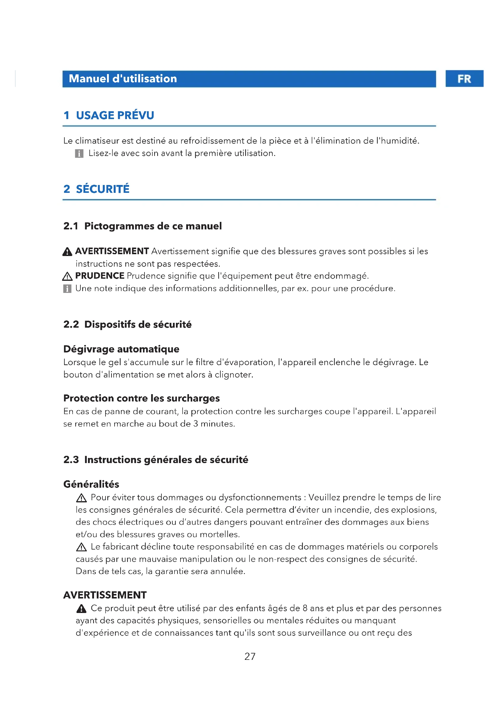 Le climatiseur est destiné au refroidissement de la pièce et à l'élimination de l'humidité. 5 Lisez-le avec soin avant la première utilisation. 2 SÉCURITÉ