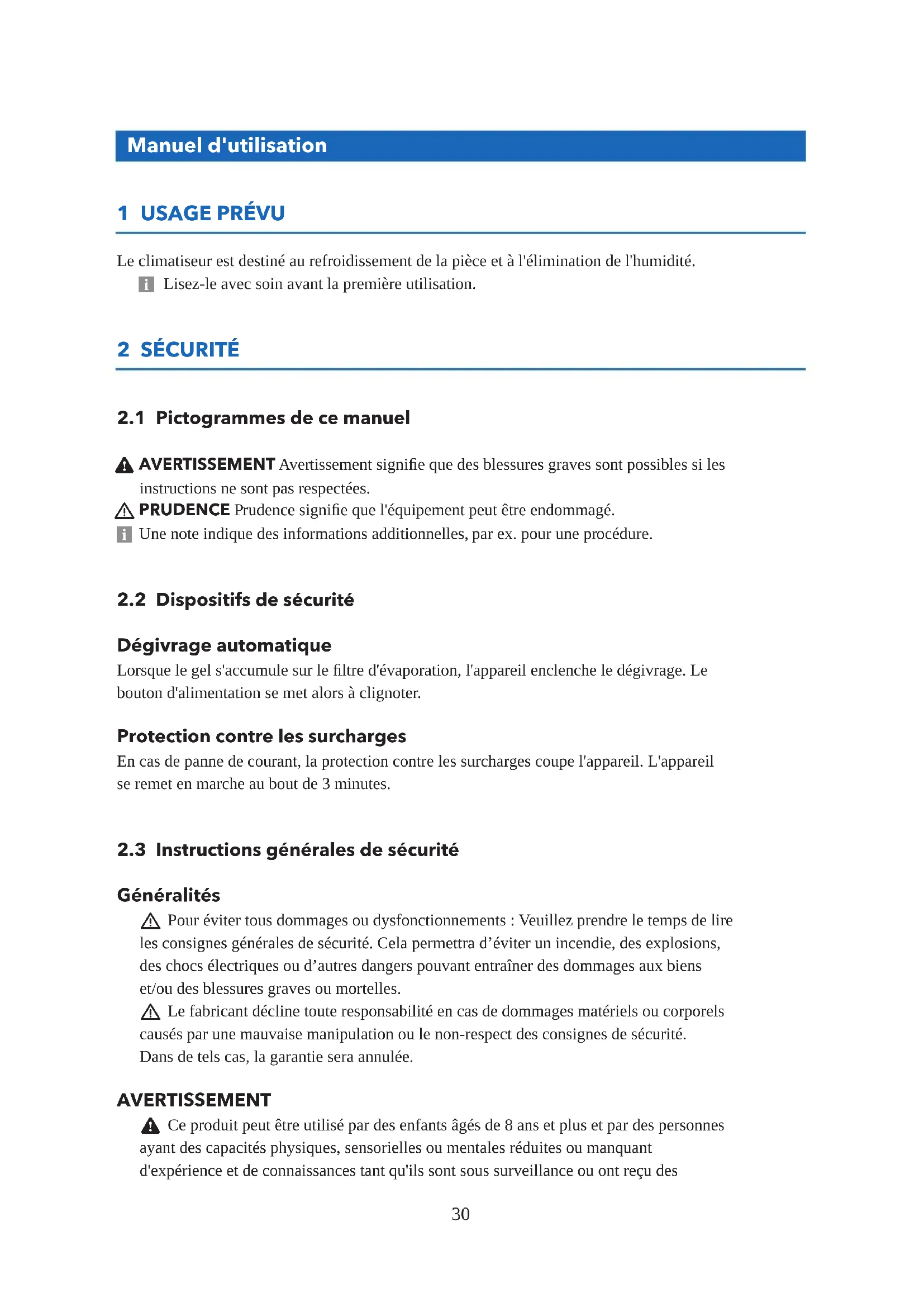 Le climatiseur est destiné au refroidissement de la pièce et à l'élimination de l'humidité. 5 Lisez-le avec soin avant la première utilisation. 2 SÉCURITÉ