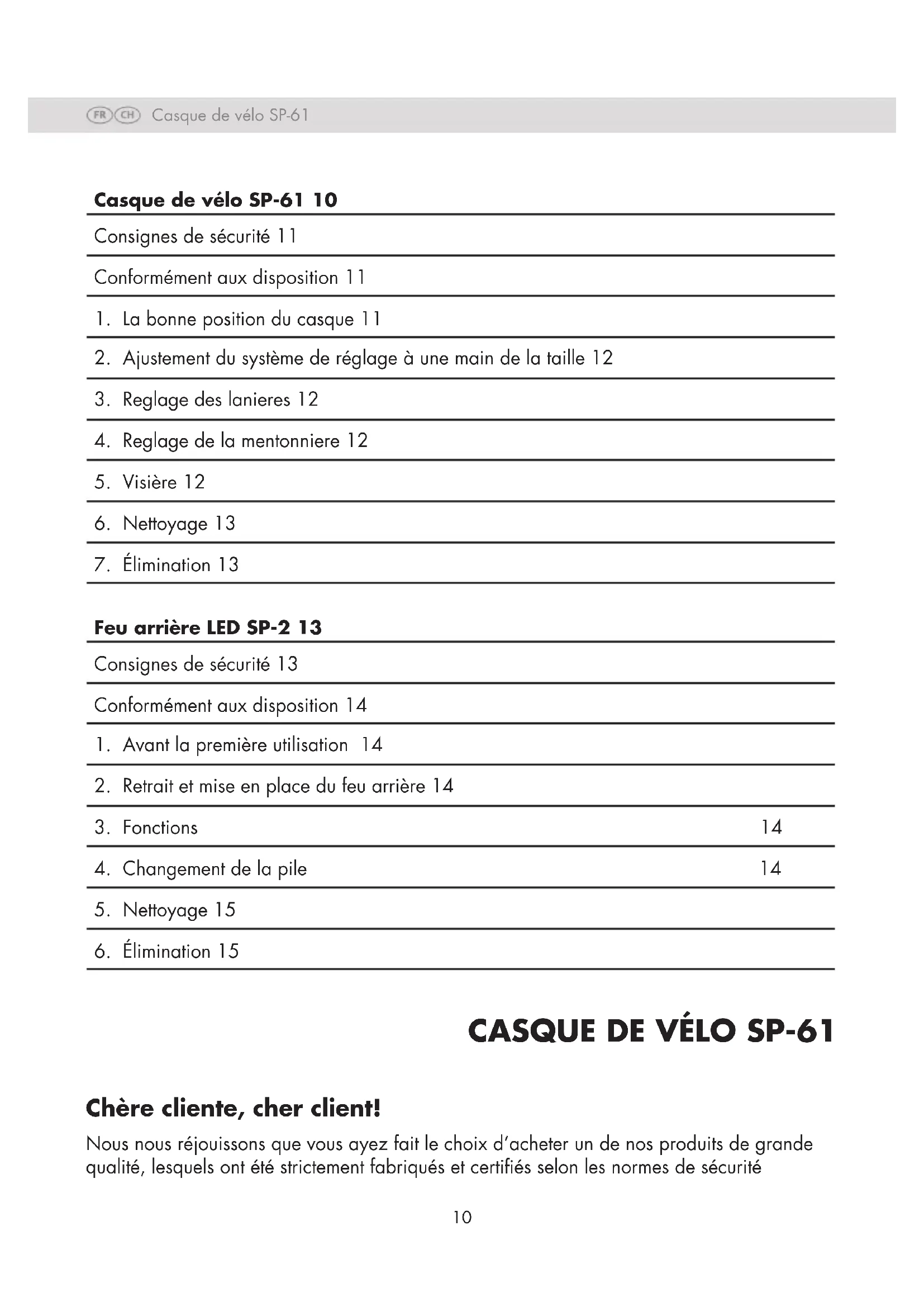 Chère cliente, cher client! Nous nous réjouissons que vous ayez fait le choix d’acheter un de nos produits de grande qualité, lesquels ont été strictement fabriqués et certiés selon les normes de sécurité Casque de vélo SP-61 10 Consignes de sécurité 11 Conformément aux disposition 11