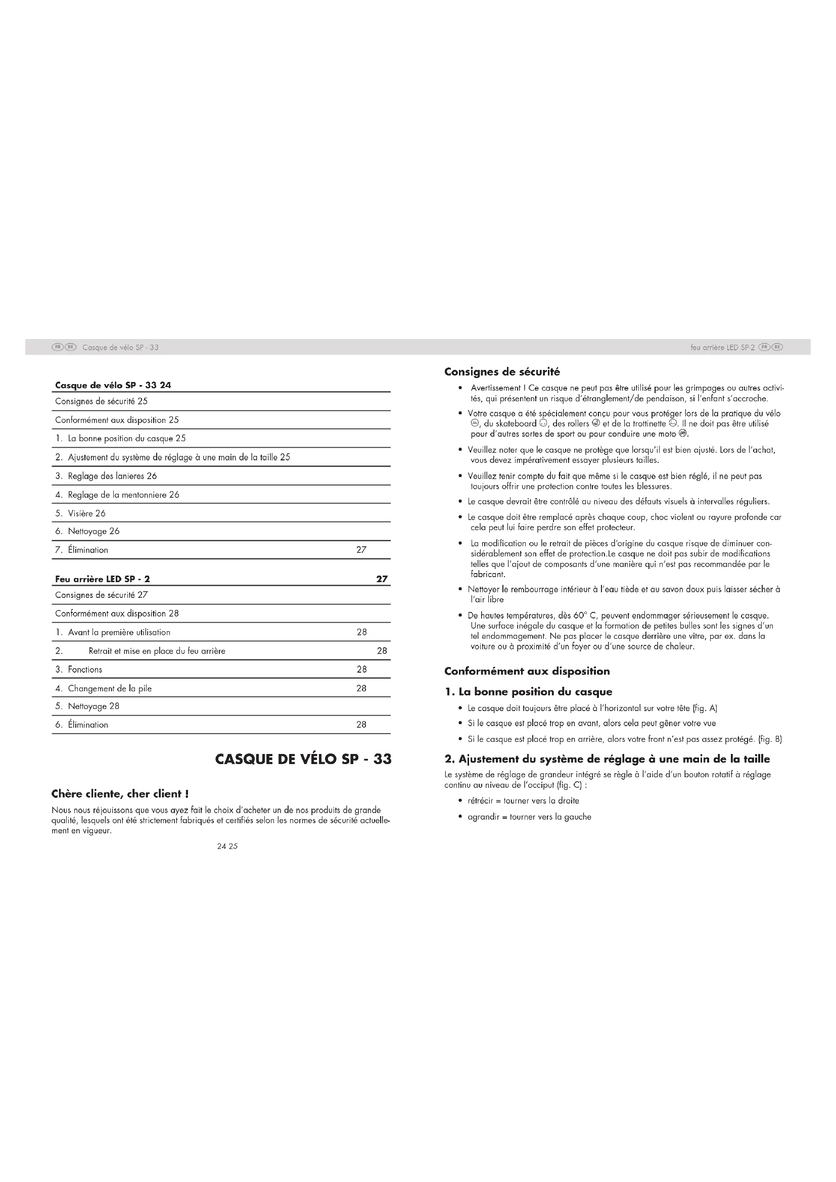 Chère cliente, cher client ! Nous nous réjouissons que vous ayez fait le choix d’acheter un de nos produits de grande qualité, lesquels ont été strictement fabriqués et certiés selon les normes de sécurité actuelle- ment en vigueur. Casque de vélo SP - 33 24 Consignes de sécurité 25 Conformément aux disposition 25