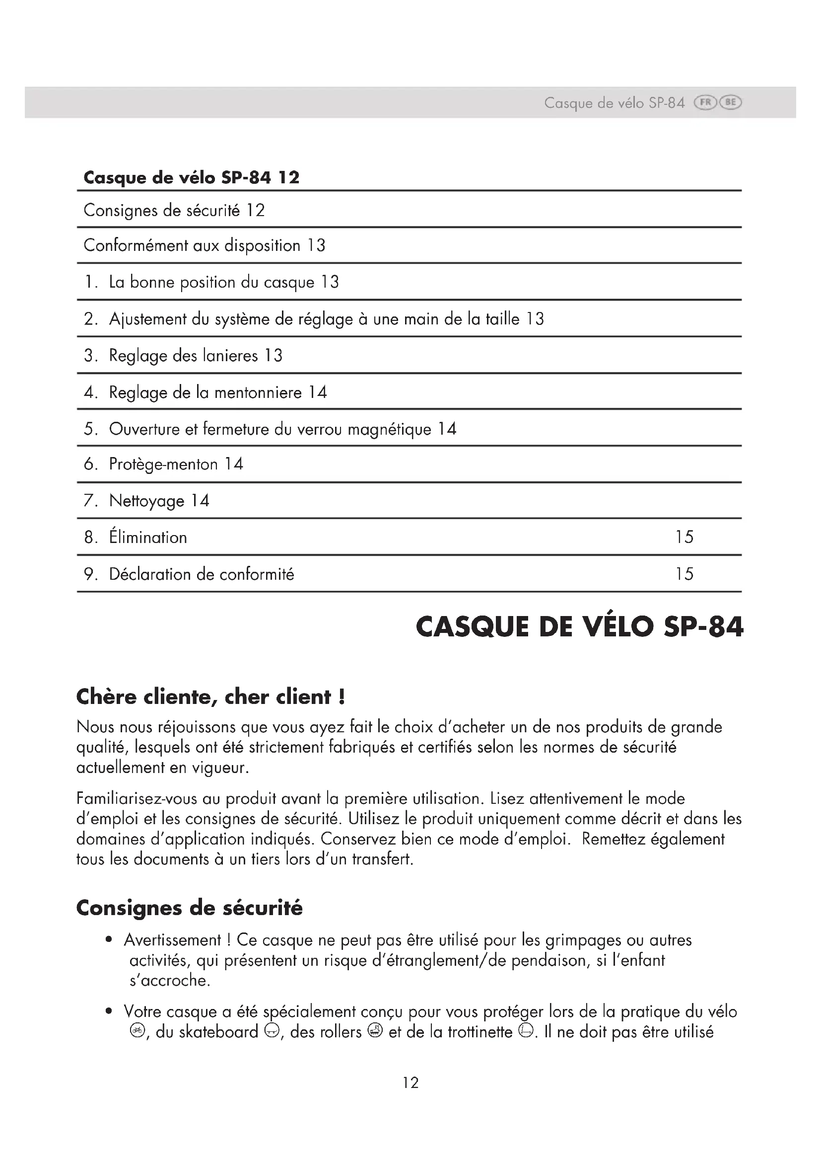 - Votre casque a été spécialement conçu pour vous protéger lors de la pratique du vélo 1, du skateboard 3, des rollers 2 et de la trottinette 4. Il ne doit pas être utilisé Casque de vélo SP-84 12 Consignes de sécurité 12 Conformément aux disposition 13