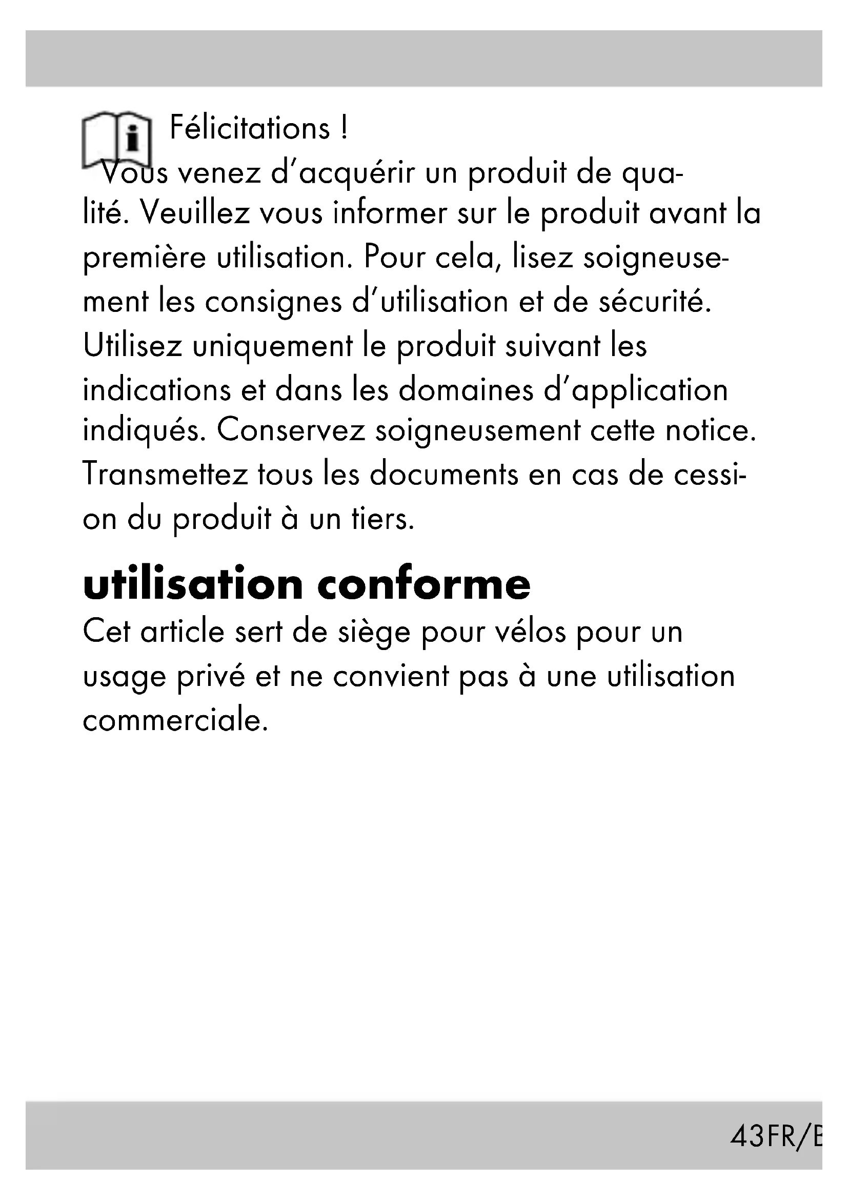- hård – pump 15 x henvisning! Vær opmærksom på, at varen mister luft efter nogen tid. Pump i så fald varen op igen ifølge vejledningen. DK39 Slippe luft ud Tryk på tømningsventilen (2) (Ill. D). Pleje, opbevaring Varen skal altid opbevares tør og ren i et tempe- reret rum. Vigtigt! Rengøres kun med en fugtig klud og gnides efterfølgende tør. Henvisninger vedr. bortskaffelse Emballagen og selve produktet bør bortskaffes miljørigtigt og sorteret! Produktet bortskaffes via et godkendt affaldsselskab eller via din kommuneforvaltning. Følg de aktuelt gældende forskrifter. DK40 3 års garanti Produktet er fremstillet med største omhu og under vedvarende kontrol. Der ydes en garanti på tre år fra købsdatoen på dette produkt. Opbevar venligst kvitteringen fra købet. Garantien gælder kun for materiale- og fabrikati- onsfejl og bortfalder ved misbrug eller uhensigts- mæssig anvendelse. Deres lovpligtige rettigheder, særligt garantikrav, begrænses ikke af denne garanti. Ved eventuelle klager bedes du henvende dig til nedenstående service-hotline eller tage kontakt til os via e-mail. Medarbejderne i vores kundetjeneste vil så aftale den videre fremgangs- måde med dig. Vi vil under alle omstændigheder rådgive dig personlig. Garantiperioden forlænges ikke ved eventuel- le reparationer inden for garantien eller ved kulance. Dette gælder også for udskiftede og reparerede dele. Efter udløb af garantien er forefaldende reparati- oner forbundet med omkostninger. DK41 IAN: 109976 Service Danmark Tel.: 32 710005 E-Mail: deltasport@lidl.dk Du kan også bestille alle varer direkte i vores onlineshop: www.delta-sport.info DK42 FR/BE Table des matières Utilisation conforme .......................................... 43 Consignes de sécurité .............................. 44 - 45 Risque de blessure ................................ 44 - 45 Éviter les dégâts matériels............................ 45 Montage .....................................................46 - 47 Gonfler .............................................................. 48 Laisser échapper de l‘air ................................. 49 Entretien, stockage ............................................ 49 Mise au rebut .................................................... 49 3 ans de garantie ......................................50 - 5143FR/BE Félicitations ! Vous venez d’acquérir un produit de qua- lité. Veuillez vous informer sur le produit avant la première utilisation. Pour cela, lisez soigneuse- ment les consignes d’utilisation et de sécurité. Utilisez uniquement le produit suivant les indications et dans les domaines d’application indiqués. Conservez soigneusement cette notice. Transmettez tous les documents en cas de cessi- on du produit à un tiers. utilisation conforme Cet article sert de siège pour vélos pour un usage privé et ne convient pas à une utilisation commerciale.44 Consignes de sécurité Risque de blessure ! - Montez l‘article de façon professionnelle et veillez à ce qu‘il ne glisse pas pendant l‘utilisation. N‘effectuez aucun réglage sur l‘article pendant les déplacements. - Les tendeurs rapides sur les pattes de fourche doivent être en position fermée. Réglez le tendeur rapide de façon à ressentir un peu de résistance dans une position à 90° et fixez-le. Si nécessaire, adressez-vous à votre revendeur spécialisé. - Avant toute utilisation, contrôlez l‘article du point de vue des endommagements ou de l‘usure. Contrôlez avant toute utilisation le maintien de toutes les vis et si nécessaire revissez les vis mobiles. L‘article doit être uniquement utilisé dans un état parfait ! - Si vous utilisez un siège enfant, faites attention au gainage de toutes les rondelles-ressort se trouvant sous la selle afin d‘éviter de vous coincer les doigts. FR/BE45FR/BE - Toute fente, égratignure dans les zones fortement sollicitées de la selle (raccords à vis) sont le signe que la durée de vie du composant est finie et que la pièce doit être changée. Éviter les dégâts matériels - Veuillez à ne pas mettre l‘article en contact avec des objets pointus. - Protégez l‘article des influences climatiques extrêmes comme le froid, l‘humidité et les rayons directs du soleil.46 FR/BE Montage Réglez toujours la selle à la hauteur qui vous convient. Observez les marques sur le tube porte-selle qui désignent la profondeur minimale de réglage. Les vis de fixation de l‘article doivent être serrées des deux côtés avec 24 Nm afin qu‘elles soient bien fixées sur le pourtige de selle. (ill. A) Orientez l‘article à l‘horizontale. (ill. B.) Pour les pourtiges de selle : fixez la selle au moyen du serre-joint prémonté sur le pourtige. (ill. C)