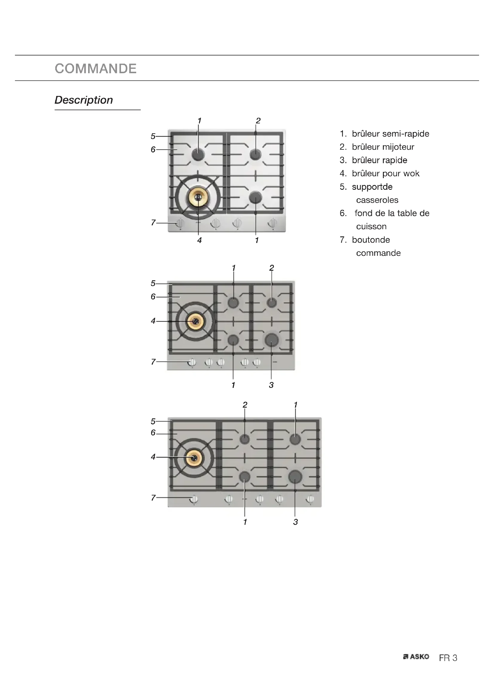 anneau pour wok brûleur brûleur pour wok grille petits fondsFR 6 ENTRETIEN Entretien Un entretien régulier, juste après utilisation, évite que les débordements d'aliments ne puissent s'incruster et causer des taches tenaces, difficiles à éliminer. Utilisez un détergent doux pour ce nettoyage. Commencez par nettoyer les boutons, les brûleurs et les supports, et ensuite seulement le fond de la table de cuisson. Vous évitez ainsi qu'elle ne se salisse de nouveau durant le nettoyage des autres composants. Attention ! Ne nettoyez jamais les composants des brûleurs dans un lave-vaisselle. Le détergent de lave-vaisselle peut endommager ces composants ! Fond de la table de cuisson en inox avec revêtement Les fonds de tables de cuisson dotés d'un revêtement « easy clean » se nettoient facilement au moyen d'un produit de nettoyage doux. N'utilisez pas de produits agressifs ! Ceux-ci peuvent endommager le revêtement. Taches tenaces sur l'émail (supports de casseroles, capuchons de brûleurs, fond de la table de cuisson) Nettoyez de préférence les taches tenaces avec un détergent liquide ou une éponge à récurer synthétique. N'utilisez jamais de poudre ou de tampon abrasif, d'ustensile acéré, ou de produits nettoyants agressifs. Pièces en laiton du brûleur wok Quelques pièces du brûleur pour wok sont en laiton. La cuisson au wok, avec ses températures élevées, causera une décoloration normale du laiton. Consultez le site web www.asko.com pour de plus amples instructions d'entretien et de nettoyage !FR 7 PANNES Tableau des pannes Le fait d'avoir un doute quant au bon fonctionnement de votre plaque de cuisson, ne signifie pas automatiquement qu'elle soit défectueuse. Vérifiez toujours les points énumérés au tableau suivant, ou consultez le site web 'www.asko.com' pour de plus amples informations.