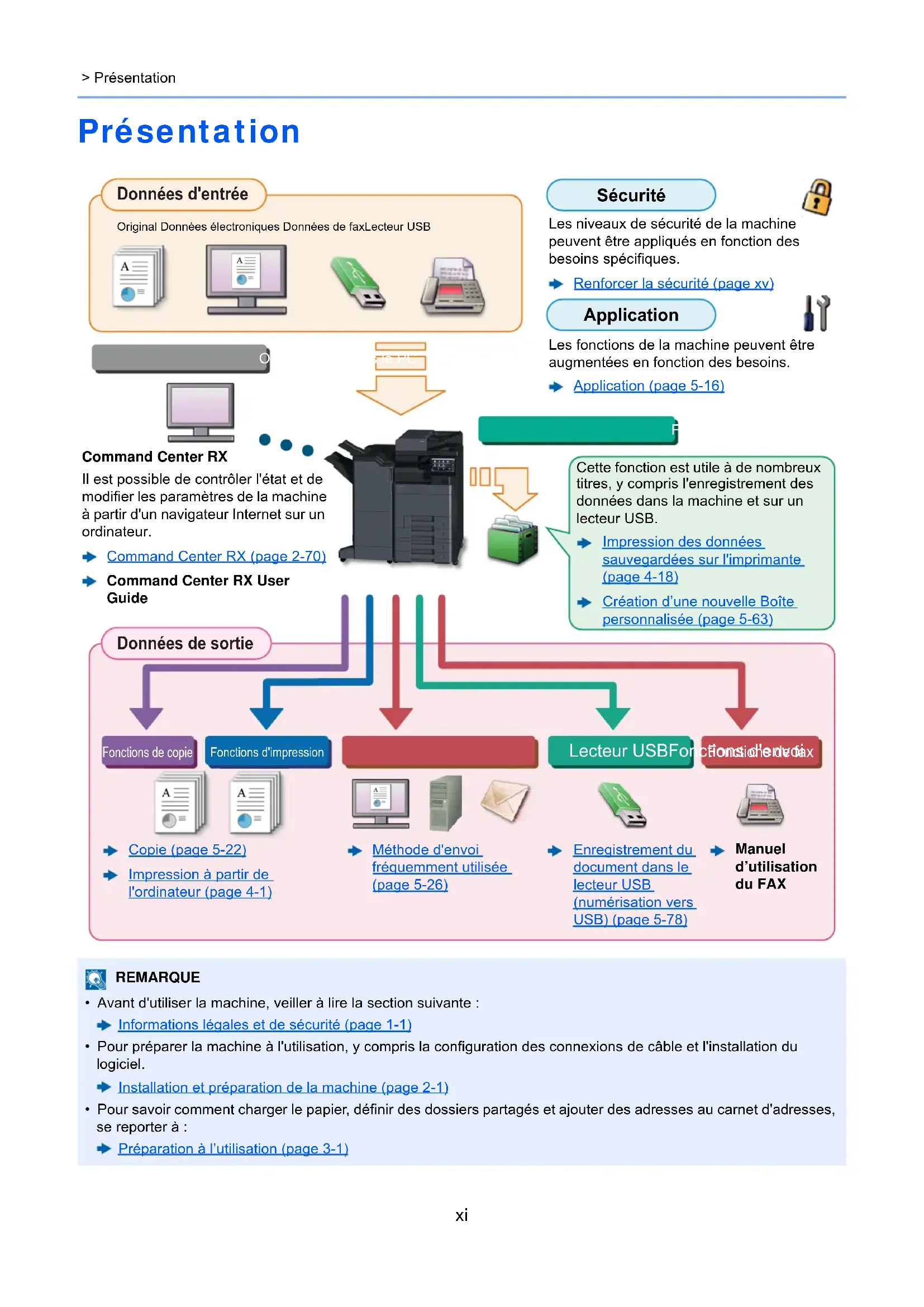 - Pour savoir comment charger le papier, définir des dossiers partagés et ajouter des adresses au carnet d'adresses, se reporter à :Préparation à l’utilisation (page 3-1) Opérations depuis le PCOpérations depuis le PC Fonctions de copie Fonctions d'impression Fonctions de fax Lecteur USBFonctions d'envoi Fonctions boîte de documentFonctions boîte de document Original Données électroniques Données de faxLecteur USB Données de sortie Données de sortie Application Sécurité Données d'entrée Données d'entrée Manuel d’utilisation du FAXCette fonction est utile à de nombreux titres, y compris l'enregistrement des données dans la machine et sur un lecteur USB.Impression des données sauvegardées sur l'imprimante (page 4-18)Création d’une nouvelle Boîte personnalisée (page 5-63)Les fonctions de la machine peuvent être augmentées en fonction des besoins.Application (page 5-16)Les niveaux de sécurité de la machine peuvent être appliqués en fonction des besoins spécifiques.Renforcer la sécurité (page xv)Méthode d'envoi fréquemment utilisée (page 5-26)Command Center RXIl est possible de contrôler l'état et de modifier les paramètres de la machine à partir d'un navigateur Internet sur un ordinateur.Command Center RX (page 2-70)Command Center RX User GuideCopie (page 5-22)Impression à partir de l'ordinateur (page 4-1)Enregistrement du document dans le lecteur USB (numérisation vers USB) (page 5-78)xii > Caractéristiques de la machine Caractéristiques de la machine La machine est dotée de nombreuses fonctions utiles. Utilisation de différentes fonctions (page 6-1) Voici quelques exemples. Optimiser le flux de travail au bureau Accéder aux fonctions courantes d'un simple geste (Favoris) Il est possible de prédéfinir des fonctions courantes. Lorsque des paramètres fréquemment utilisés sont enregistrés dans les favoris, il est possible de les rappeler facilement. L'utilisation de ce favoris apporte les mêmes résultats, même s'il est utilisé par une autre personne. Programme (page 5-12) Interrompre les autres travaux en cours d'exécution et exécuter immédiatement le travail de copie (Interruption de copie) Il est possible d'interrompre les autres travaux en cours d'exécution et d'exécuter immédiatement le travail de copie. Lorsque d'autres utilisateurs copient un grand nombre de feuilles, cette fonction permet d'interrompre ces travaux et d'effectuer des copies immédiatement. Lorsque l'interruption de copie se termine, la machine reprend les travaux d'impression en pause. Interruption de copie (page 5-25) Vérifier la finition avant de copier un grand nombre de feuilles (Copie épreuve) Il est possible d'effectuer la copie d'une feuille avant de copier un grand nombre de feuilles. Cela permet de vérifier le contenu et la finition et de copier le nombre de feuilles désiré sans numériser encore l'original si le résultat est satisfaisant. Pour effectuer des modifications, il est possible de modifier les paramètres et d'effectuer à nouveau la copie d'une seule feuille. Copie épreuve (page 5-24) Optimiser le flux de travail au bureau Numériser des originaux de formats différents en une seule fois (Originaux mixtes) Utile lors de la préparation des matériels de conférence. Il est possible de définir des originaux de formats différents en une seule fois afin de ne pas avoir à réinitialiser les originaux quel que soit leur format. Format d’originaux différents (page 6-21) Numériser un grand nombre d'originaux en lots séparés et produire un seul travail (Numérisation continue) Utile lors de la préparation de documents contenant de nombreuses pages. S’il n’est pas possible de placer un grand nombre d’originaux dans le chargeur de documents à la fois, il est possible de numériser les originaux dans des lots séparés puis de les copier ou envoyer dans un travail unique. Numérisation continue (page 6-74) Effectuer un seul envoi avec plusieurs options d'envoi (Envoi multiple) Il est possible d'envoyer un même document à plusieurs destinataires en utilisant une méthode différente. Il est possible de spécifier plusieurs destinataires aux méthodes d'envoi différentes comme E-mail, SMB et fax. Le flux de travail est ainsi réduit en envoyant le travail en une seule fois. Envoi vers différents types de destinataires (Envoi multiple) (page 5-44) 1~10