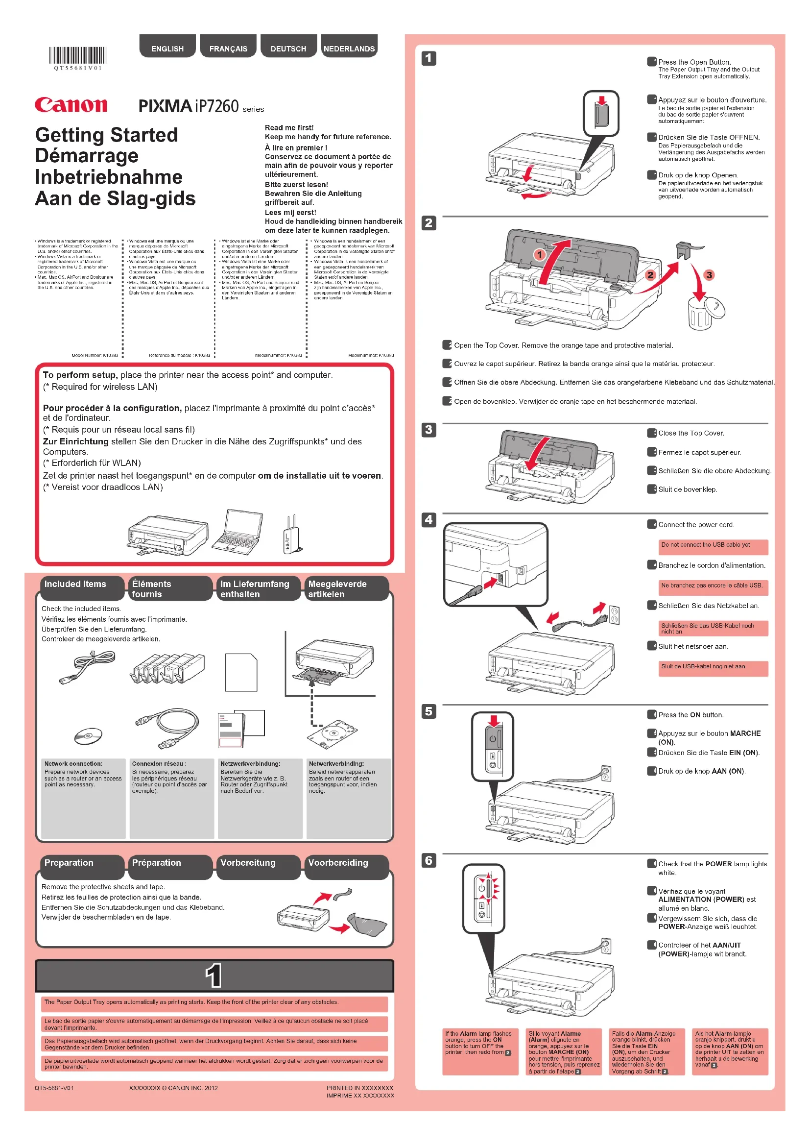 Vorbereitung Im Lieferumfang enthalten Öffnen Sie die obere Abdeckung. Entfernen Sie das orangefarbene Klebeband und das Schutzmaterial. Retirez les feuilles de protection ainsi que la bande.Vériez les éléments fournis avec l'imprimante.Connexion réseau :Si nécessaire, préparez les périphériques réseau (routeur ou point d'accès par exemple). Le bac de sortie papier s'ouvre automatiquement au démarrage de l'impression. Veillez à ce qu'aucun obstacle ne soit placé devant l'imprimante.Ne branchez pas encore le câble USB.Branchez le cordon d'alimentation. Appuyez sur le bouton MARCHE (ON).