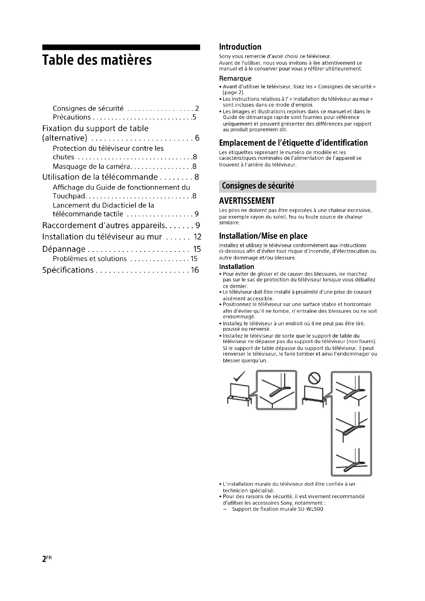 - Avant d’utiliser le téléviseur, lisez les « Consignes de sécurité » (page 2). • Les instructions relatives à l’ « Installation du téléviseur au mur » sont incluses dans ce mode d’emploi.• Les images et illustrations reprises dans ce manuel et dans le Guide de démarrage rapide sont fournies pour référence uniquement et peuvent présenter des différences par rapport au produit proprement dit. Emplacement de l’étiquette d’identification Les étiquettes reprenant le numéro de modèle et les caractéristiques nominales de l’alimentation de l’appareil se trouvent à l’arrière du téléviseur. AVERTISSEMENT Les piles ne doivent pas être exposées à une chaleur excessive, par exemple rayon du soleil, feu ou toute source de chaleur similaire. Installation/Mise en place Installez et utilisez le téléviseur conformément aux instructions ci-dessous afin d’éviter tout risque d’incendie, d’électrocution ou autre dommage et/ou blessure. Installation