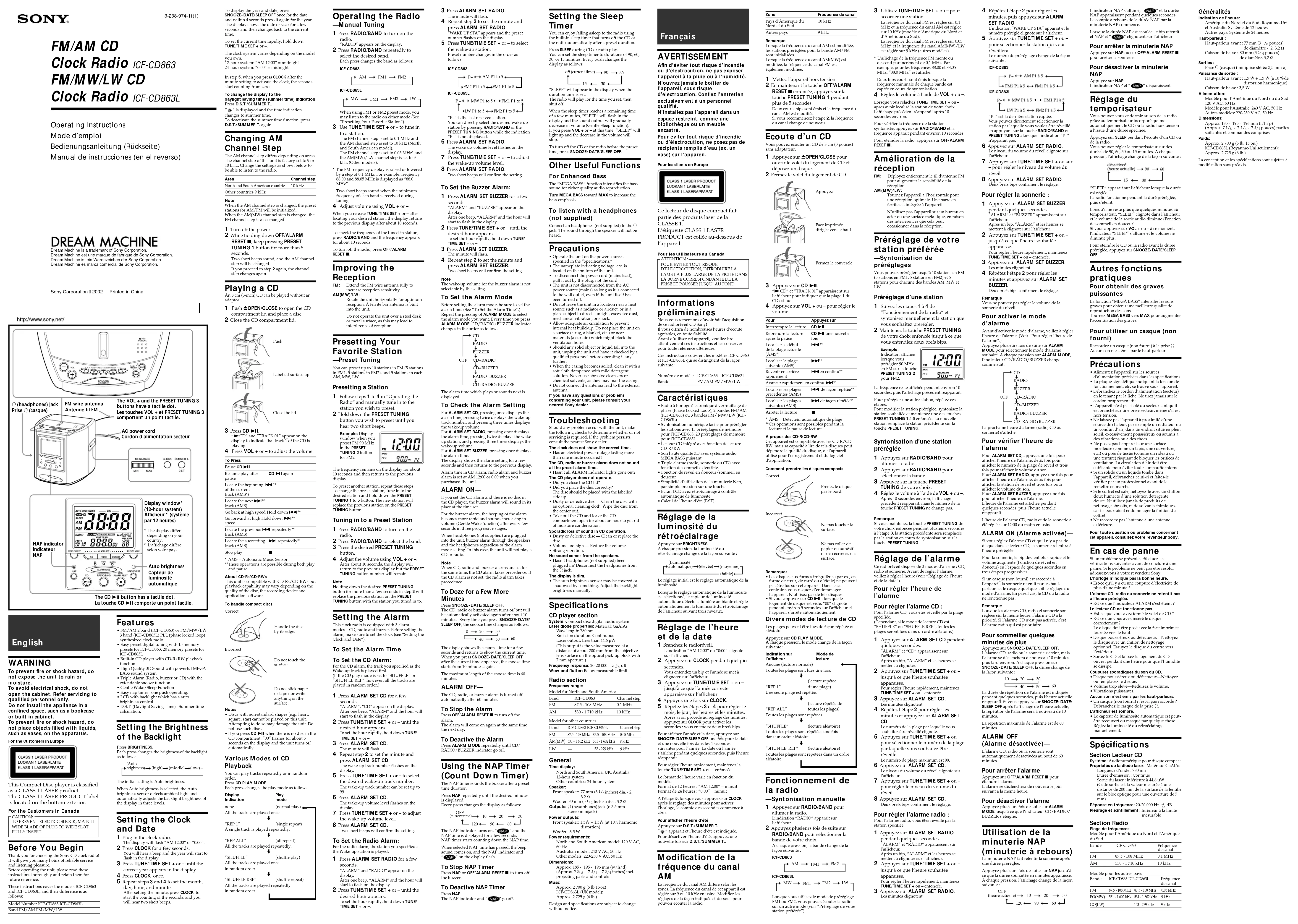 - Radio à horloge électronique à verrouillage de phase (Phase Locked Loop), 2 bandes FM/AM(ICF-CD863) ou 3 bandes FM/ MW/LW (ICF-CD863L)