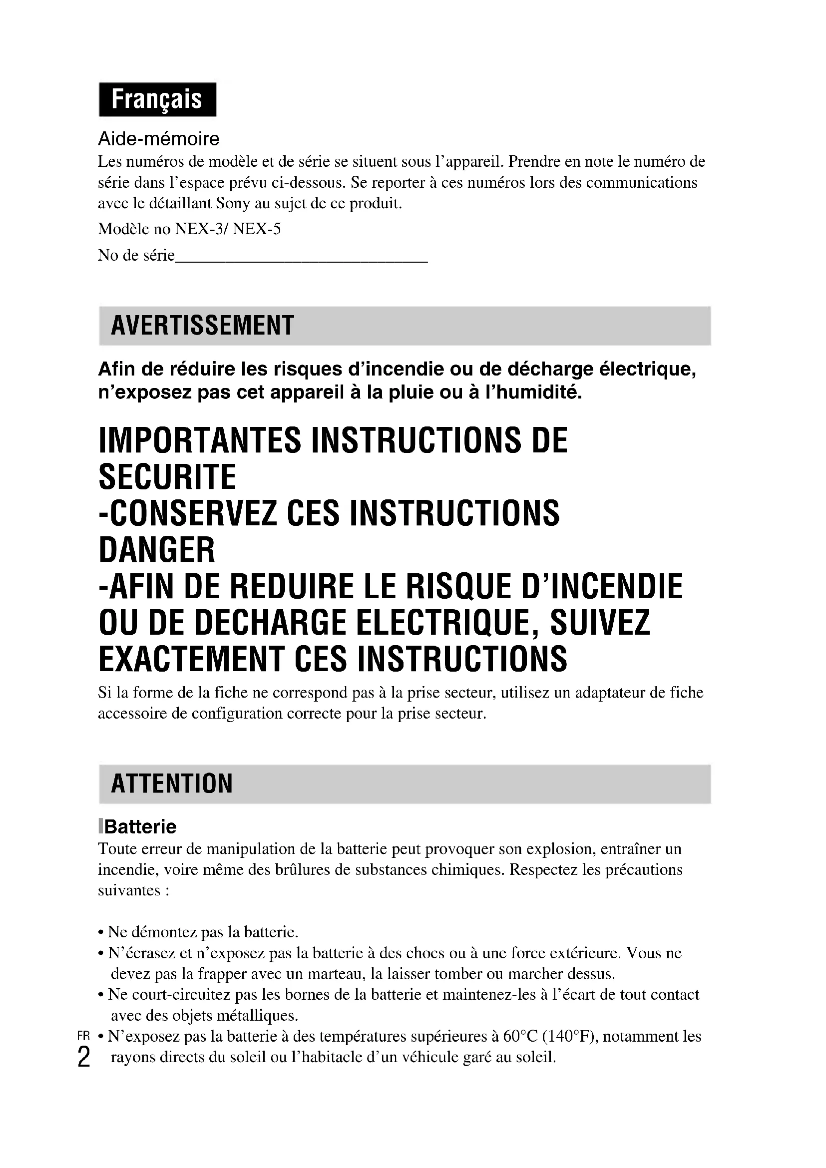 Aide-mémoire Les numéros de modèle et de série se situent sous l’appareil. Prendre en note le numéro de série dans l’espace prévu ci-dessous. Se reporter à ces numéros lors des communications avec le détaillant Sony au sujet de ce produit. Modèle no NEX-3/ NEX-5 No de série______________________________ Afin de réduire les risques d’incendie ou de décharge électrique, n’exposez pas cet appareil à la pluie ou à l’humidité.