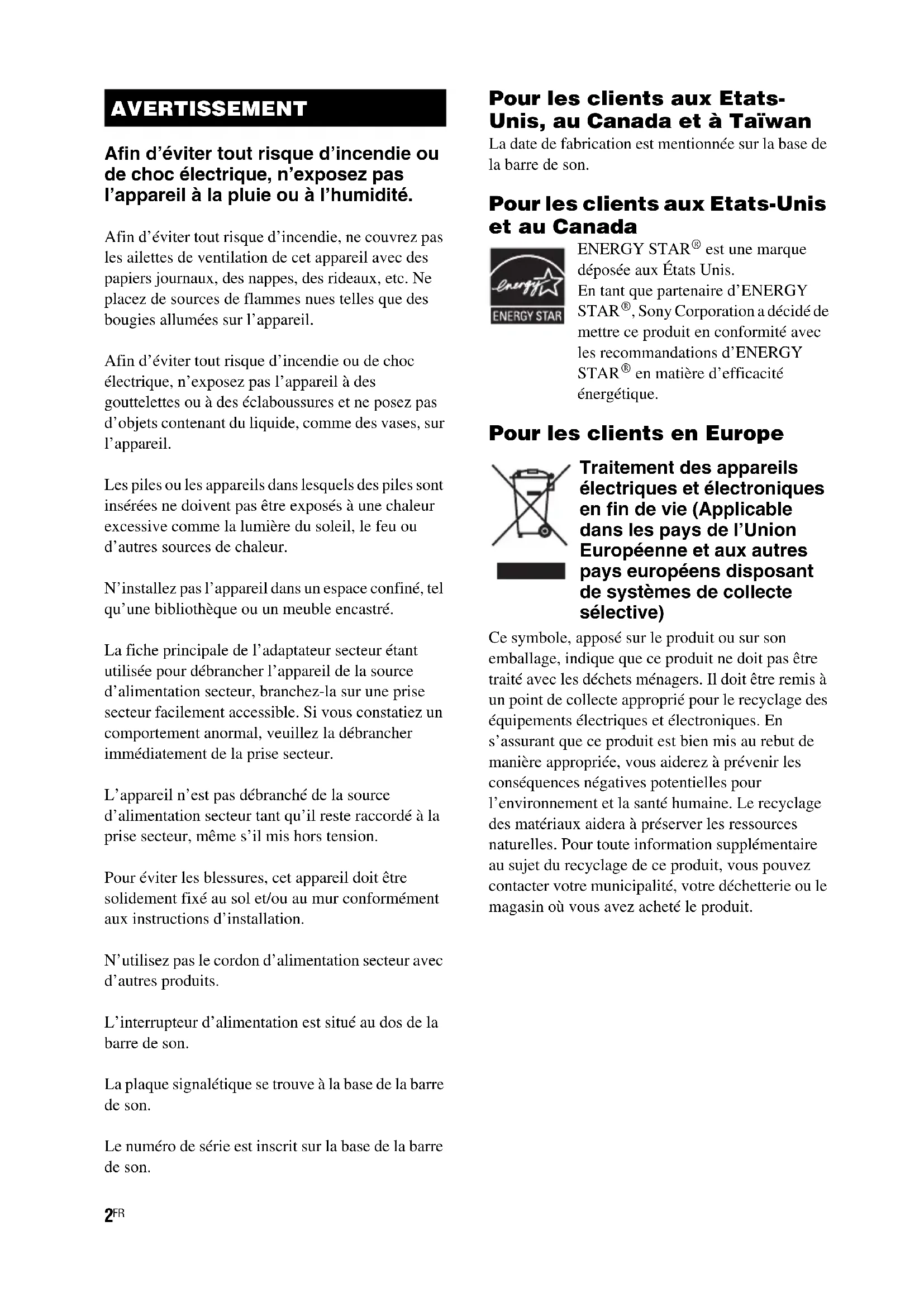 Afin d’éviter tout risque d’incendie ou de choc électrique, n’exposez pas l’appareil à la pluie ou à l’humidité. Afin d’éviter tout risque d’incendie, ne couvrez pas les ailettes de ventilation de cet appareil avec des papiers journaux, des nappes, des rideaux, etc. Ne placez de sources de flammes nues telles que des bougies allumées sur l’appareil. Afin d’éviter tout risque d’incendie ou de choc électrique, n’exposez pas l’appareil à des gouttelettes ou à des éclaboussures et ne posez pas d’objets contenant du liquide, comme des vases, sur l’appareil. Les piles ou les appareils dans lesquels des piles sont insérées ne doivent pas être exposés à une chaleur excessive comme la lumière du soleil, le feu ou d’autres sources de chaleur. N’installez pas l’appareil dans un espace confiné, tel qu’une bibliothèque ou un meuble encastré. La fiche principale de l’adaptateur secteur étant utilisée pour débrancher l’appareil de la source d’alimentation secteur, branchez-la sur une prise secteur facilement accessible. Si vous constatiez un comportement anormal, veuillez la débrancher immédiatement de la prise secteur. L’appareil n’est pas débranché de la source d’alimentation secteur tant qu’il reste raccordé à la prise secteur, même s’il mis hors tension. Pour éviter les blessures, cet appareil doit être solidement fixé au sol et/ou au mur conformément aux instructions d’installation. N’utilisez pas le cordon d’alimentation secteur avec d’autres produits. L’interrupteur d’alimentation est situé au dos de la barre de son. La plaque signalétique se trouve à la base de la barre de son. Le numéro de série est inscrit sur la base de la barre de son. Pour les clients aux Etats- Unis, au Canada et à Taïwan La date de fabrication est mentionnée sur la base de la barre de son. Pour les clients aux Etats-Unis et au Canada ENERGY STAR