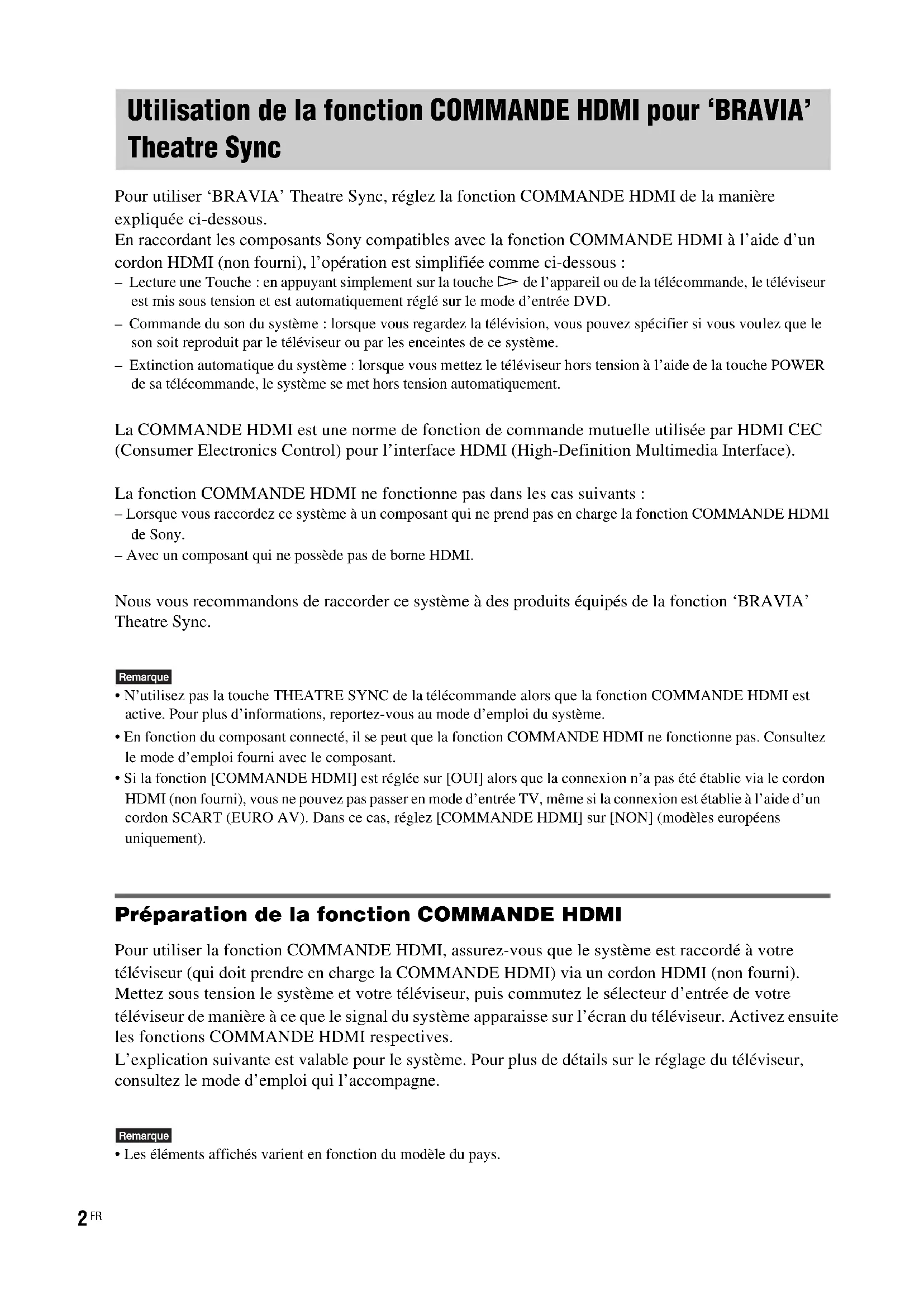Pour utiliser ‘BRAVIA’ Theatre Sync, réglez la fonction COMMANDE HDMI de la manière expliquée ci-dessous. En raccordant les composants Sony compatibles avec la fonction COMMANDE HDMI à l’aide d’un cordon HDMI (non fourni), l’opération est simplifiée comme ci-dessous : – Lecture une Touche : en appuyant simplement sur la touche H de l’appareil ou de la télécommande, le téléviseur est mis sous tension et est automatiquement réglé sur le mode d’entrée DVD. – Commande du son du système : lorsque vous regardez la télévision, vous pouvez spécifier si vous voulez que le son soit reproduit par le téléviseur ou par les enceintes de ce système. – Extinction automatique du système : lorsque vous mettez le téléviseur hors tension à l’aide de la touche POWER de sa télécommande, le système se met hors tension automatiquement. La COMMANDE HDMI est une norme de fonction de commande mutuelle utilisée par HDMI CEC (Consumer Electronics Control) pour l’interface HDMI (High-Definition Multimedia Interface). La fonction COMMANDE HDMI ne fonctionne pas dans les cas suivants : – Lorsque vous raccordez ce système à un composant qui ne prend pas en charge la fonction COMMANDE HDMI de Sony. – Avec un composant qui ne possède pas de borne HDMI. Nous vous recommandons de raccorder ce système à des produits équipés de la fonction ‘BRAVIA’ Theatre Sync. Remarque