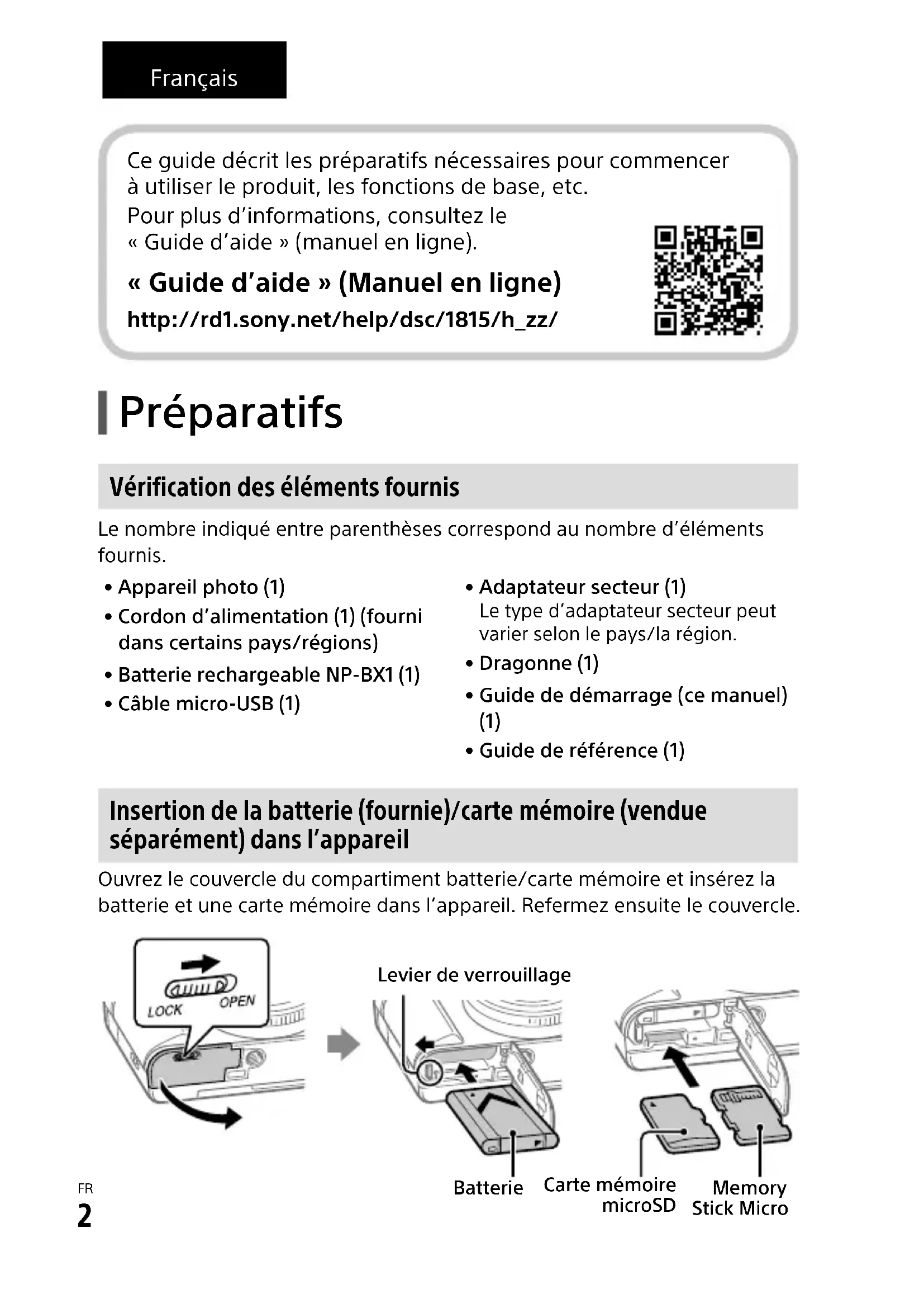 - Guide de référence (1) Insertion de la batterie (fournie)/carte mémoire (vendue séparément) dans l’appareil Ouvrez le couvercle du compartiment batterie/carte mémoire et insérez la batterie et une carte mémoire dans l’appareil. Refermez ensuite le couvercle.Carte mémoire microSD Memory Stick MicroBatterieLevier de verrouillage Ce guide décrit les préparatifs nécessaires pour commencer à utiliser le produit, les fonctions de base, etc. Pour plus d’informations, consultez le «Guide d’aide» (manuel en ligne). « Guide d’aide » (Manuel en ligne) http://rd1.sony.net/help/dsc/1815/h_zz/DSC-HX99/DSC-HX95/DSC-WX800/DSC-WX7004-746-011-31(1)