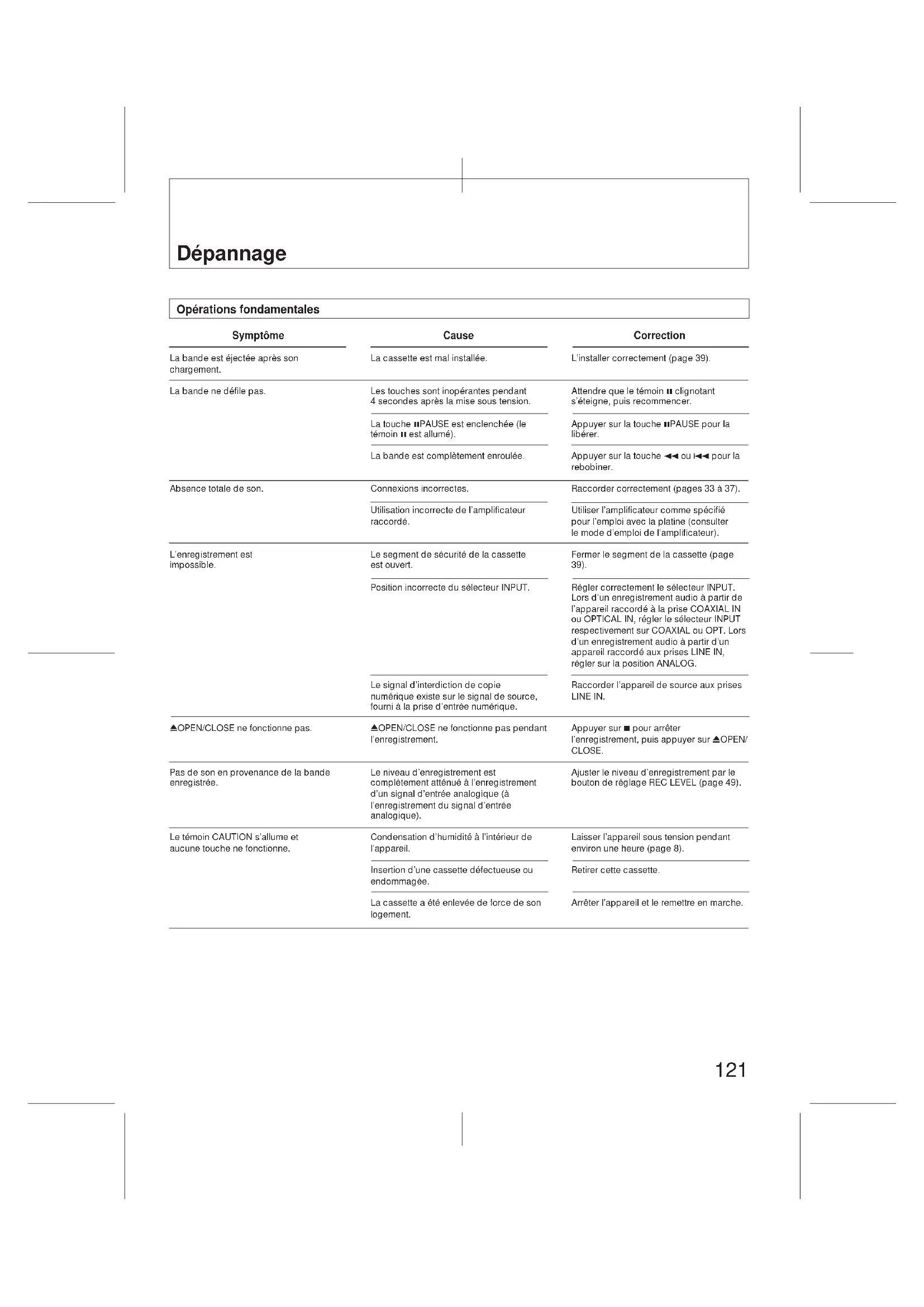 Press the 0OPEN/CLOSE button to change the tape. Adjust the recording balance correctly by using the REC LEVEL control. (page 48) Clean the head, using the cleaning tape. —121 Symptôme La bande est éjectée après son chargement. La bande ne défile pas. Absence totale de son. L’enregistrement est impossible. 0OPEN/CLOSE ne fonctionne pas. Pas de son en provenance de la bande enregistrée. Le témoin CAUTION s’allume et aucune touche ne fonctionne. Dépannage Cause La cassette est mal installée. Les touches sont inopérantes pendant 4 secondes après la mise sous tension. La touche 8PAUSE est enclenchée (le témoin 8 est allumé). La bande est complètement enroulée. Connexions incorrectes. Utilisation incorrecte de l’amplificateur raccordé. Le segment de sécurité de la cassette est ouvert. Position incorrecte du sélecteur INPUT. Le signal d’interdiction de copie numérique existe sur le signal de source, fourni à la prise d’entrée numérique. 0OPEN/CLOSE ne fonctionne pas pendant l’enregistrement. Le niveau d’enregistrement est complètement atténué à l’enregistrement d’un signal d’entrée analogique (à l’enregistrement du signal d’entrée analogique). Condensation d’humidité à l’intérieur de l’appareil. Insertion d’une cassette défectueuse ou endommagée. La cassette a été enlevée de force de son logement. Correction L’installer correctement (page 39). Attendre que le témoin 8 clignotant s’éteigne, puis recommencer. Appuyer sur la touche 8PAUSE pour la libérer. Appuyer sur la touche 1 ou 4 pour la rebobiner. Raccorder correctement (pages 33 à 37). Utiliser l’amplificateur comme spécifié pour l’emploi avec la platine (consulter le mode d’emploi de l’amplificateur). Fermer le segment de la cassette (page 39). Régler correctement le sélecteur INPUT. Lors d’un enregistrement audio à partir de l’appareil raccordé à la prise COAXIAL IN ou OPTICAL IN, régler le sélecteur INPUT respectivement sur COAXIAL ou OPT. Lors d’un enregistrement audio à partir d’un appareil raccordé aux prises LINE IN, régler sur la position ANALOG. Raccorder l’appareil de source aux prises LINE IN. Appuyer sur 7 pour arrêter l’enregistrement, puis appuyer sur 0OPEN/ CLOSE. Ajuster le niveau d’enregistrement par le bouton de réglage REC LEVEL (page 49). Laisser l’appareil sous tension pendant environ une heure (page 8). Retirer cette cassette. Arrêter l’appareil et le remettre en marche. Opérations fondamentales122 Emploi des sous-codes Symptôme Inscription de sous-codes impossible. Impossible d’entrer un ID de départ pendant l’enregistrement. La fonction de recherche n’agit pas pendant l’enregistrement. La fonction de recherche entre soudain en service pendant la lecture. La fonction de recherche s’arrête. Les touches d’exploitation de la bande ne fonctionnent pas pendant l’entrée du ID de départ. Impossible d’entrer les temps codés absolus. Impossible d’entrer le code ID de fin pendant la lecture. La fonction de renumérotation n’est pas opérationnelle. Le code ID de départ ne peut pas être effacé. Le code ID de saut ne peut pas être effacé. Le code ID de fin ne peut être effacé. Cause Une cassette dont le segment de sécurité est sur la position interdisant l’enregistrement se trouve dans l’appareil. Un nouveau code ID de départ ne peut pas être inscrit dans les 9 secondes (18 secondes en mode longue durée) à partir de la fin d’un autre ID de départ. Le code ID de départ n’a pas été entré correctement. La portion entre la fin d’un code ID de départ et le début du ID de départ suivant est inférieure à 9 secondes (18 secondes en mode longue durée). Le numéro de programme choisi n’existe pas sur la bande. Les numéros de programme ne sont pas dans l’ordre. La fonction de lecture à saut est en service (le témoin SKIP s'allume sur le panneau d’affichage). La fonction de lecture répétée est active Une portion vierge existe entre les plages (le témoin de fréquence d’échantillonnage clignote sur l’affichage). A l’entrée d’un code ID de départ (9 ou 18 secondes), seule la touche 7 fonctionne. L’enregistrement a été lancé à partir d’un passage vierge. La portion où l’on essaie d’entrer le code ID de fin est un espace vierge. La portion entre la fin d’un code ID de départ et le début du suivant dure moins de 9 secondes (18 secondes en mode longue durée). Deux codes ID de saut sont inscrits l'un à la suite de l'autre. Le code ID de fin est inscrit au début de la bande. Le code ID de fin est inscrit immédiatement après un ID de départ. Correction Insérer une cassette dont le segment se trouve sur la position autorisant l’enregistrement. (Page 39) Laisser au moins 9 secondes (18 secondes en mode longue durée) à partir de la fin d’un autre ID de départ. Effacer le code (page 69) et l’inscrire à nouveau. A l’entrée manuelle des codes ID de départ, les inscrire de sorte que les intervalles entre eux soient supérieurs à 9 secondes (18 secondes en mode longue durée). Utiliser la touche RENUMBER pour réarranger les numéros de programme (page 75). Eteindre ce témoin par poussée sur la touche SKIP PLAY. Eteindre le témoin par poussée sur la touche REPEAT 1/ALL. Utiliser la fonction de recherche de fin (page 55) à l’enregistrement pour ne laisser aucun passage vierge. Utiliser les touches après l’inscription de l’ID de départ. Rebobiner la bande à son début ou localiser le tout dernier point de l’enregistrement précédent en se servant de la fonction de recherche de fin (page