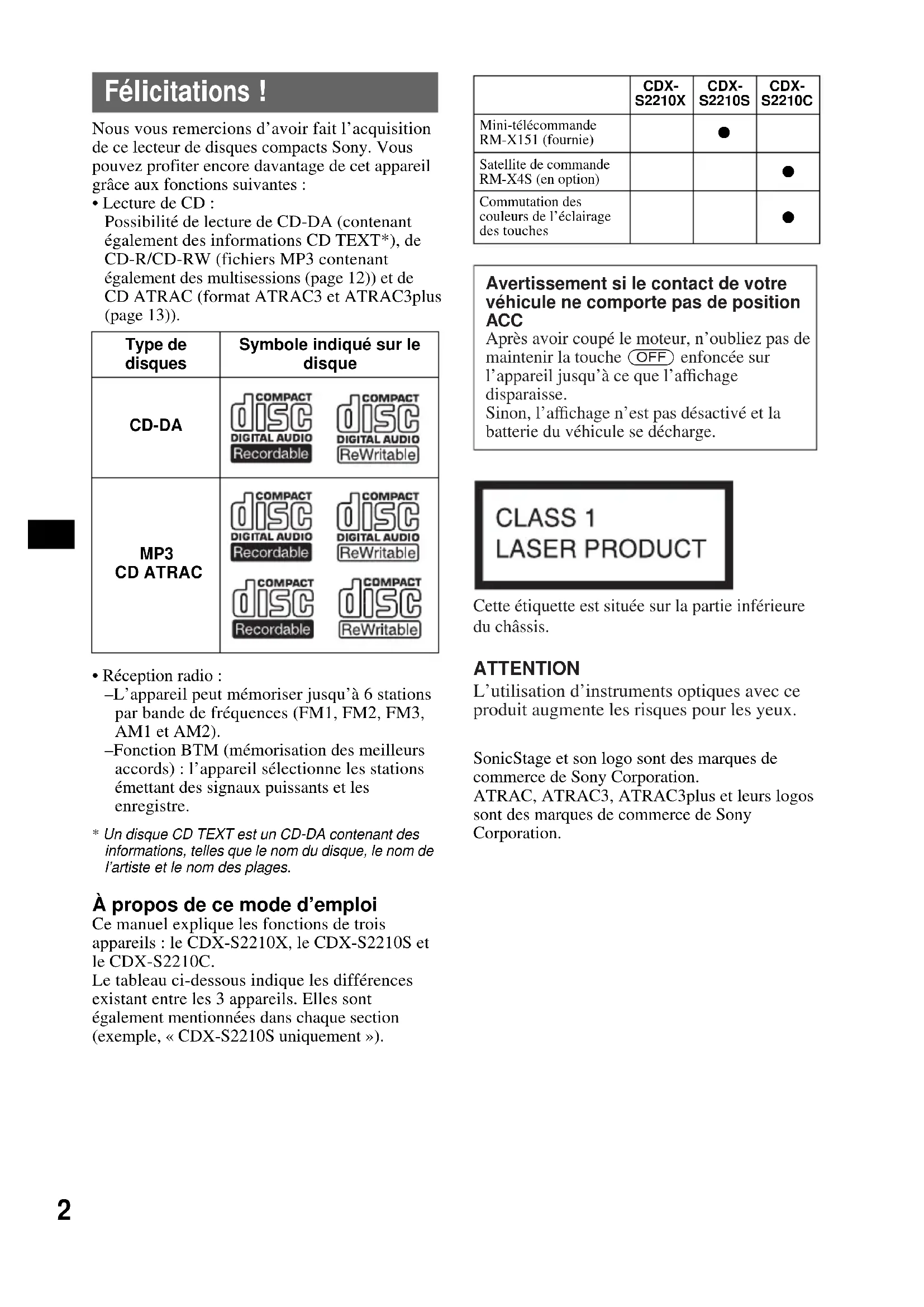 2-348-467-42 (1) H:\Data Disk\2348467421\234846742CDXS2210XE\04FR01INT-E.fm masterpage:Left Félicitations ! Nous vous remercions d’avoir fait l’acquisition de ce lecteur de disques compacts Sony. Vous pouvez profiter encore davantage de cet appareil grâce aux fonctions suivantes :• Lecture de CD :Possibilité de lecture de CD-DA (contenant également des informations CD TEXT*), de CD-R/CD-RW (fichiers MP3 contenant également des multisessions (page 12)) et de CD ATRAC (format ATRAC3 et ATRAC3plus (page 13)).• Réception radio :–L’appareil peut mémoriser jusqu’à 6 stations par bande de fréquences (FM1, FM2, FM3, AM1 et AM2).–Fonction BTM (mémorisation des meilleurs accords) : l’appareil sélectionne les stations émettant des signaux puissants et les enregistre.* Un disque CD TEXT est un CD-DA contenant des informations, telles que le nom du disque, le nom de l’artiste et le nom des plages. À propos de ce mode d’emploi Ce manuel explique les fonctions de trois appareils : le CDX-S2210X, le CDX-S2210S et le CDX-S2210C.Le tableau ci-dessous indique les différences existant entre les 3 appareils. Elles sont également mentionnées dans chaque section (exemple, « CDX-S2210S uniquement »).SonicStage et son logo sont des marques de commerce de Sony Corporation.ATRAC, ATRAC3, ATRAC3plus et leurs logos sont des marques de commerce de Sony Corporation.Type de disquesSymbole indiqué sur le disqueCD-DA MP3 CD ATRAC CDX- S2210X CDX- S2210S CDX- S2210CMini-télécommande RM-X151 (fournie) Satellite de commande RM-X4S (en option) Commutation des couleurs de l’éclairage des touches