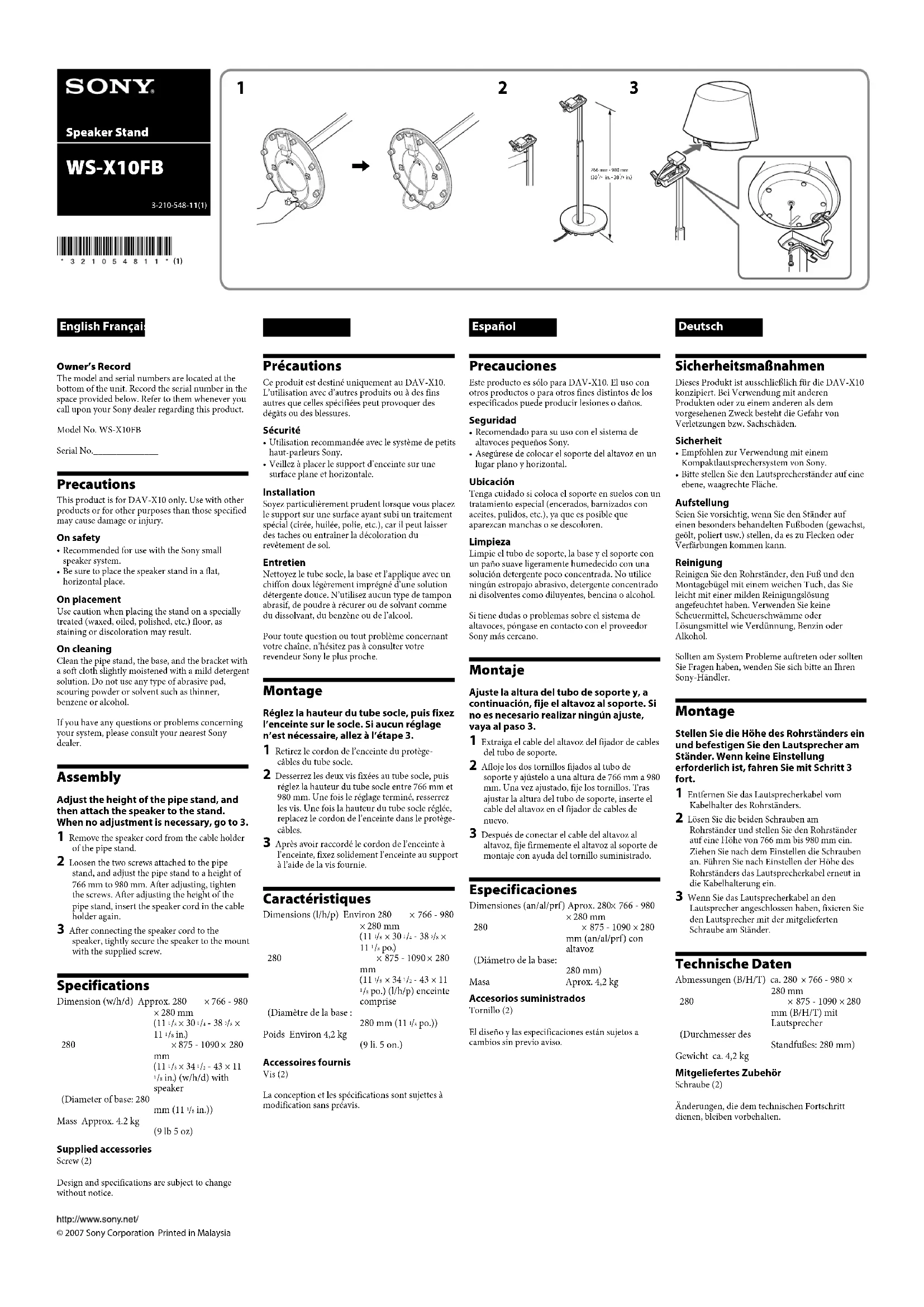 English Français Précautions Ce produit est destiné uniquement au DAV-X10. L’utilisation avec d’autres produits ou à des fins autres que celles spécifiées peut provoquer des dégâts ou des blessures. Sécurité Utilisation recommandée avec le système de petits haut-parleurs Sony.Veillez à placer le support d’enceinte sur une surface plane et horizontale. Installation Soyez particulièrement prudent lorsque vous placez le support sur une surface ayant subi un traitement spécial (cirée, huilée, polie, etc.), car il peut laisser des taches ou entraîner la décoloration du revêtement de sol. Entretien Nettoyez le tube socle, la base et l’applique avec un chiffon doux légèrement imprégné d’une solution détergente douce. N’utilisez aucun type de tampon abrasif, de poudre à récurer ou de solvant comme du dissolvant, du benzène ou de l’alcool.Pour toute question ou tout problème concernant votre chaîne, n’hésitez pas à consulter votre revendeur Sony le plus proche. Montage Réglez la hauteur du tube socle, puis fixez l’enceinte sur le socle. Si aucun réglage n’est nécessaire, allez à l’étape 3. 1 Retirez le cordon de l’enceinte du protège- câbles du tube socle. 2 Desserrez les deux vis fixées au tube socle, puis réglez la hauteur du tube socle entre 766 mm et 980 mm. Une fois le réglage terminé, resserrez les vis. Une fois la hauteur du tube socle réglée, replacez le cordon de l’enceinte dans le protège-câbles. 3 Après avoir raccordé le cordon de l’enceinte à l’enceinte, fixez solidement l’enceinte au support à l’aide de la vis fournie. Caractéristiques Dimensions (l/h/p) Environ 280