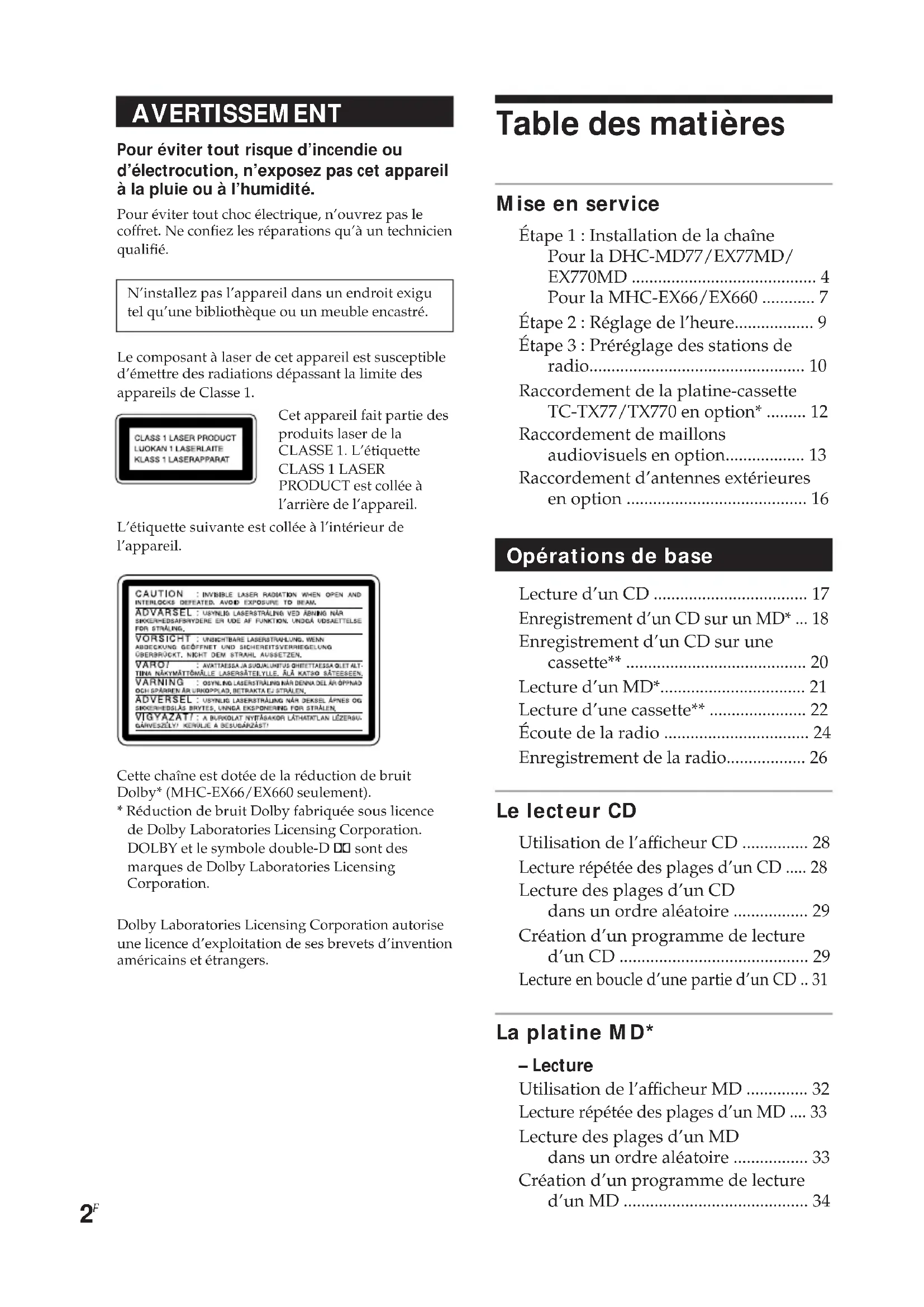 - AVERTISSEMENT Pour éviter tout risque d’incendie ou d’électrocution, n’exposez pas cet appareil à la pluie ou à l’humidité. Pour éviter tout choc électrique, n’ouvrez pas lecoffret. Ne confiez les réparations qu’à un technicienqualifié.N’installez pas l’appareil dans un endroit exigutel qu’une bibliothèque ou un meuble encastré.Le composant à laser de cet appareil est susceptibled’émettre des radiations dépassant la limite desappareils de Classe 1.L’étiquette suivante est collée à l’intérieur del’appareil.Cette chaîne est dotée de la réduction de bruitDolby* (MHC-EX66/EX660 seulement).* Réduction de bruit Dolby fabriquée sous licencede Dolby Laboratories Licensing Corporation.DOLBY et le symbole double-D a sont desmarques de Dolby Laboratories LicensingCorporation.Dolby Laboratories Licensing Corporation autoriseune licence d’exploitation de ses brevets d’inventionaméricains et étrangers. Table des matières Cet appareil fait partie desproduits laser de laCLASSE 1. L’étiquetteCLASS 1 LASERPRODUCT est collée àl’arrière de l’appareil. Mise en service Étape 1 : Installation de la chaîne Pour la DHC-MD77/EX77MD/ EX770MD p. 4