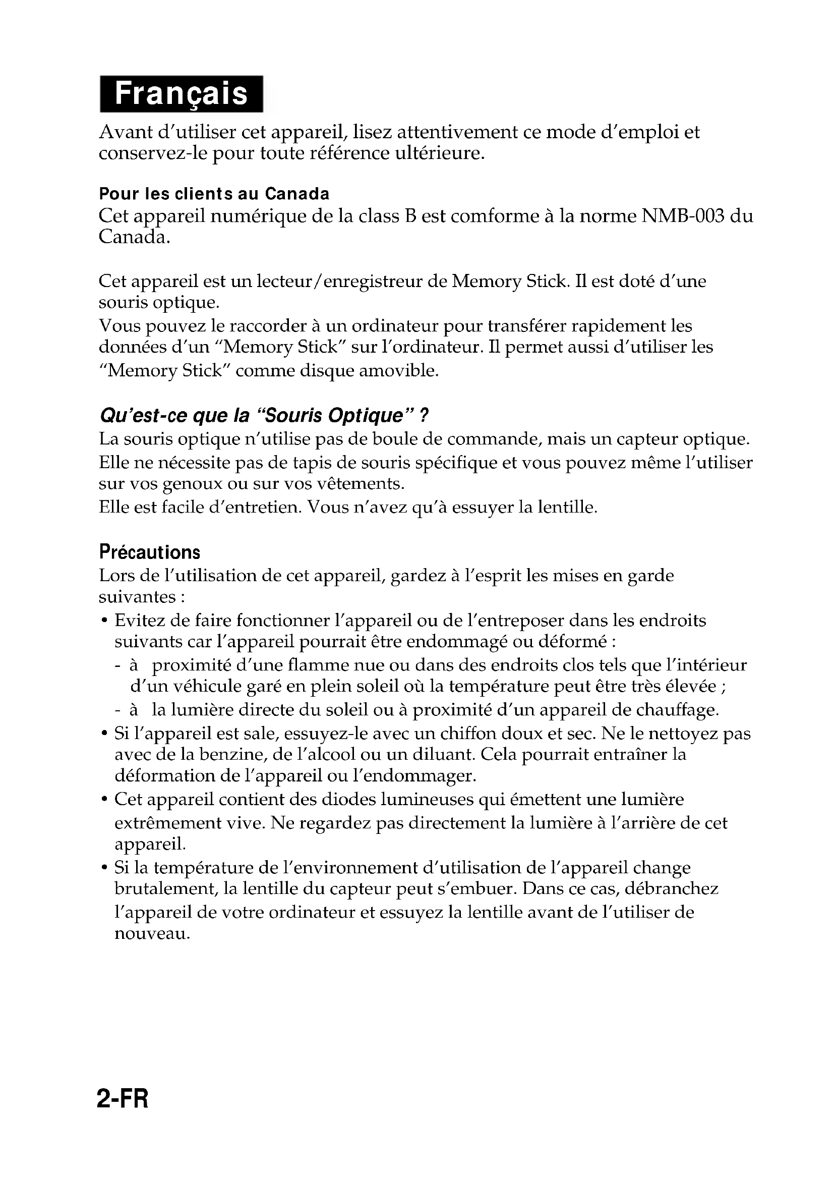 - Other equipment required: a CD-ROM drive. Specifications (continued)2-FR Français Avant d’utiliser cet appareil, lisez attentivement ce mode d’emploi et conservez-le pour toute référence ultérieure. Pour les clients au Canada Cet appareil numérique de la class B est comforme à la norme NMB-003 du Canada. Cet appareil est un lecteur/enregistreur de Memory Stick. Il est doté d’une souris optique. Vous pouvez le raccorder à un ordinateur pour transférer rapidement les données d’un “Memory Stick” sur l’ordinateur. Il permet aussi d’utiliser les “Memory Stick” comme disque amovible. Qu’est-ce que la “Souris Optique” ? La souris optique n’utilise pas de boule de commande, mais un capteur optique. Elle ne nécessite pas de tapis de souris spécifique et vous pouvez même l’utiliser sur vos genoux ou sur vos vêtements. Elle est facile d’entretien. Vous n’avez qu’à essuyer la lentille. Précautions Lors de l’utilisation de cet appareil, gardez à l’esprit les mises en garde suivantes :