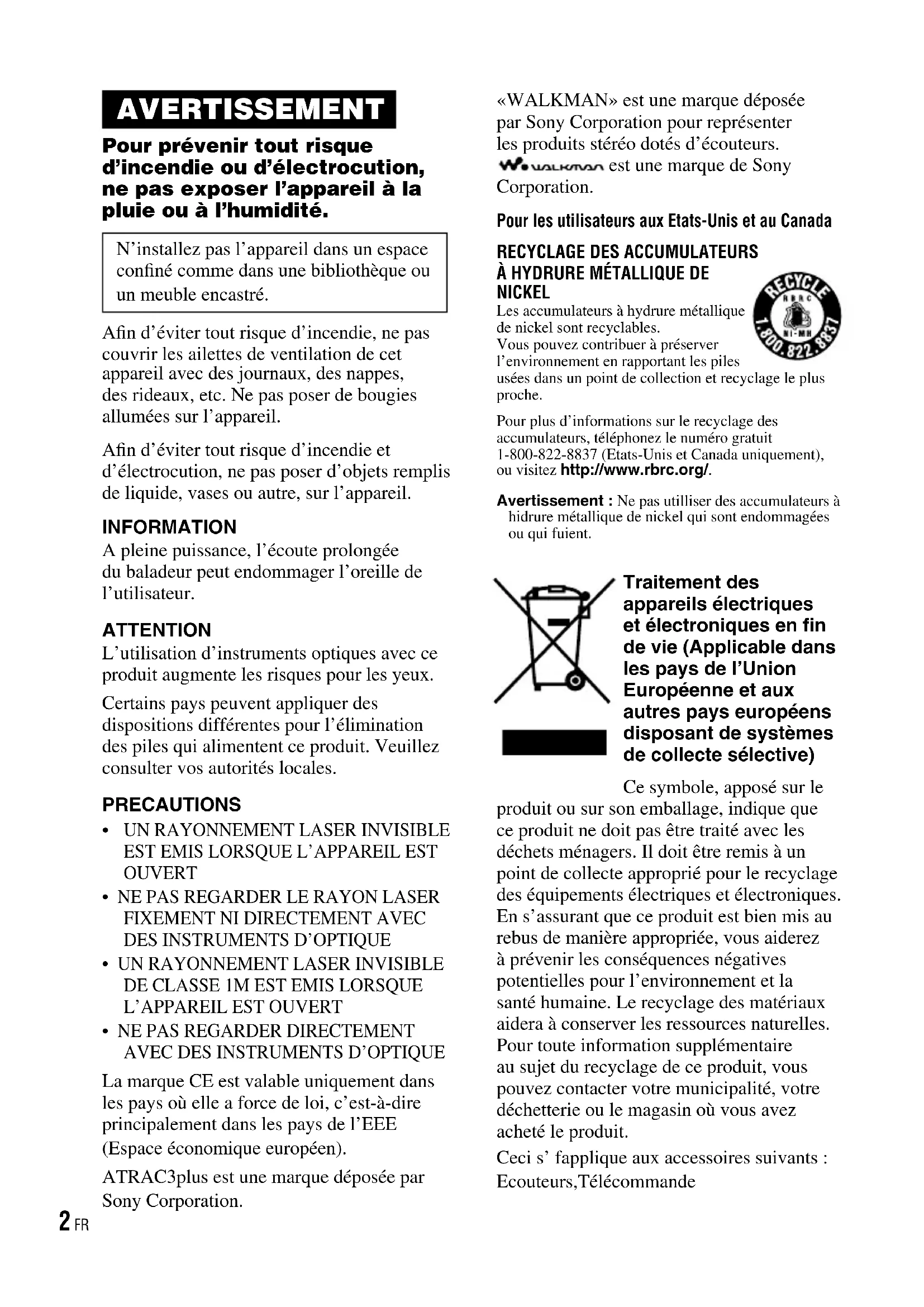 La marque CE est valable uniquement dans les pays où elle a force de loi, c’est-à-dire principalement dans les pays de l’EEE (Espace économique européen). ATRAC3plus est une marque déposée par Sony Corporation. «WALKMAN» est une marque déposée par Sony Corporation pour représenter les produits stéréo dotés d’écouteurs. est une marque de Sony Corporation. Pour les utilisateurs aux Etats-Unis et au CanadaRECYCLAGE DES ACCUMULATEURS À HYDRURE MÉTALLIQUE DE NICKELLes accumulateurs à hydrure métallique de nickel sont recyclables.Vous pouvez contribuer à préserver l’environnement en rapportant les piles usées dans un point de collection et recyclage le plus proche.Pour plus d’informations sur le recyclage des accumulateurs, téléphonez le numéro gratuit 1-800-822-8837 (Etats-Unis et Canada uniquement), ou visitez http://www.rbrc.org/.Avertissement : Ne pas utilliser des accumulateurs à hidrure métallique de nickel qui sont endommagées ou qui fuient. Traitement des appareils électriques et électroniques en fin de vie (Applicable dans les pays de l’Union Européenne et aux autres pays européens disposant de systèmes de collecte sélective) Ce symbole, apposé sur le produit ou sur son emballage, indique que ce produit ne doit pas être traité avec les déchets ménagers. Il doit être remis à un point de collecte approprié pour le recyclage des équipements électriques et électroniques. En s’assurant que ce produit est bien mis au rebus de manière appropriée, vous aiderez à prévenir les conséquences négatives potentielles pour l’environnement et la santé humaine. Le recyclage des matériaux aidera à conserver les ressources naturelles. Pour toute information supplémentaire au sujet du recyclage de ce produit, vous pouvez contacter votre municipalité, votre déchetterie ou le magasin où vous avez acheté le produit. Ceci s’ fapplique aux accessoires suivants : Ecouteurs,Télécommande D-NE720/NE720LS.FR.2-541-637-23(1) 2 FRLe mode d’emploi décrit l’utilisation du lecteur CD. Pour l’utilisation du logiciel SonicStage fourni, référez-vous au « Guide d’installation/utilisation ». Remarques à l’attention des utilisateurs Concernant le logiciel fourniEn fonction du type de texte et des caractères, il se peut que le texte affiché sur SonicStage ne s’affiche pas correctement sur le périphérique. Les causes de ce problème sont :– Les limites du lecteur connecté.– Un fonctionnement anormal du lecteur.Les instructions de ce manuel décrivent essentiellement les commandes de la télécommande.En fonction de l’endroit où vous utilisez le lecteur, il se peut que les indications affichées sur la télécommande soient légèrement différentes de celles affichées dans le mode d’emploi.