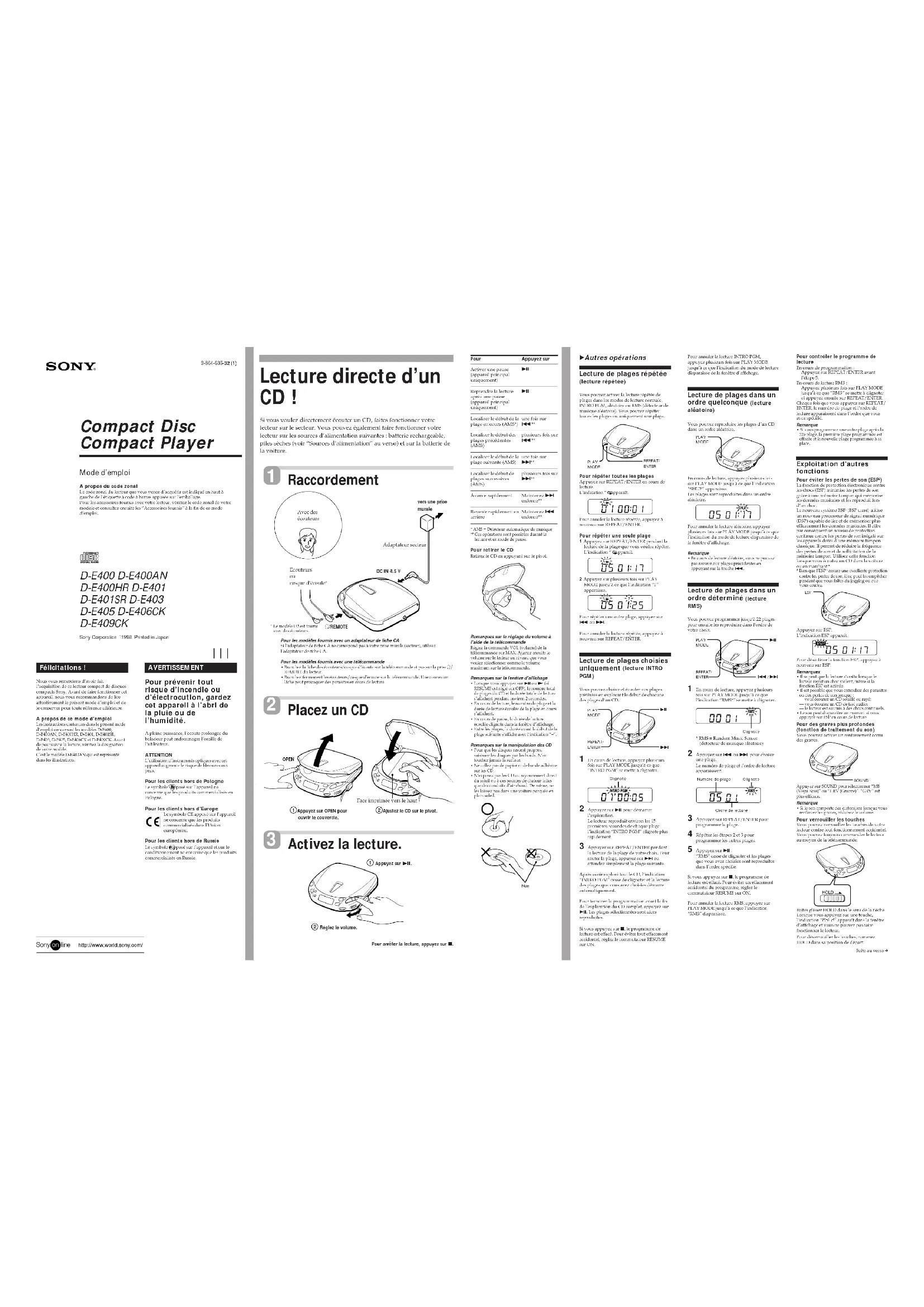 une fois sur=**plusieurs fois sur=**une fois sur+**plusieurs fois sur+**Maintenez +enfoncé**Maintenez =enfoncé**Face imprimée vers le haut Félicitations ! Nous vous remercions d’avoir faitl’acquisition de ce lecteur compact de disquescompacts Sony. Avant de faire fonctionner cetappareil, nous vous recommandons de lireattentivement le présent mode d’emploi et dele conserver pour toute référence ultérieure.A propos de ce mode d’emploiLes instructions contenues dans le présent moded’emploi concernent les modèles D-E400,D-E400AN, D-E400HR, D-E401, D-E401SR,D-E403, D-E405, D-E406CK et D-E409CK. Avantde poursuivre la lecture, vérifiez la désignationde votre modèle.C’est le modèle D-E400AN qui est représentédans les illustrations.Sony Corporation 1998 Printed in Japan D-E400 D-E400AN D-E400HR D-E401 D-E401SR D-E403 D-E405 D-E406CK D-E409CKEntretien Pour nettoyer la lentille Nettoyez la lentille à l’aide d’un kit de nettoyagepour lentille KK-DM1. Pour nettoyer le boîtier Utilisez un chiffon doux légèrement humide ouimprégné d’une solution détergente neutre.N’utilisez pas d’alcool, de benzine ou de diluant. Dépannage Si le problème persiste après avoir passé en revueles vérifications suivantes, consultez votrerevendeur Sony. La lecture du CD ne démarre pas ou l’indication “no dlSC” apparaît dans la fenêtre d’affichage alors qu’un CD se trouve à l’intérieur de l’appareil. m Le CD est souillé ou défectueux.m Introduisez le CD avec la face impriméevers le haut.m De l’humidité s’est condensée à l’intérieurde l’appareil.Laissez l’appareil pendant quelques heuresjusqu’à ce que l’humidité se soit évaporée.m La lentille est souillée.m Refermez fermement le couvercle del’appareil et le compartiment à piles.m Assurez-vous que les piles ont étécorrectement installées.m Branchez fermement l’adaptateur secteursur une prise murale (secteur). Lorsque vous appuyez sur ^, l’indication “00” apparaît dans la fenêtre d’affichage pendant un moment, puis disparaît. La lecture du CD ne démarre pas. m La batterie rechargeable ou les piles sèchessont à plat. Chargez la batterierechargeable ou remplacez les piles sèches. Pas de son, ou des parasites sont audibles. m Branchez fermement les fiches.m Les fiches sont souillées. Nettoyezpériodiquement les fiches avec un chiffondoux et sec. L’indication “Hl dc ln” apparaît dans la fenêtre d’affichage m Utilisez uniquement l’adaptateur secteurfourni ou l’adaptateur secteur AC-E45HGpréconisé (non fourni). L’indication “Hold” apparaît dans la fenêtre d’affichage lorsque vous appuyez sur une touche. m Les touches sont verrouillées. RamenezHOLD dans sa position de départ. L’indication “Lo ba ” apparaît dans la fenêtre d’affichage lorsque vous appuyez sur une touche. m La batterie rechargeable est complètementà plat. Branchez l’adaptateur secteur etchargez la batterie.m Les piles sèches sont à plat. Remplacez-les. L’autonomie d’alimentation est réduite. m Les piles au manganèse sont épuisées.Utilisez les piles alcalines.m Remplacez les piles. Le volume est limité à un certain niveau même lorsque vous essayez de l’augmenter. m Le sélecteur AVLS est réglé sur LIMIT.Réglez-le sur NORM. Pour vous protéger l’ouïe (AVLS) La fonction de limitation automatique du volume AVLS (Automatic Volume Limiter System) réduit le volume maximum afin de vous protéger l’ouïe. Réglez AVLS sur LIMIT. L’indication AVLS apparaît. Remarque