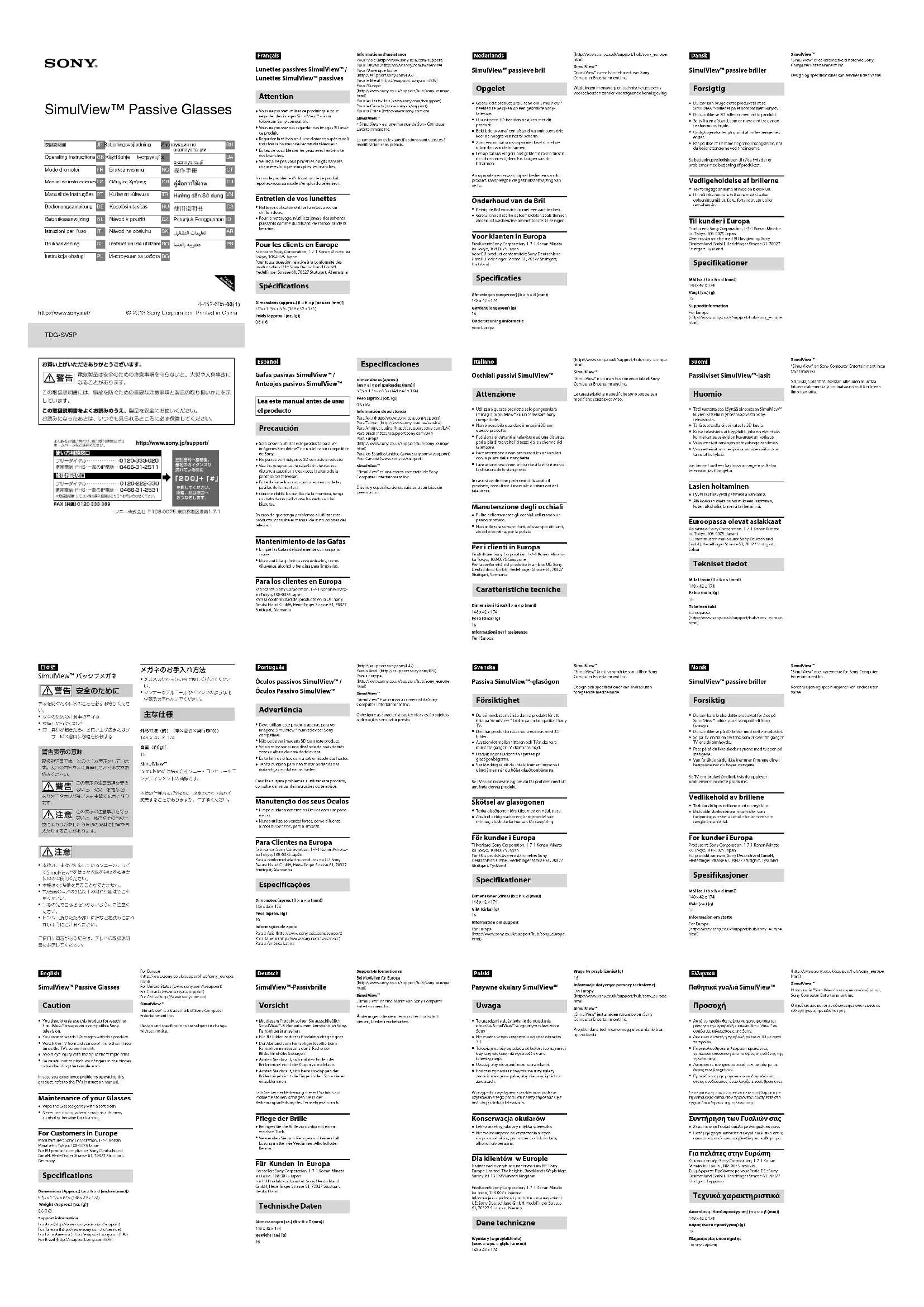 Nettoyez délicatement les lunettes avec un chiffon doux. Pour le nettoyage, n’utilisez jamais des solvants puissants comme du diluant, de l’alcool ou de la benzine. Pour les clients en Europe Fabricant: Sony Corporation, 1-7-1 Konan Minato-ku Tokyo, 108-0075 JaponPour toute question relative à la conformité des produits dans l’UE: Sony Deutschland GmbH, Hedelfinger Strasse 61, 70327 Stuttgart, Allemagne Spécifications Dimensions (approx.) (l × h × p [pouces (mm)]) / x 1 / x 6 / (148 x 42 x 174)Poids (approx.) [oz. (g)]0,6 (16)Informations d’assistancePour l’Asie (http://www.sony-asia.com/support)Pour Taiwan (http://www.sony.com.tw/service)Pour l'Amérique latine (http://esupport.sony.com/LA/)Pour le Brésil (http://esupport.sony.com/BR/)Pour l’Europe (http://www.sony.co.uk/support/hub/sony_europe.html)Pour les États-Unis (www.sony.com/tvsupport)Pour le Canada (www.sony.ca/support)Pour la Chine (http://www.sony.com.cn)SimulView™« SimulView » est une marque de Sony Computer Entertainment Inc.La conception et les spécifications sont sujettes à modification sans préavis.Nederlands SimulView™ passieve bril Opgelet
