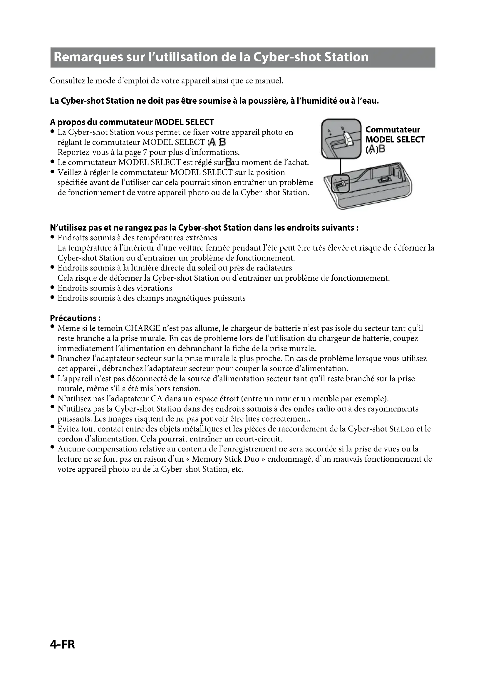 - Spécifications -FR Remarques sur l’utilisation de la Cyber-shot Station Consultez le mode d’emploi de votre appareil ainsi que ce manuel. La Cyber-shot Station ne doit pas être soumise à la poussière, à l’humidité ou à l’eau. A propos du commutateur MODEL SELECT La Cyber-shot Station vous permet de fixer votre appareil photo en réglant le commutateur MODEL SELECT ( , ). Reportez-vous à la page 7 pour plus d’informations. Le commutateur MODEL SELECT est réglé sur au moment de l’achat. Veillez à régler le commutateur MODEL SELECT sur la position spécifiée avant de l’utiliser car cela pourrait sinon entraîner un problème de fonctionnement de votre appareil photo ou de la Cyber-shot Station. p. 124