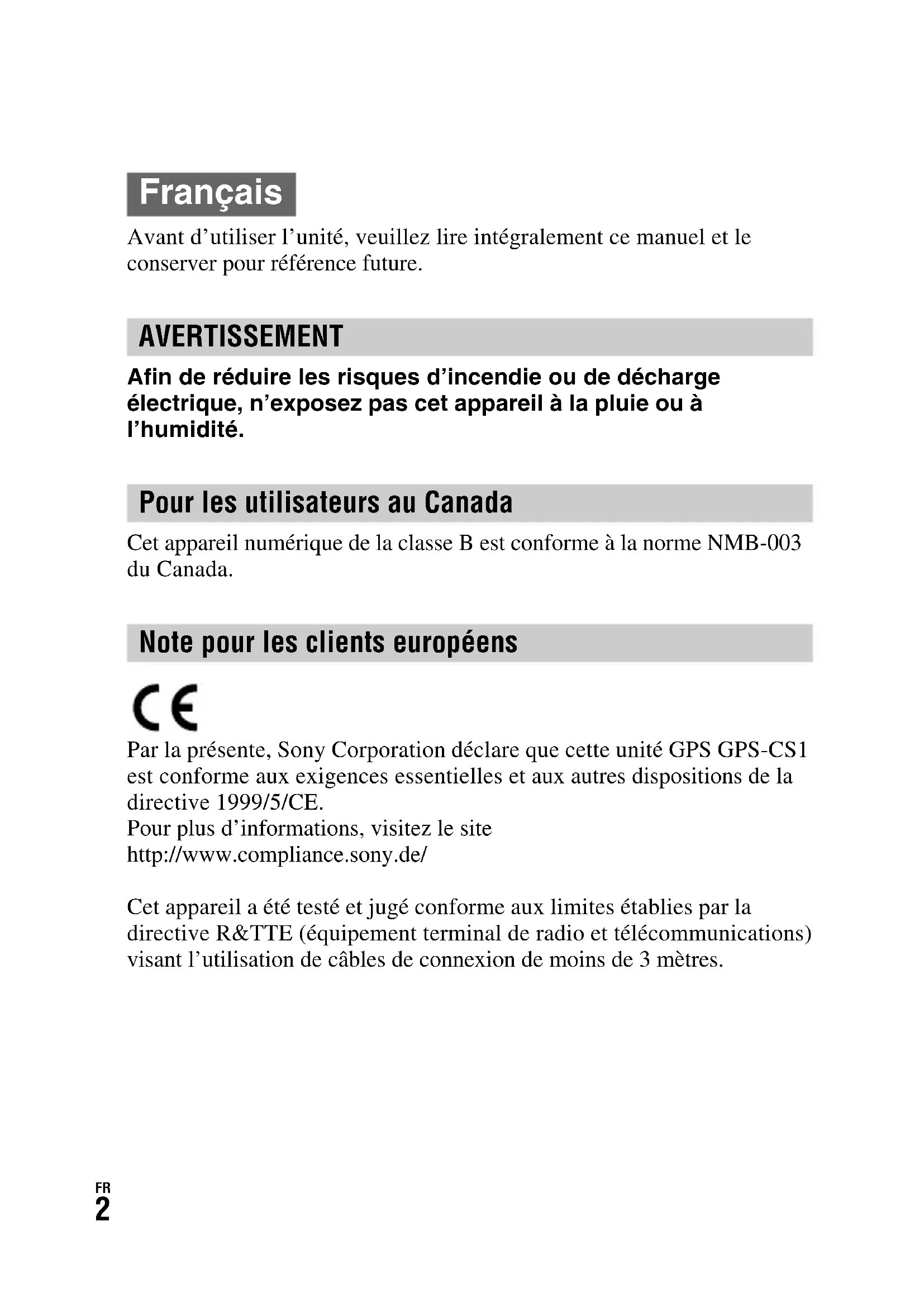 Avant d’utiliser l’unité, veuillez lire intégralement ce manuel et le conserver pour référence future. Afin de réduire les risques d’incendie ou de décharge électrique, n’exposez pas cet appareil à la pluie ou à l’humidité. Cet appareil numérique de la classe B est conforme à la norme NMB-003 du Canada. Par la présente, Sony Corporation déclare que cette unité GPS GPS-CS1 est conforme aux exigences essentielles et aux autres dispositions de la directive 1999/5/CE. Pour plus d’informations, visitez le site http://www.compliance.sony.de/ Cet appareil a été testé et jugé conforme aux limites établies par la directive R&TTE (équipement terminal de radio et télécommunications) visant l’utilisation de câbles de connexion de moins de 3 mètres. Français AVERTISSEMENT Pour les utilisateurs au Canada Note pour les clients européensFR