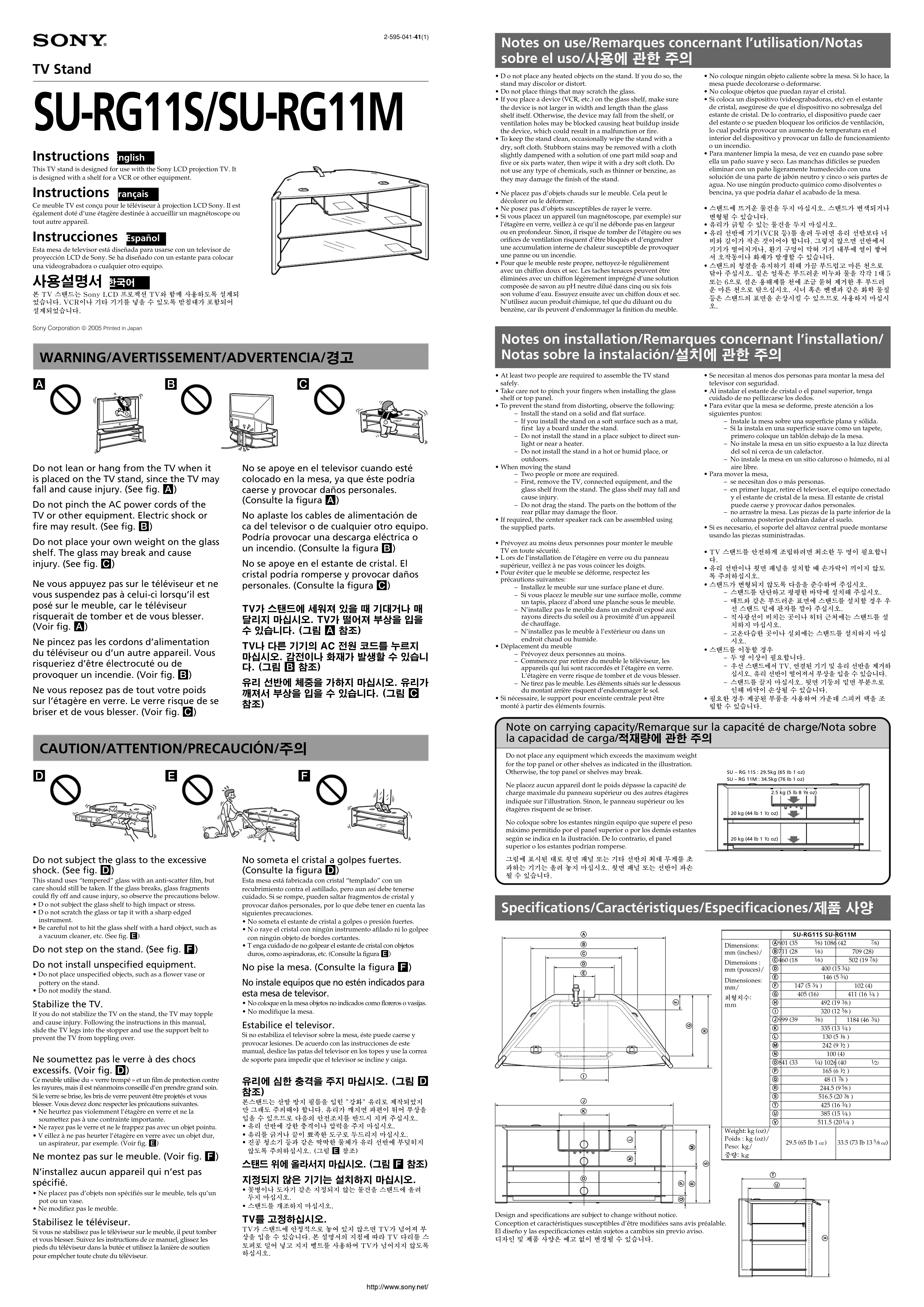 - Ne modifiez pas le meuble. Stabilisez le téléviseur. Si vous ne stabilisez pas le téléviseur sur le meuble, il peut tomber et vous blesser. Suivez les instructions de ce manuel, glissez les pieds du téléviseur dans la butée et utilisez la lanière de soutien pour empêcher toute chute du téléviseur. Do not place any equipment which exceeds the maximum weight for the top panel or other shelves as indicated in the illustration. Otherwise, the top panel or shelves may break. Ne placez aucun appareil dont le poids dépasse la capacité de charge maximale du panneau supérieur ou des autres étagères indiquée sur l’illustration. Sinon, le panneau supérieur ou les étagères risquent de se briser. No coloque sobre los estantes ningún equipo que supere el peso máximo permitido por el panel superior o por los demás estantes según se indica en la ilustración. De lo contrario, el panel superior o los estantes podrían romperse. 그림에 표시된 대로 윗면 패널 또는 기타 선반의 최대 무게를 초 과하는 기기는 올려 놓지 마십시오. 윗면 패널 또는 선반이 파손