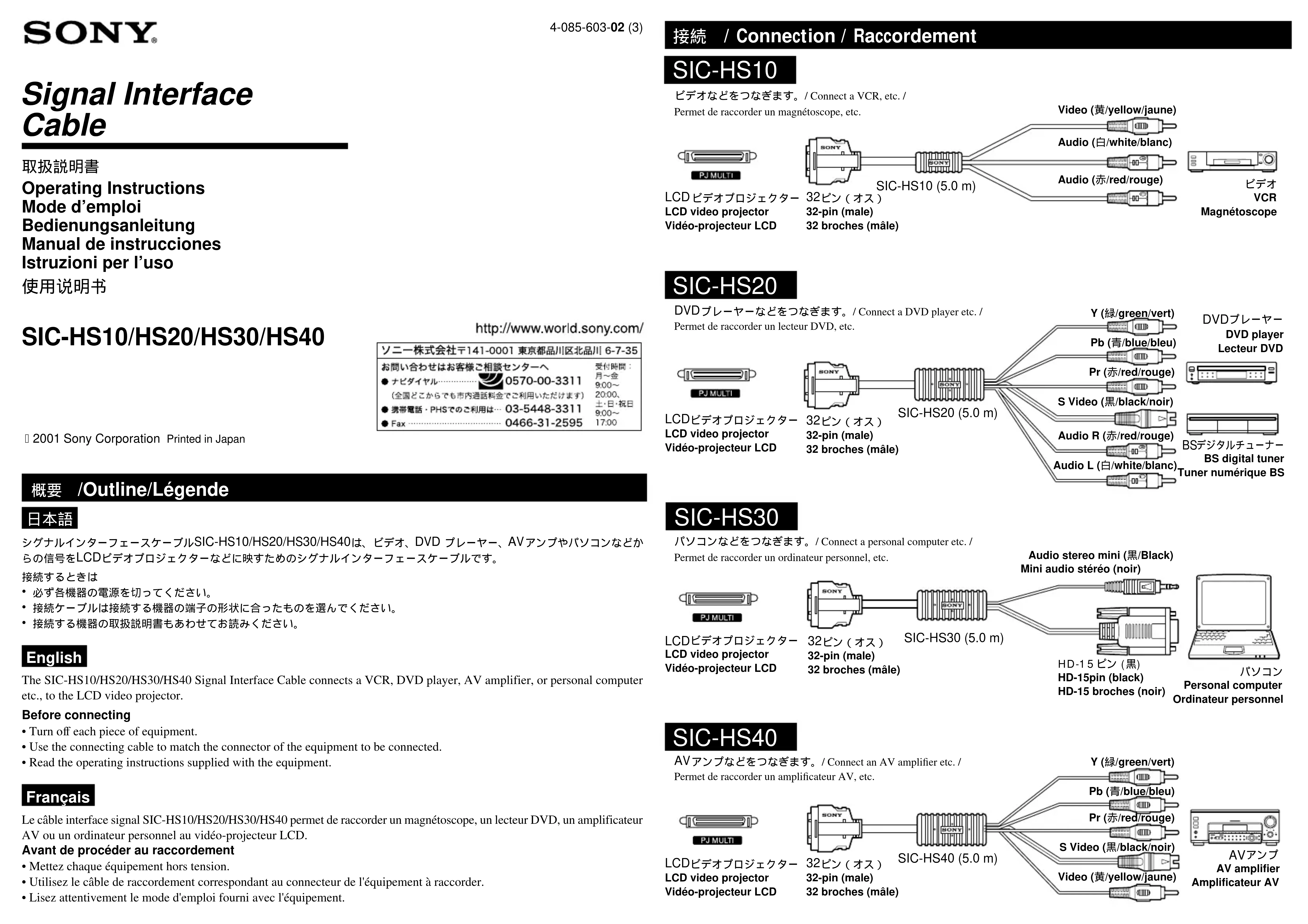 SICHS40 - Câble audio/vidéo SONY - Notice d'utilisation et mode d'emploi gratuit