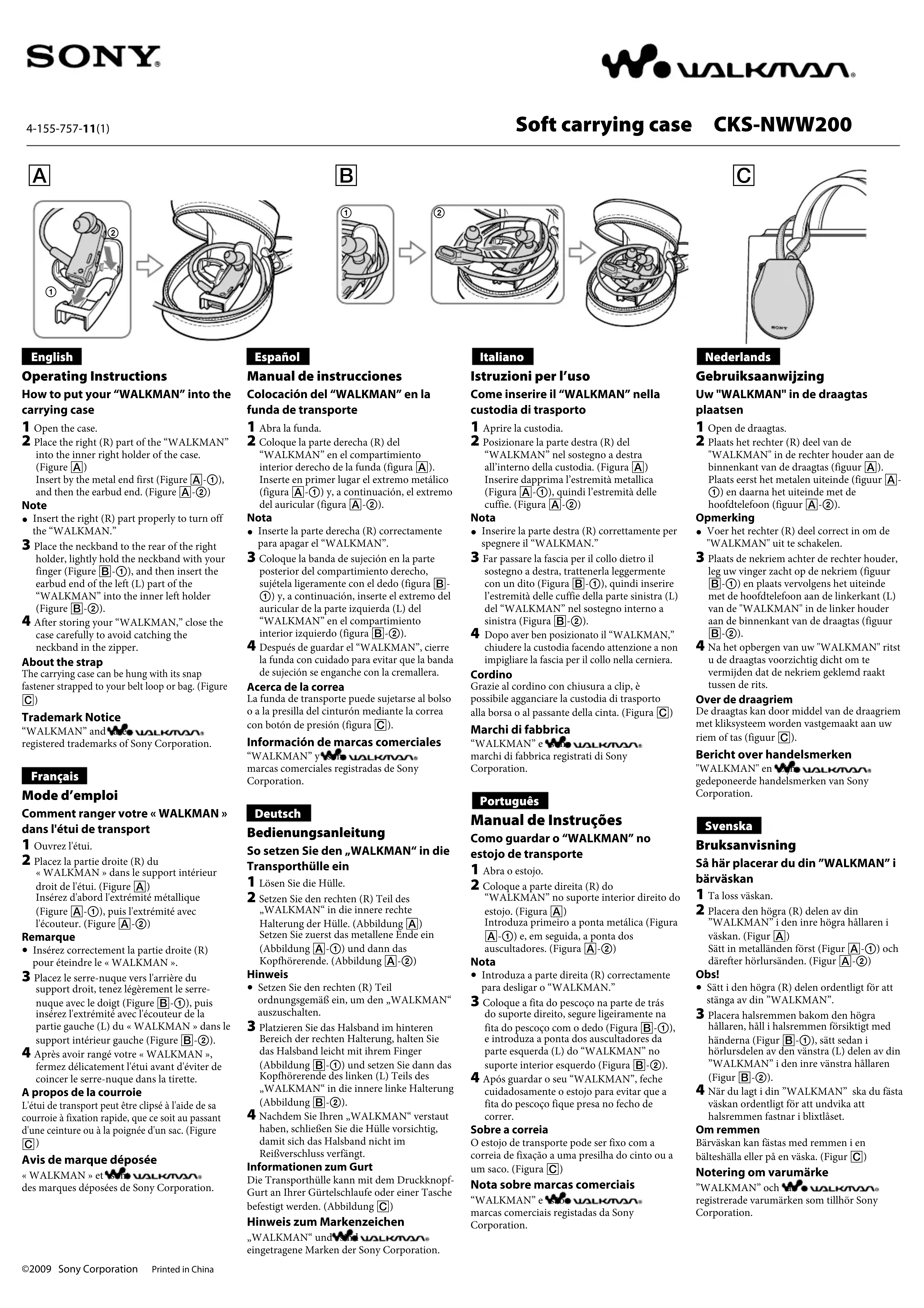 Insert the right (R) part properly to turn off the “WALKMAN.” 3 Place the neckband to the rear of the right holder, lightly hold the neckband with your finger (Figure -), and then insert the earbud end of the left (L) part of the “WALKMAN” into the inner left holder (Figure -). 4 After storing your “WALKMAN,” close the case carefully to avoid catching the neckband in the zipper.About the strapThe carrying case can be hung with its snap fastener strapped to your belt loop or bag. (Figure )Trademark Notice“WALKMAN” and are registered trademarks of Sony Corporation.Français Mode d’emploi Comment ranger votre « WALKMAN » dans l'étui de transport 1 Ouvrez l'étui. 2 Placez la partie droite (R) du « WALKMAN » dans le support intérieur droit de l'étui. (Figure )Insérez d'abord l'extrémité métallique (Figure -), puis l'extrémité avec l'écouteur. (Figure -)Remarque Insérez correctement la partie droite (R) pour éteindre le « WALKMAN ». 3 Placez le serre-nuque vers l'arrière du support droit, tenez légèrement le serre-nuque avec le doigt (Figure -), puis insérez l'extrémité avec l'écouteur de la partie gauche (L) du « WALKMAN » dans le support intérieur gauche (Figure -). 4 Après avoir rangé votre « WALKMAN », fermez délicatement l'étui avant d'éviter de coincer le serre-nuque dans la tirette.A propos de la courroieL'étui de transport peut être clipsé à l'aide de sa courroie à fixation rapide, que ce soit au passant d'une ceinture ou à la poignée d'un sac. (Figure