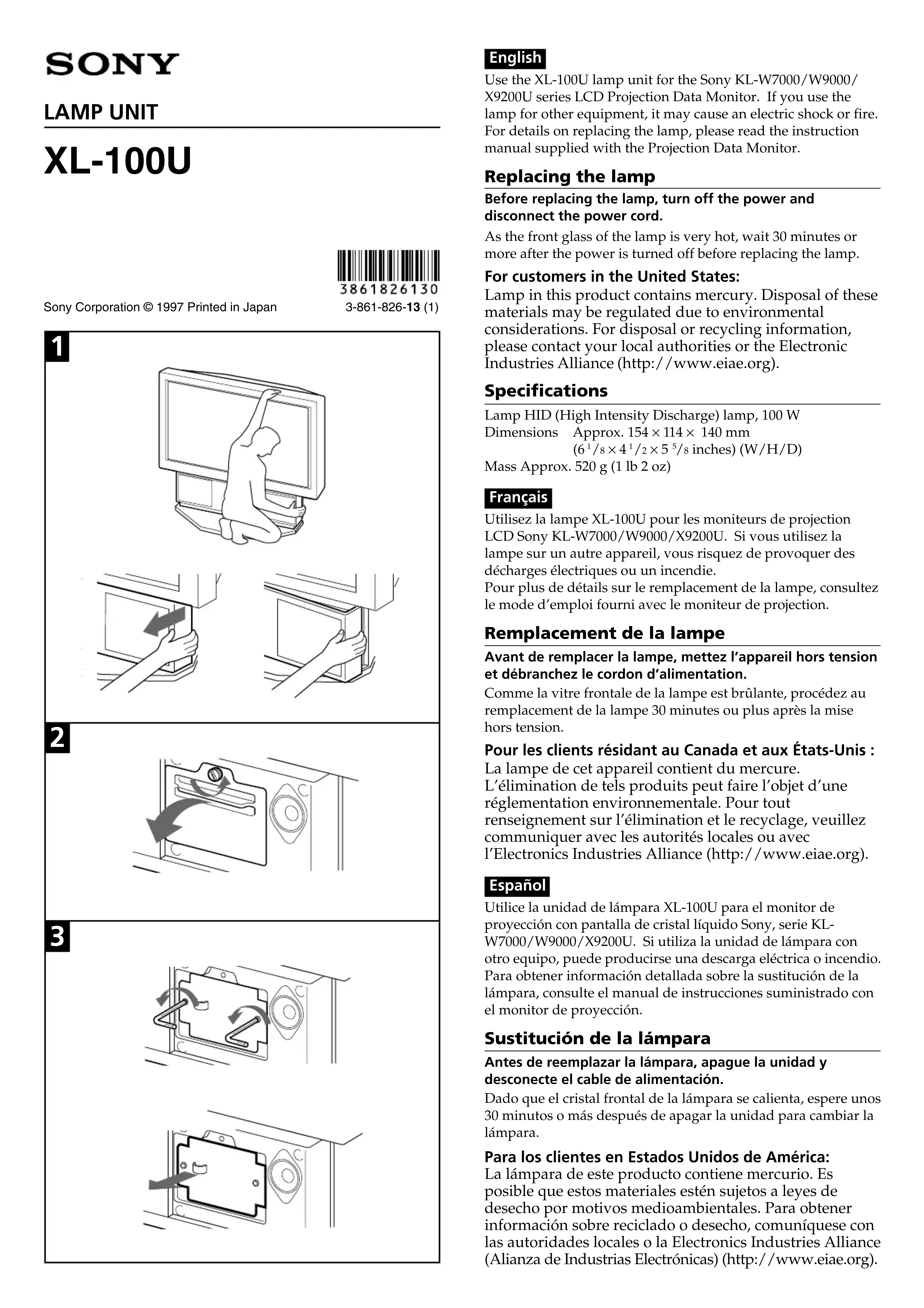 Utilisez la lampe XL-100U pour les moniteurs de projection LCD Sony KL-W7000/W9000/X9200U. Si vous utilisez la lampe sur un autre appareil, vous risquez de provoquer des décharges électriques ou un incendie.
