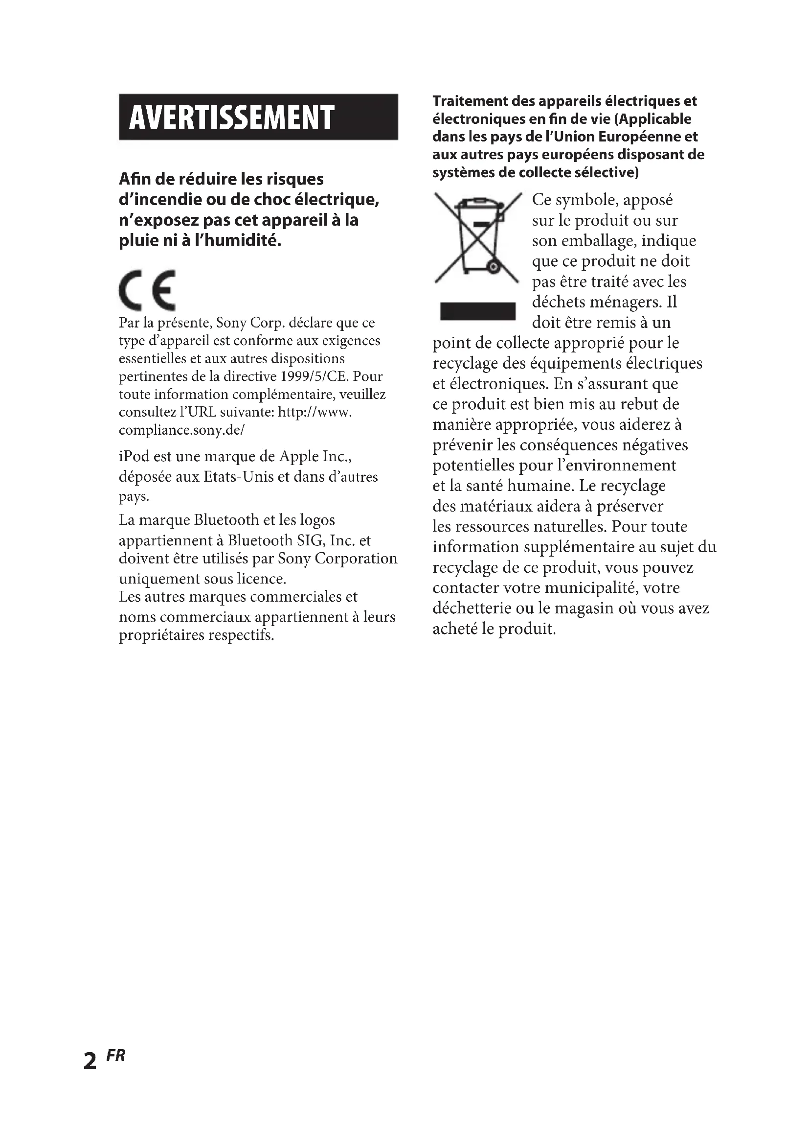 TMR-BT8iP [GB,FR,DE,ES] 3-279-360-12(1) TMR-BT8iP [GB,FR,DE,ES] 3-279-360-12(1) AVERTISSEMENT An de réduire les risques d’incendie ou de choc électrique, n’exposez pas cet appareil à la pluie ni à l’humidité. Par la présente, Sony Corp. déclare que ce type d’appareil est conforme aux exigences essentielles et aux autres dispositions pertinentes de la directive 1999/5/CE. Pour toute information complémentaire, veuillez consultez l’URL suivante: http://www.compliance.sony.de/ iPod est une marque de Apple Inc., déposée aux Etats-Unis et dans d’autres pays. La marque Bluetooth et les logos appartiennent à Bluetooth SIG, Inc. et doivent être utilisés par Sony Corporation uniquement sous licence. Les autres marques commerciales et noms commerciaux appartiennent à leurs propriétaires respectifs. Traitement des appareils électriques et électroniques en n de vie (Applicable dans les pays de l’Union Européenne et aux autres pays européens disposant de systèmes de collecte sélective) Ce symbole, apposé sur le produit ou sur son emballage, indique que ce produit ne doit pas être traité avec les déchets ménagers. Il doit être remis à un point de collecte approprié pour le recyclage des équipements électriques et électroniques. En s’assurant que ce produit est bien mis au rebut de manière appropriée, vous aiderez à prévenir les conséquences négatives potentielles pour l’environnement et la santé humaine. Le recyclage des matériaux aidera à préserver les ressources naturelles. Pour toute information supplémentaire au sujet du recyclage de ce produit, vous pouvez contacter votre municipalité, votre déchetterie ou le magasin où vous avez acheté le produit.TMR-BT8iP [GB,FR,DE,ES] 3-279-360-12(1)